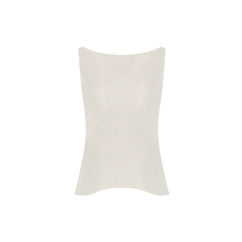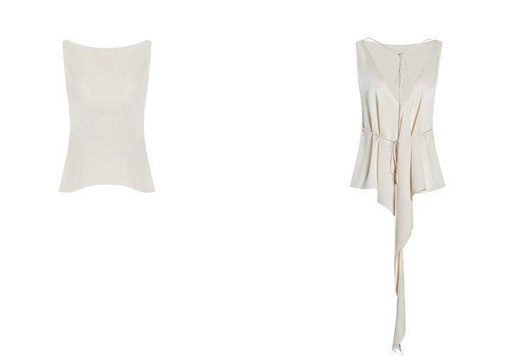 M Essential Artful Agility Irregular Streamer Top in Mixed Materials & Pleated Bony Structured Skirt This sophisticated two-piece ensemble combines contemporary design with refined craftsmanship. The sleeveless top features mixed materials and irregular streamer detailing, creating dynamic visual interest and movement. The coordinating flare skirt showcases pleated construction with structured boning, delivering a polished silhouette that transitions seamlessly from day to evening.