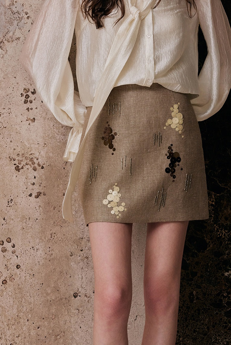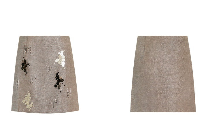 This three-piece ensemble combines sophisticated tailoring with resort-ready elegance. The linen vest provides structured support and timeless versatility, while the coordinating skirt offers fluid movement and refined silhouette. The streamer chiffon shirt adds ethereal dimension, enhanced by intricate heavy nail beading that catches light beautifully. Perfect for elevated casual occasions, destination events, or anyone seeking a polished, fashion-forward look that transitions seamlessly from day to evening wear.