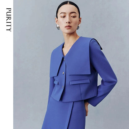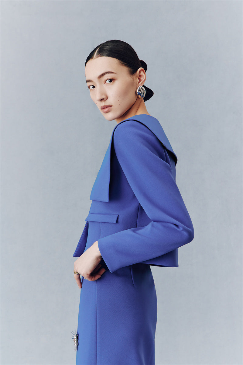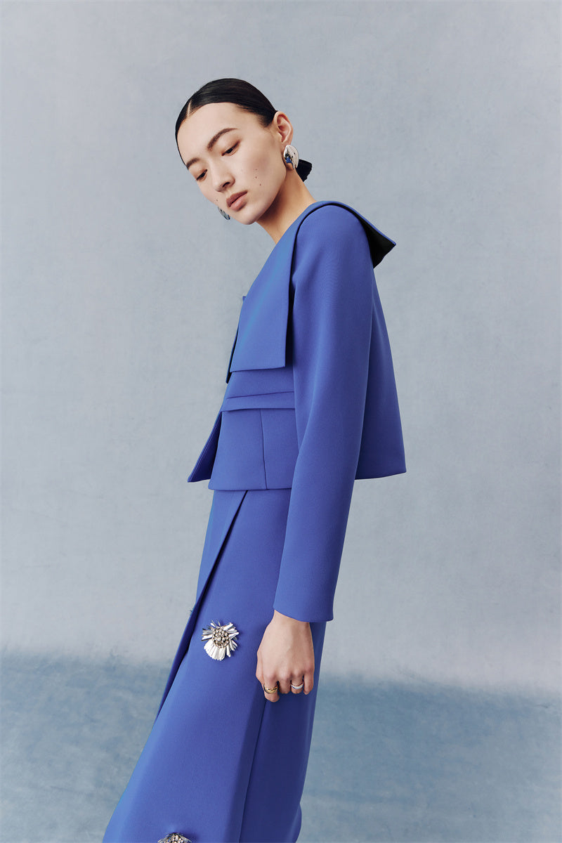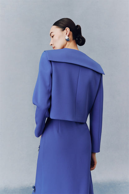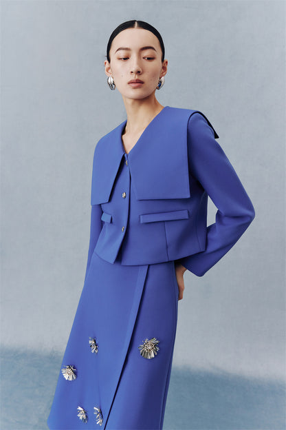 Introducing the PURITY Sapphire blue preppy short coat floral beaded skirt suit set, the perfect blend of chic, classy, and fashionable. Crafted with exquisite detailing, including an elegant floral beaded skirt, this graceful suit set will surely keep you stylish and confident all fall and autumn long.