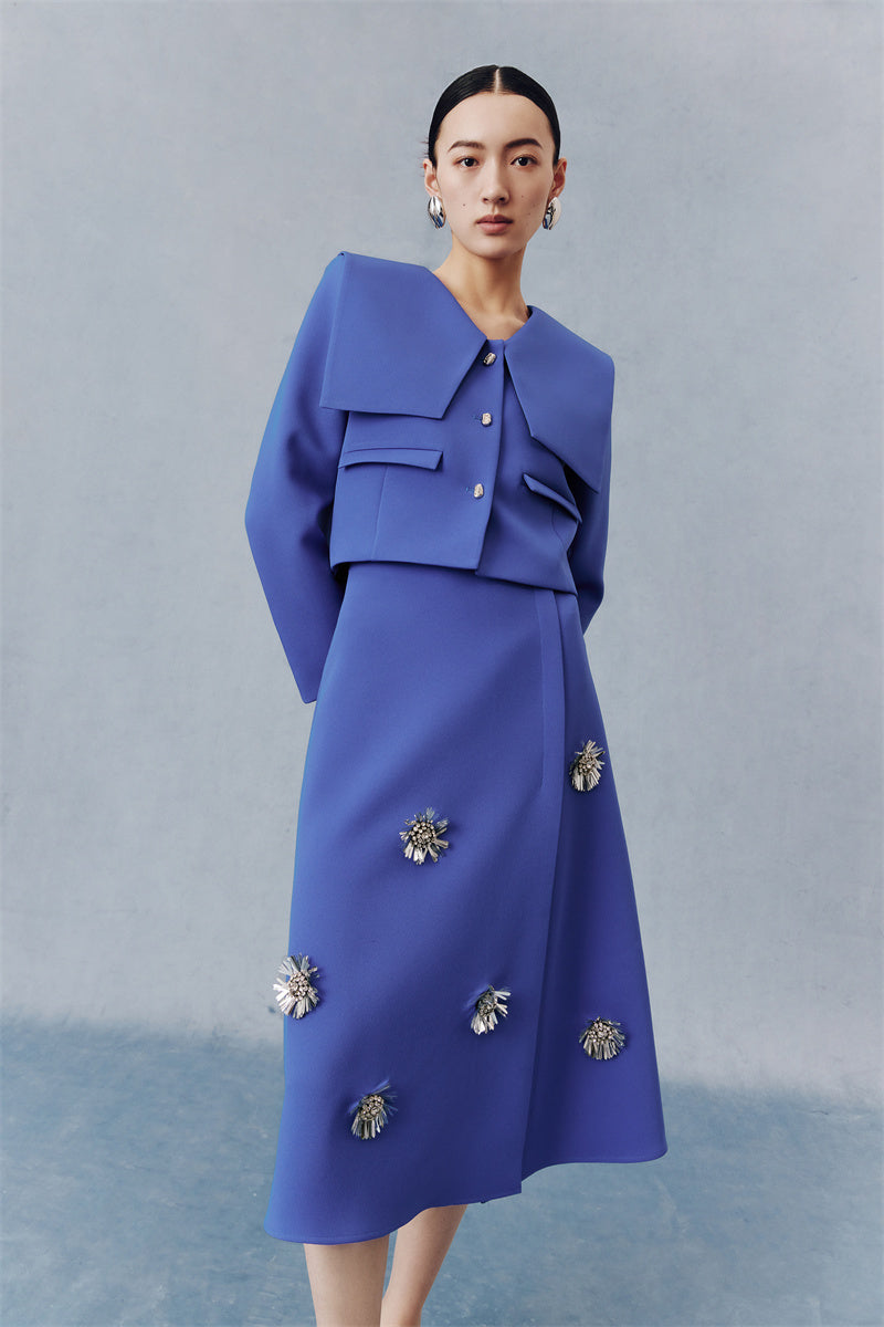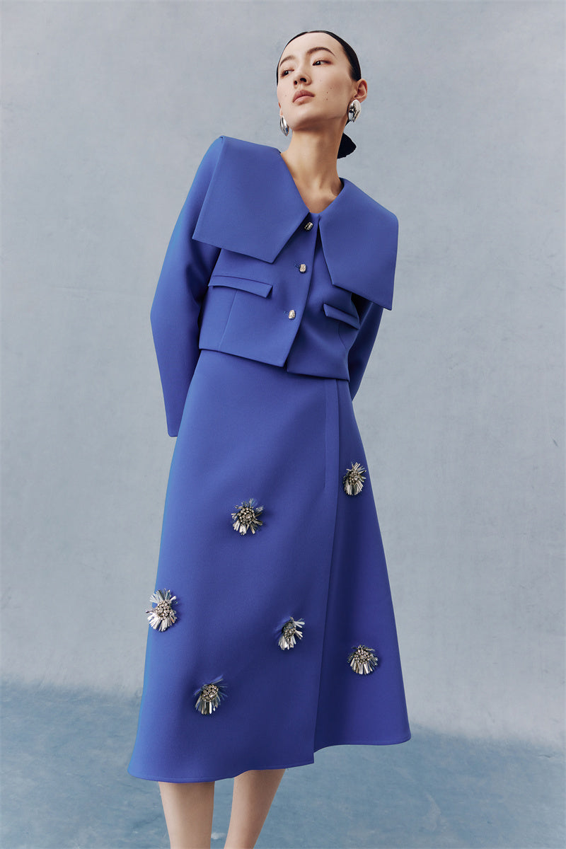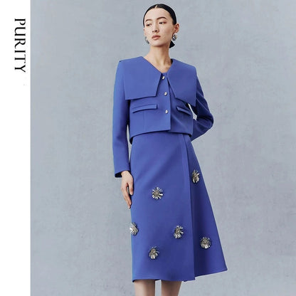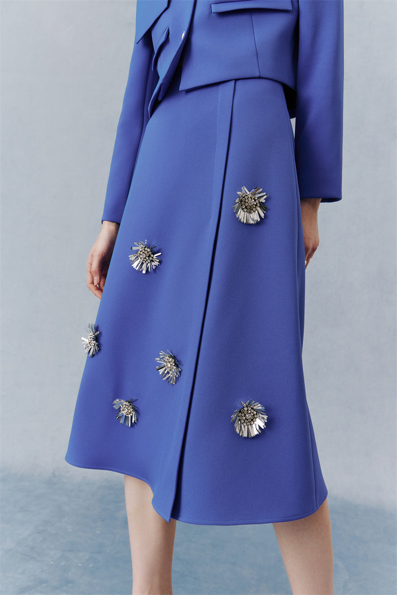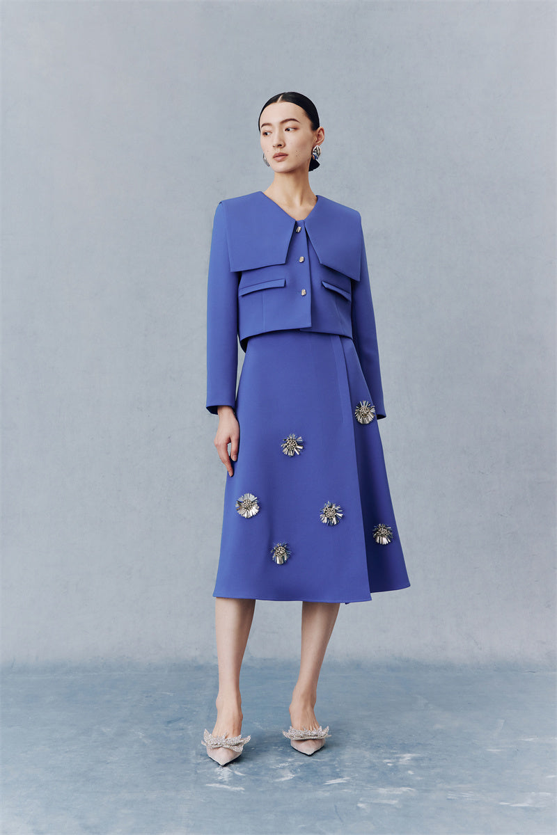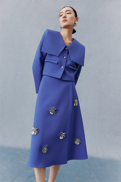 PURITY Sapphire blue preppy short coat floral beaded skirt suit set- Jen