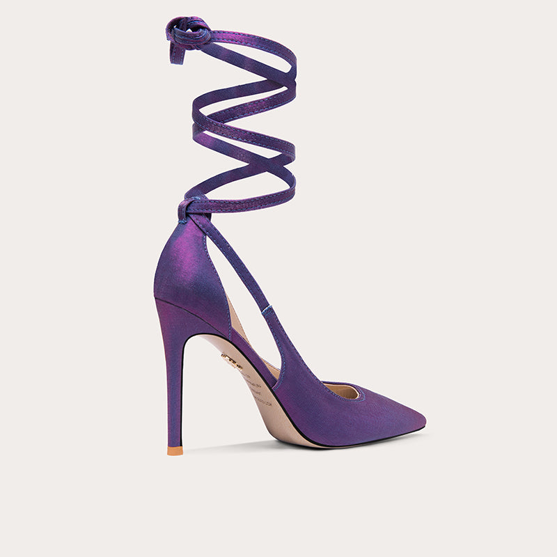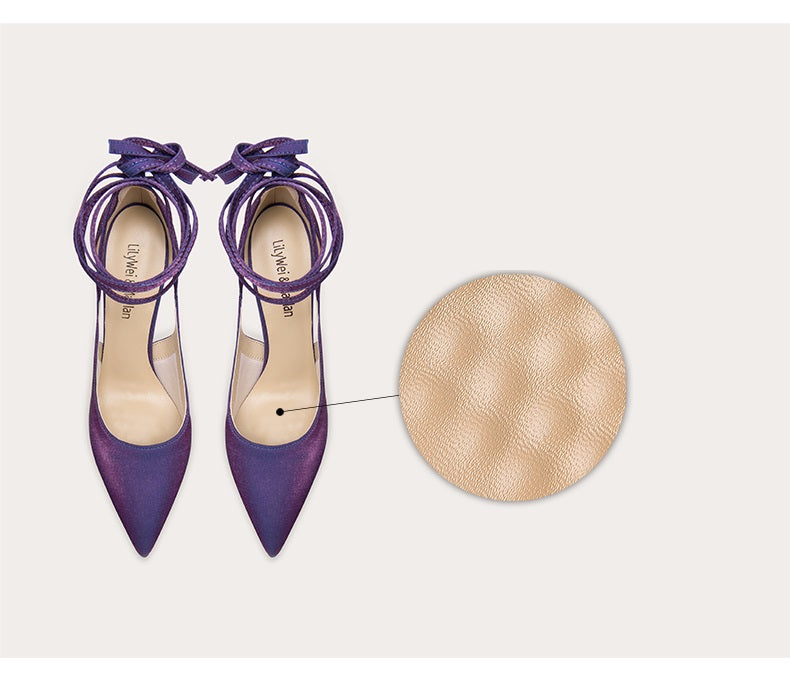 These Purple beautiful fashion sandals feature a lace-up closure, a plain pattern, and an elegant style. The ankle straps, super high heel (over 8cm), pointed toe, and formal wear appeal make these sandals an ideal choice. The heel is of a fine style and the sole is made of rubber. The inner material is sheepskin and the opening is shallow. Adhesive shoes are used to make these sandals, while the insole material is sheepskin and the style is single shoes. The help surface material is satin.