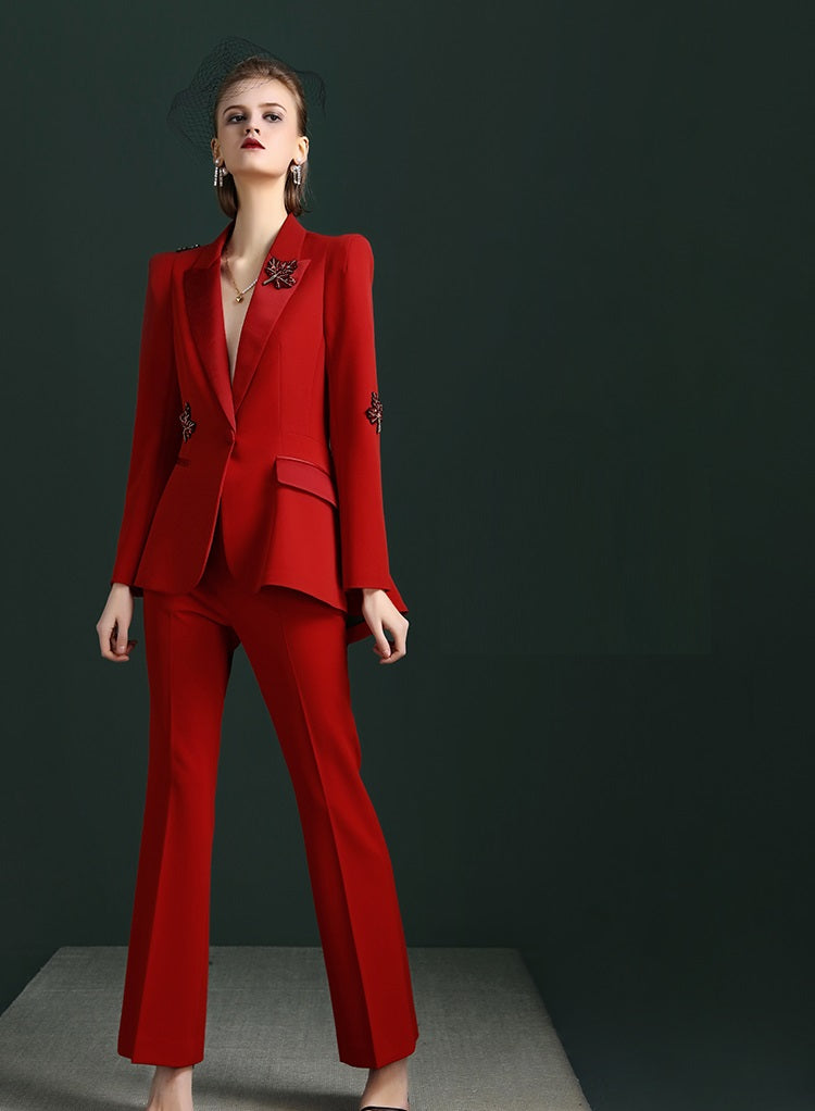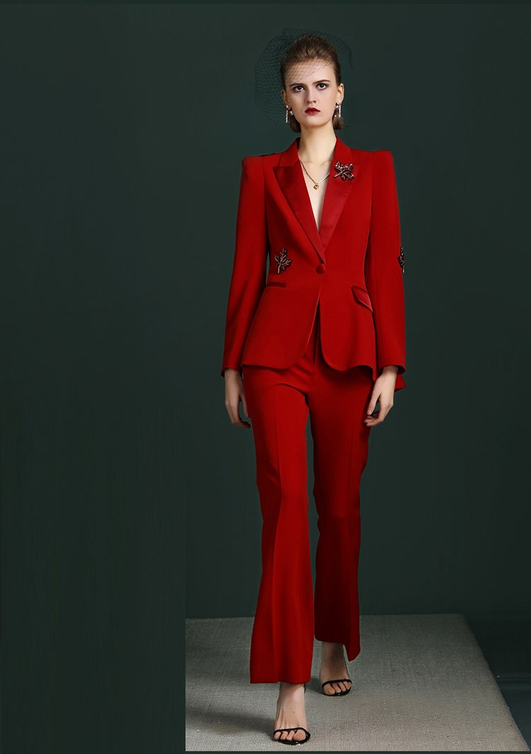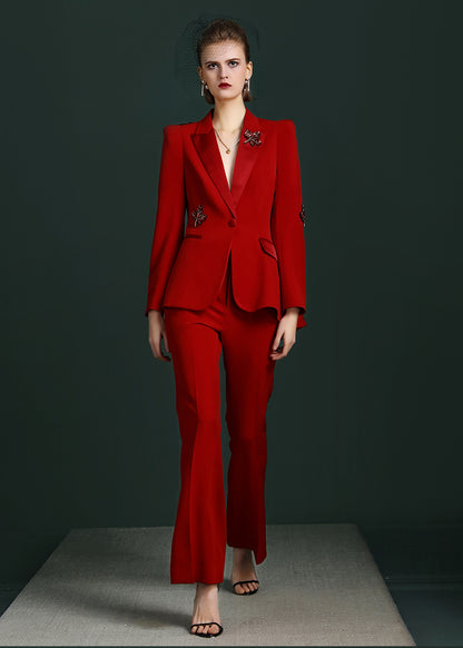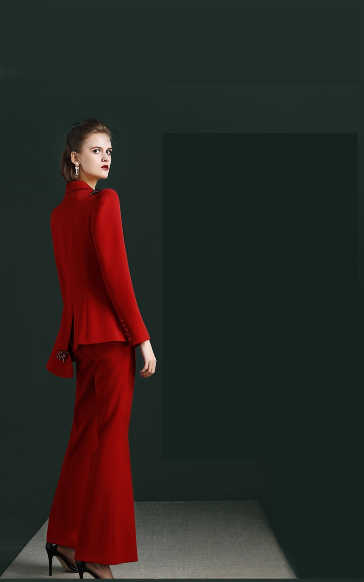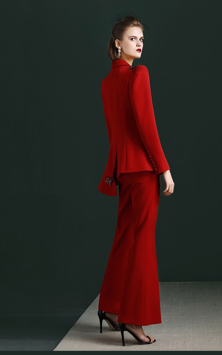 This two-piece suit set featuring red trousers of high quality boasts a suit collar and one-button clothes placket, crafted for the Spring 2023 season with long sleeves and button detailing.