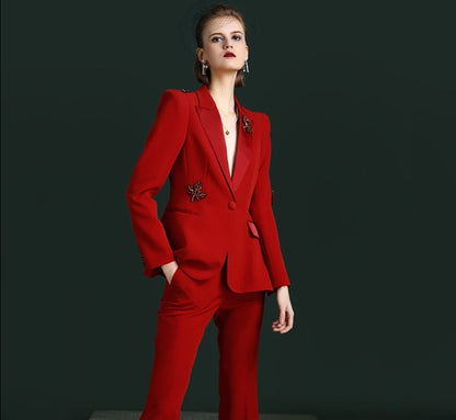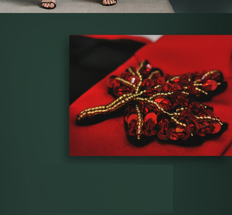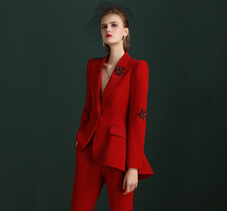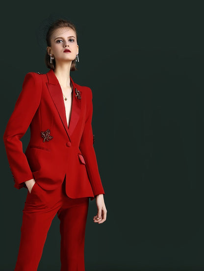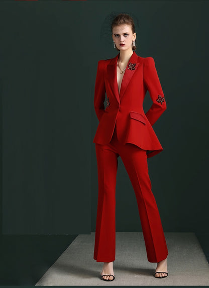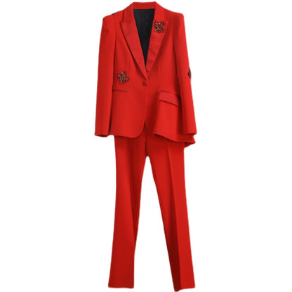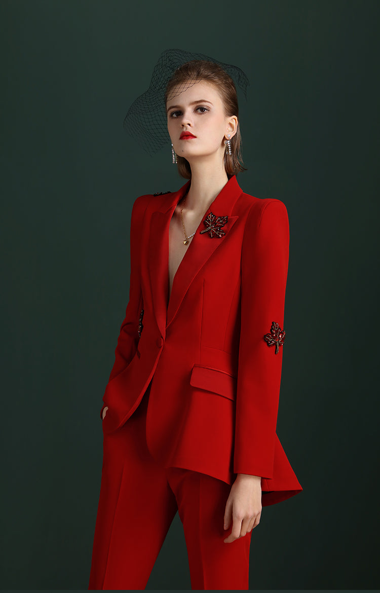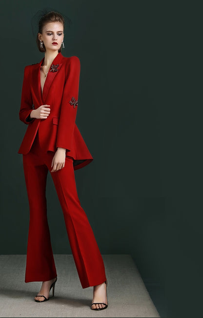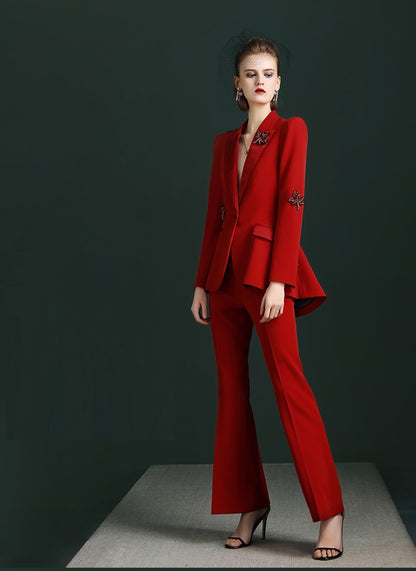 This two-piece suit set featuring red trousers of high quality boasts a suit collar and one-button clothes placket, crafted for the Spring 2023 season with long sleeves and button detailing.