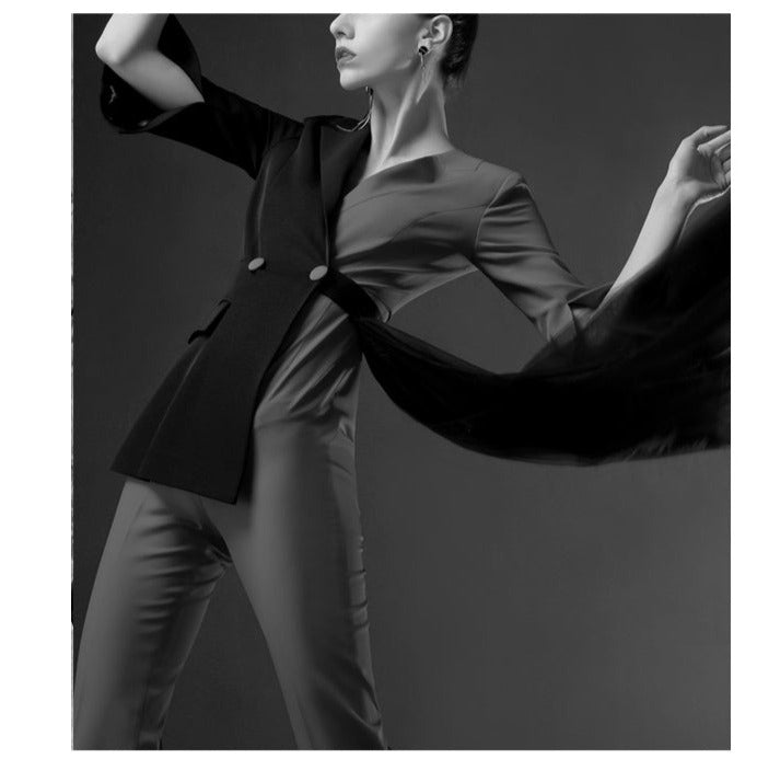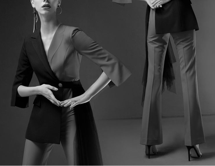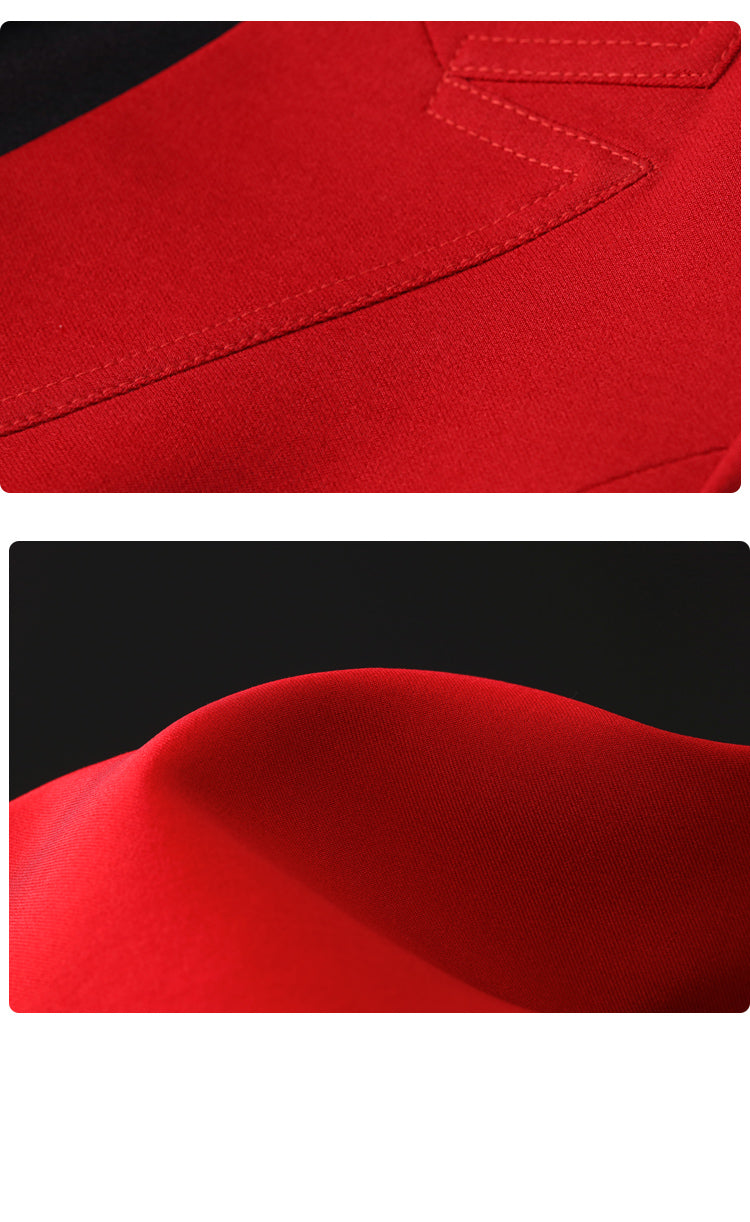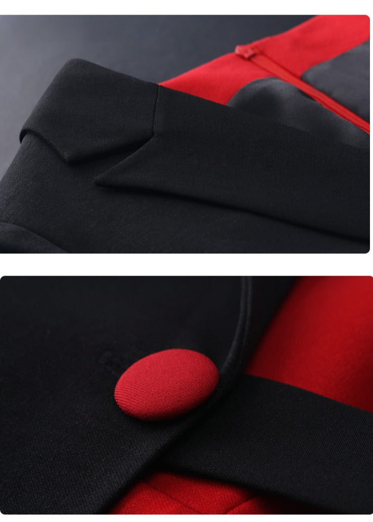 Color classification: Red trousers stitching jumpsuits, black pants stitching jumpsuits, red pants stitching suits, black pants stitching suits