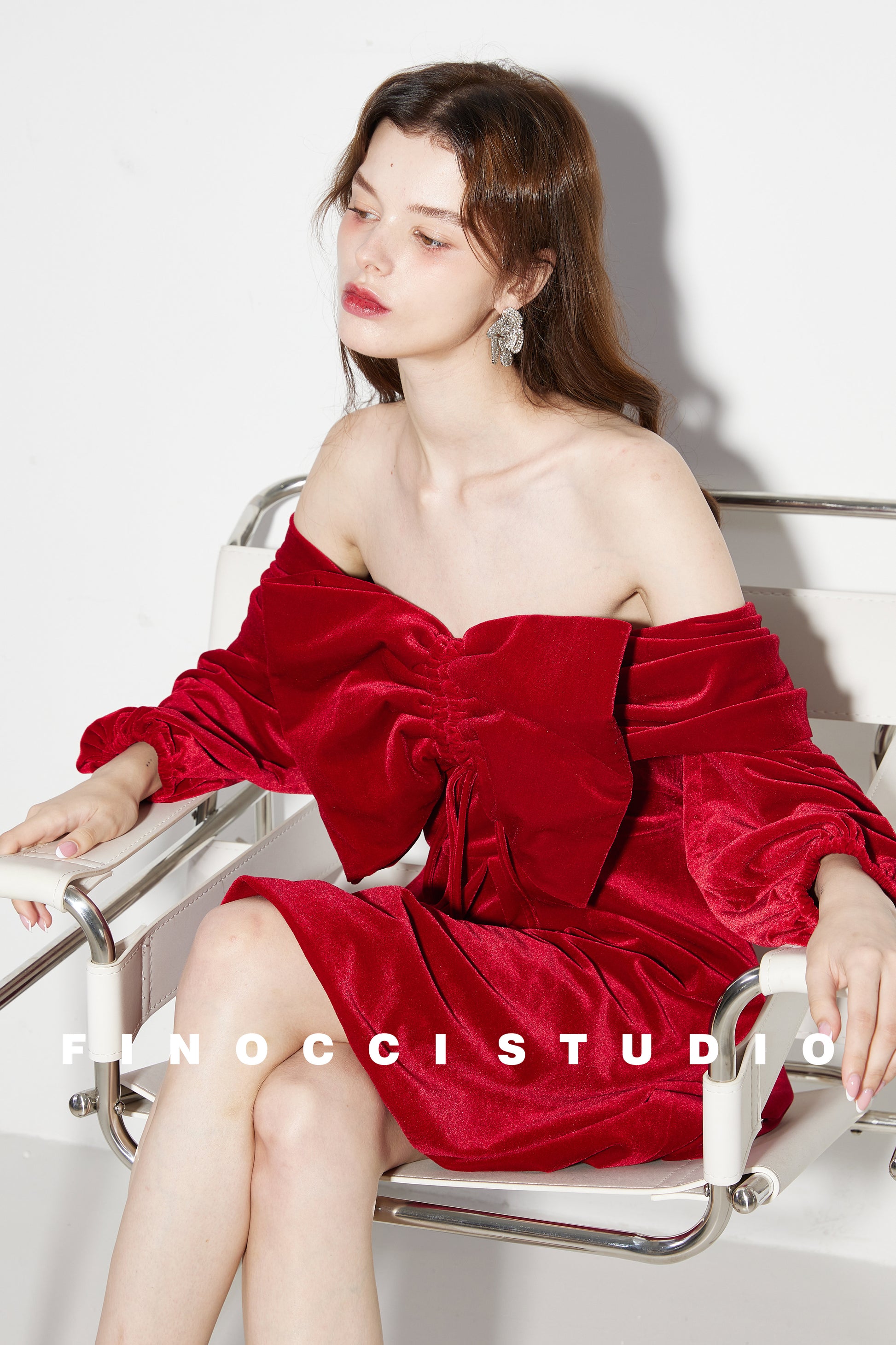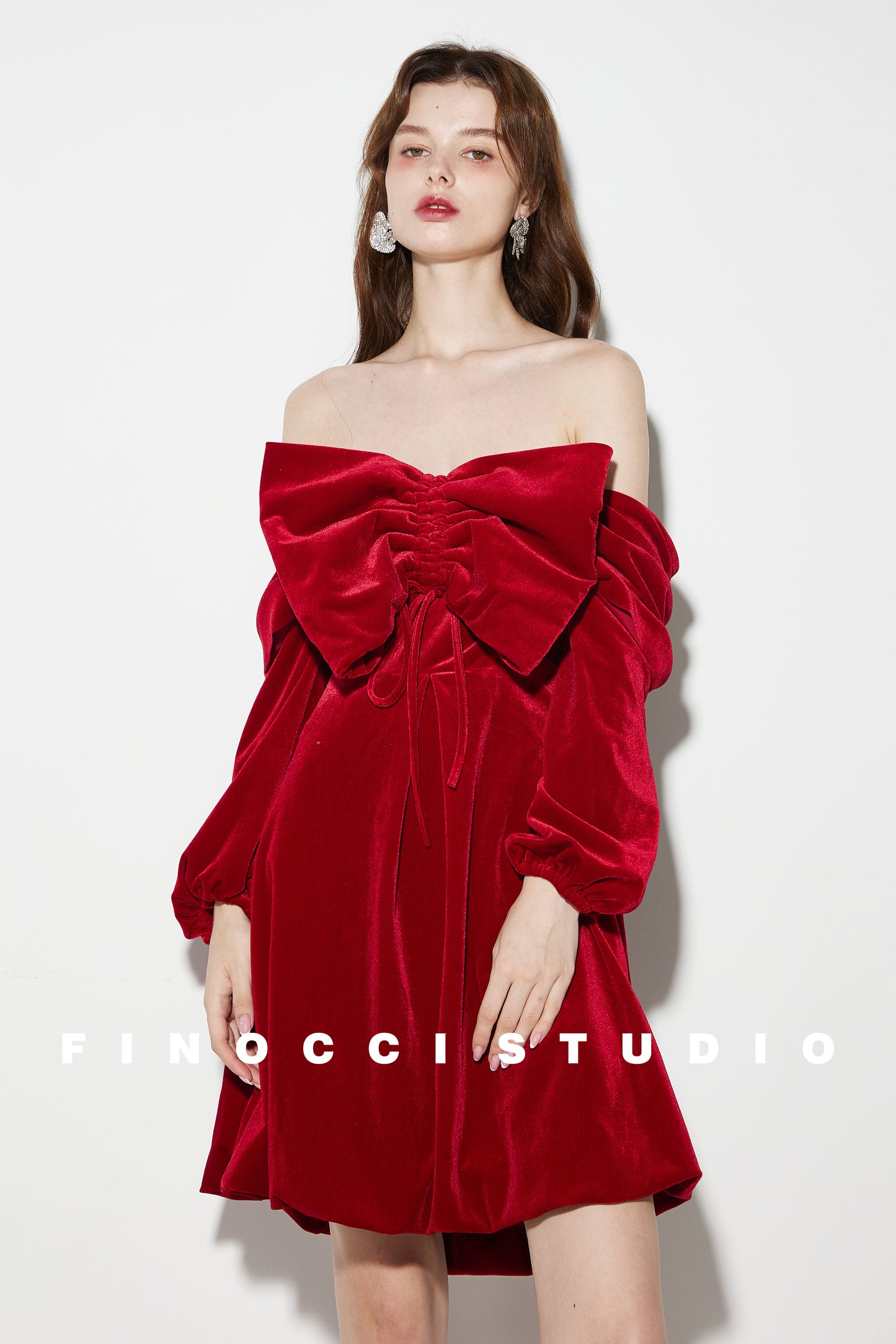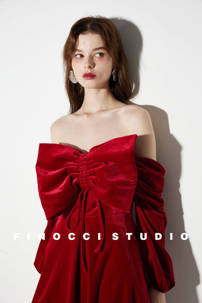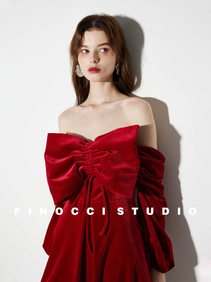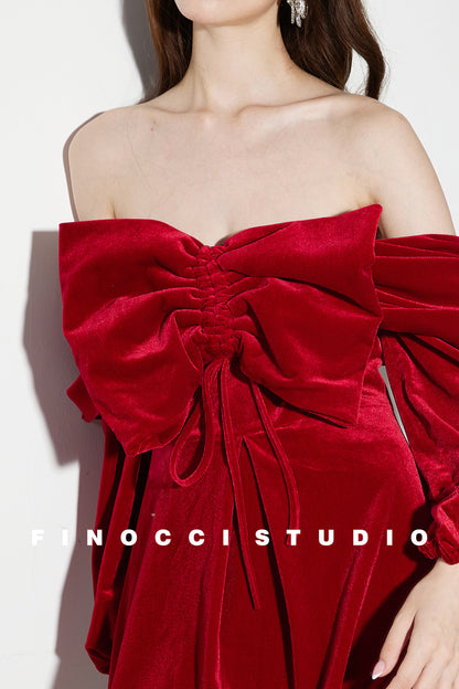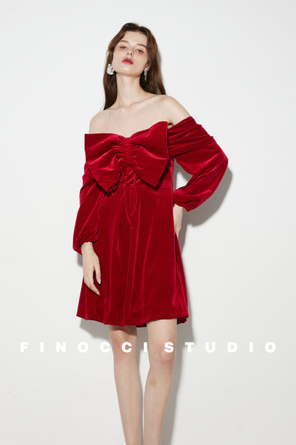 Red Velvet large Bow Off Shoulder Short holiday party Dress - Macy
