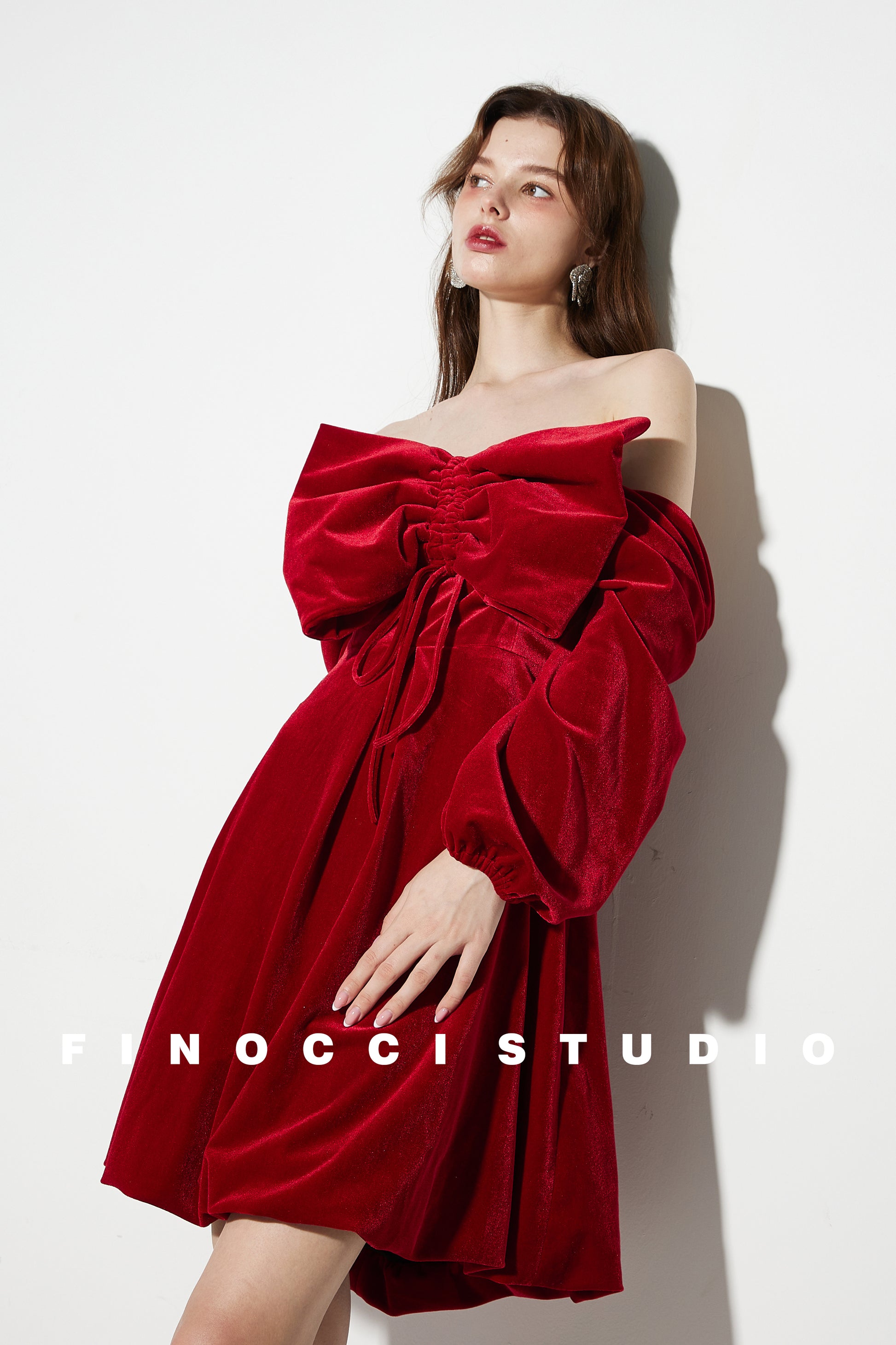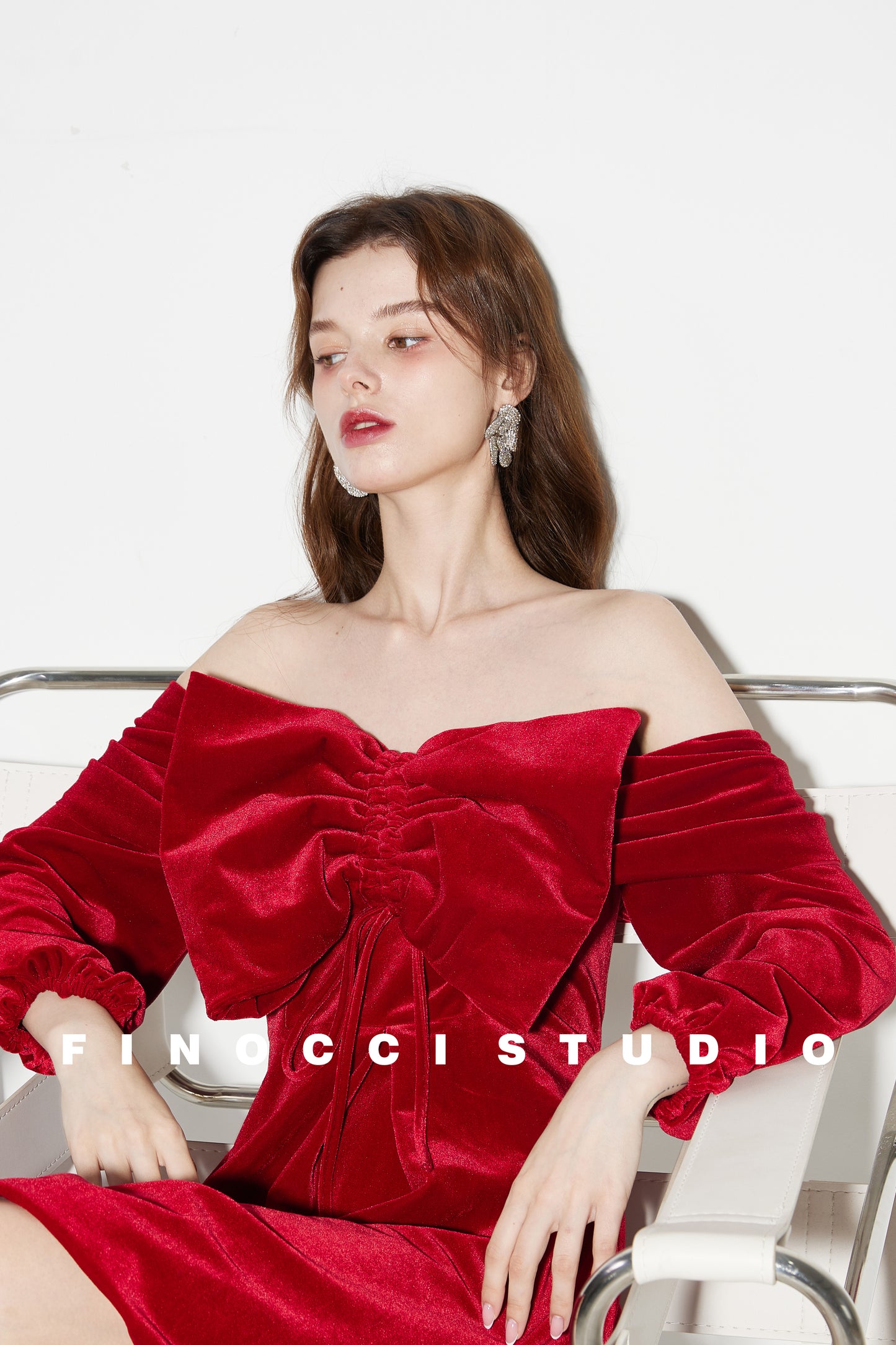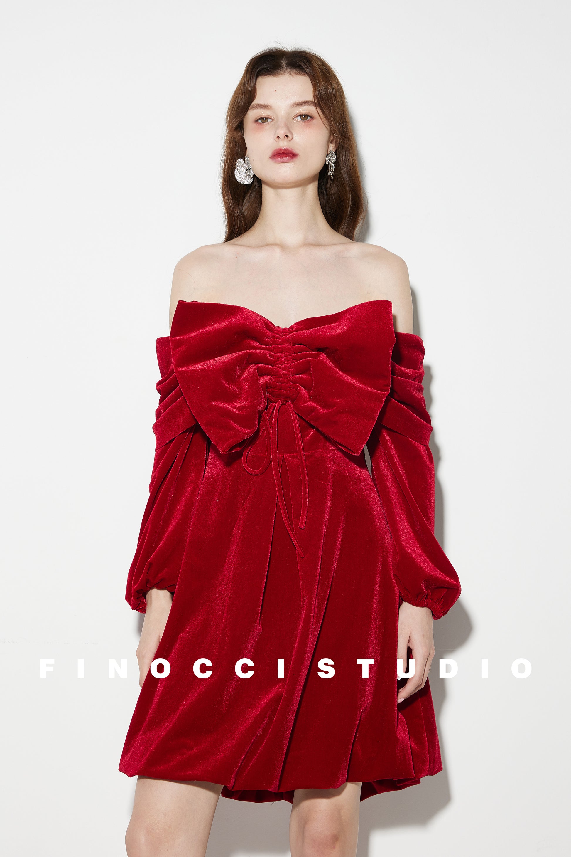 Red Velvet large Bow Off Shoulder Short holiday party Dress - Macy