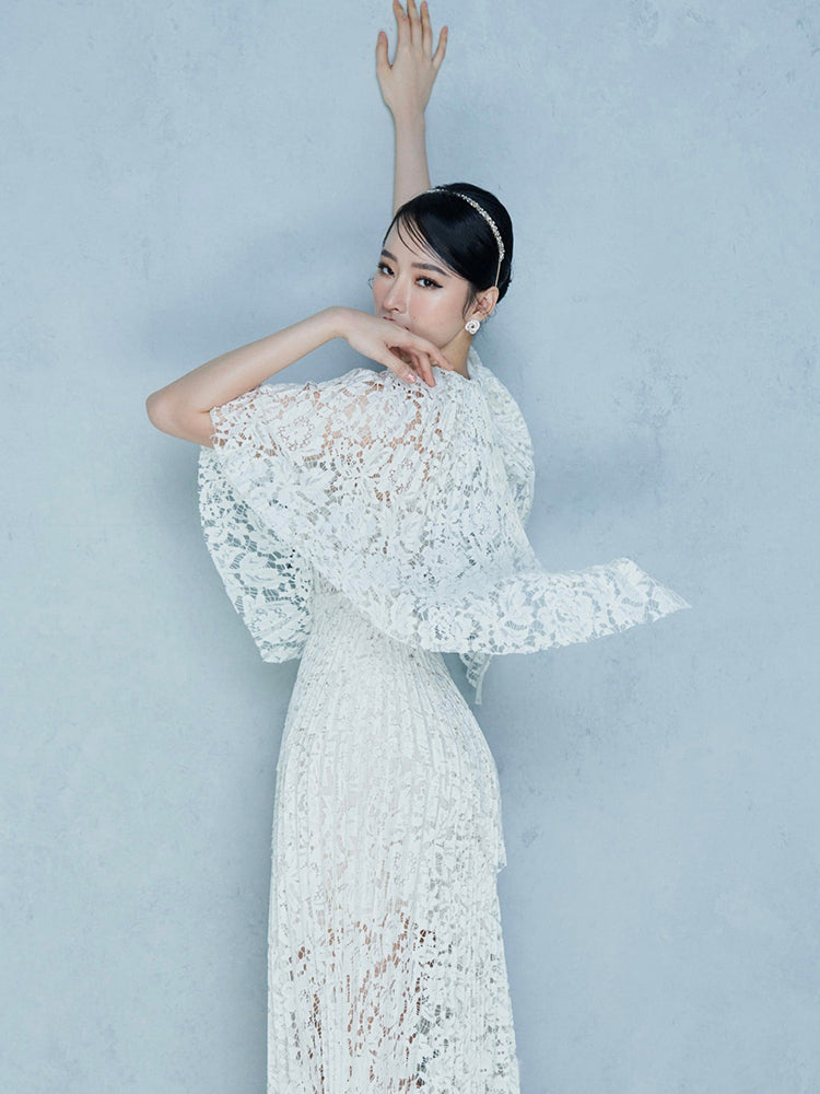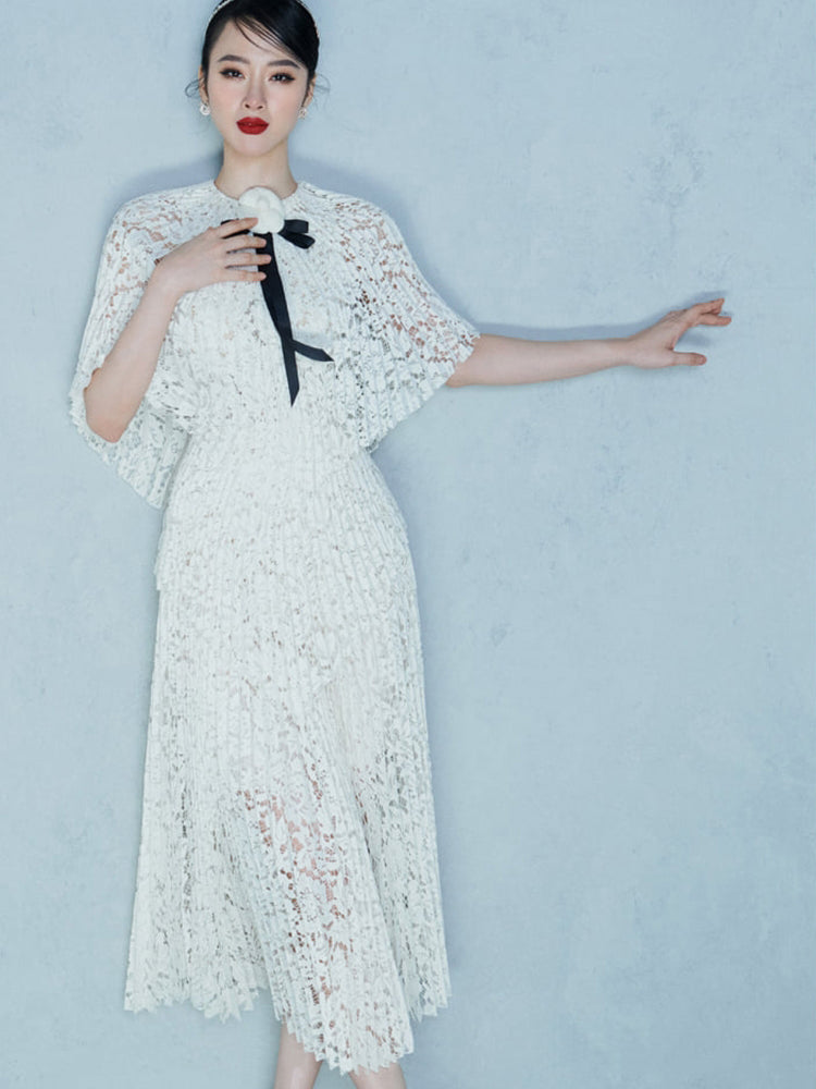 Retro vintage lace cape shawl collar pleated midi lace dress - Tiuna