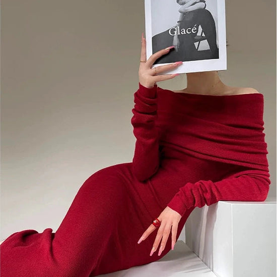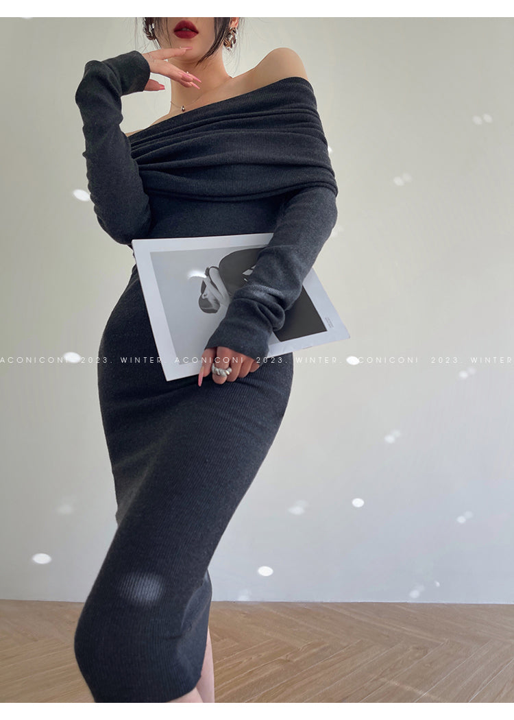 French shoulder body con knit off shoulder fall winter dress - Smoky Rose