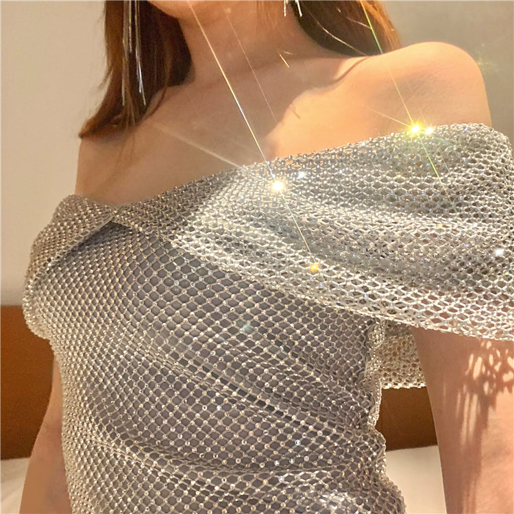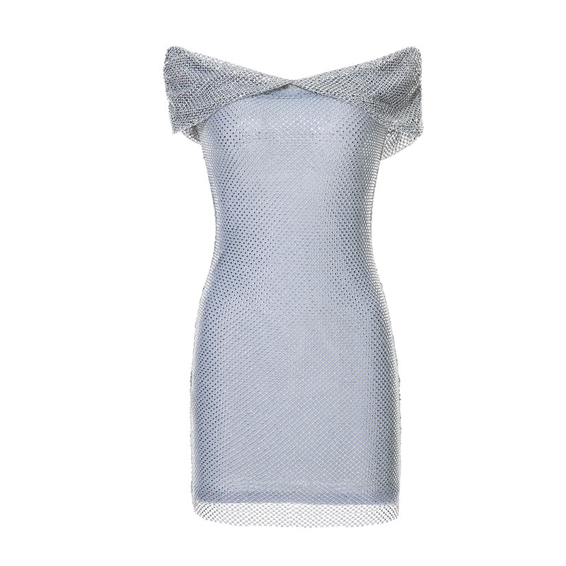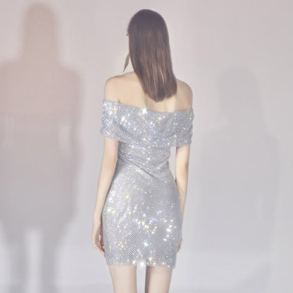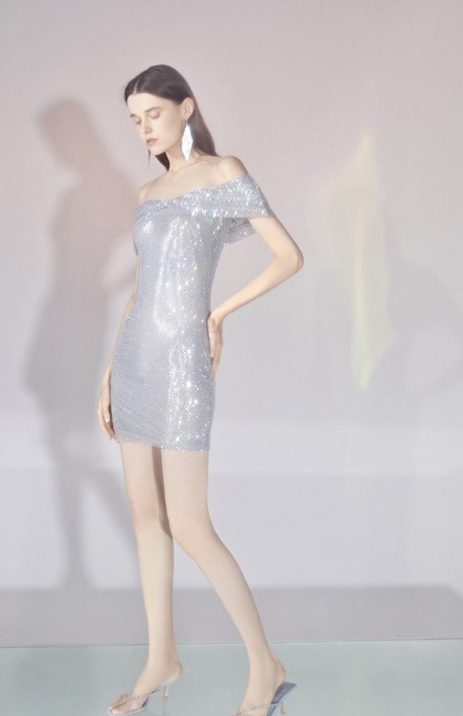 Spot Wardrobes by Chen Elegant Off Shoulder Glitter mini party Dress-Diamond