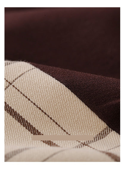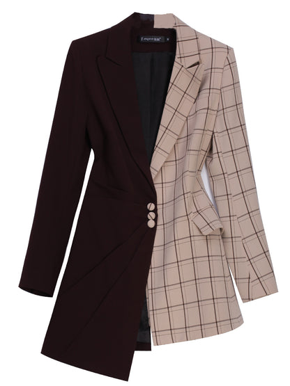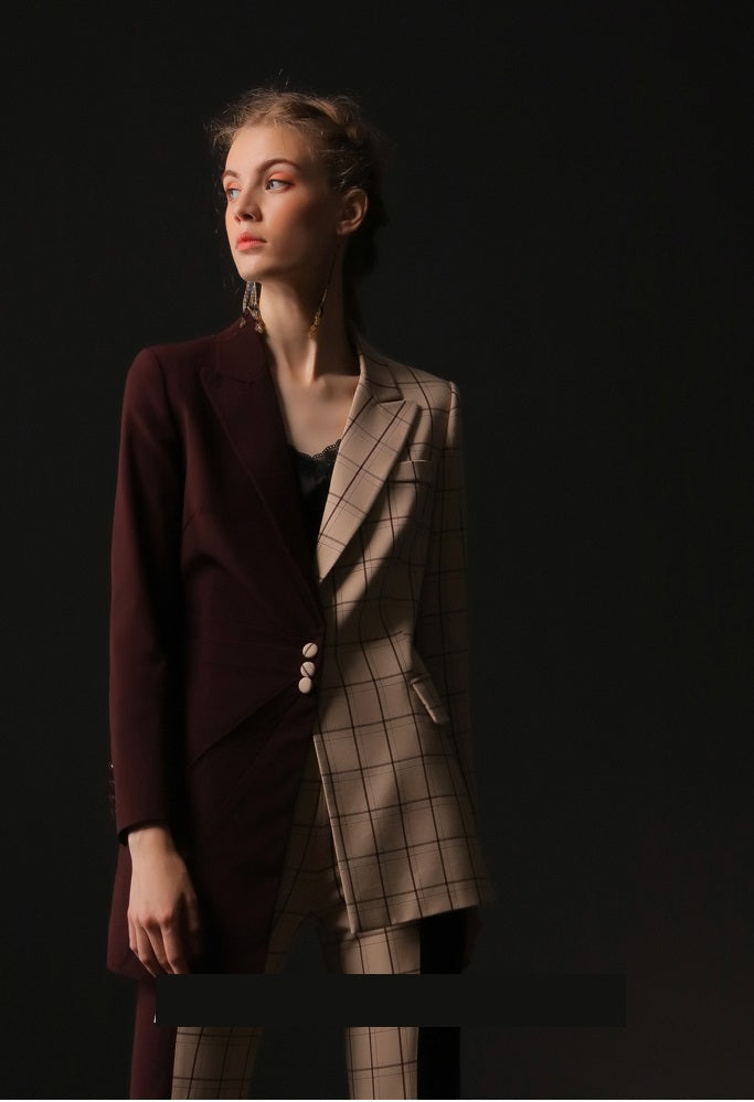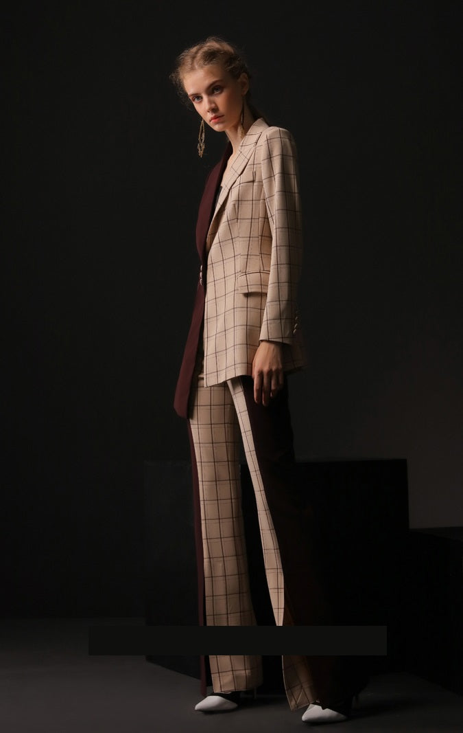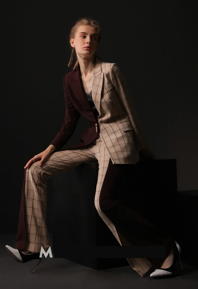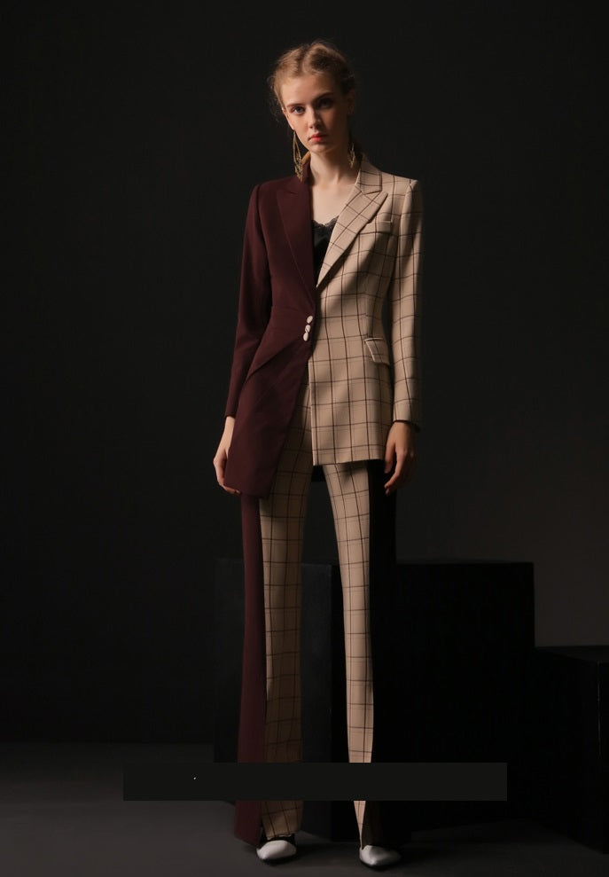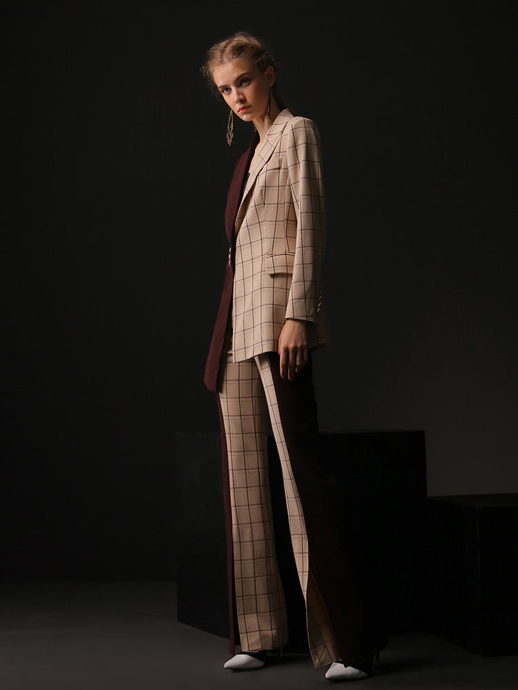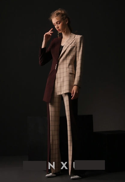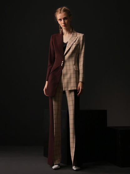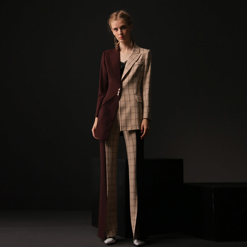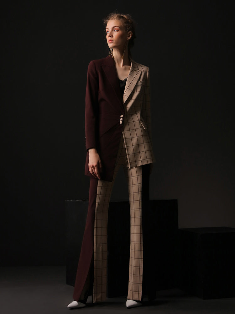 The Spring and Summer Color Contrast Evening Trousers Suit features a suit collar, single-breasted closure, and a golden brown hue. It is designed for the Spring 2023 season with a long sleeve and slim fit silhouette, featuring asymmetric styling accents.