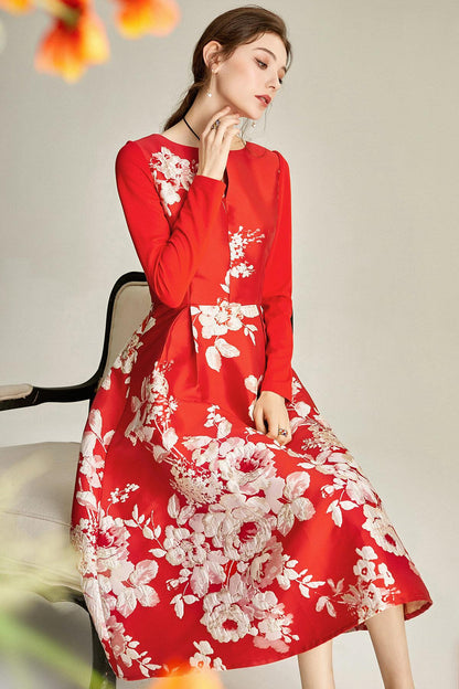 Spring retro 1950 red feminine jacquard long sleeve wedding guest audrey hepburn dress - Bailey