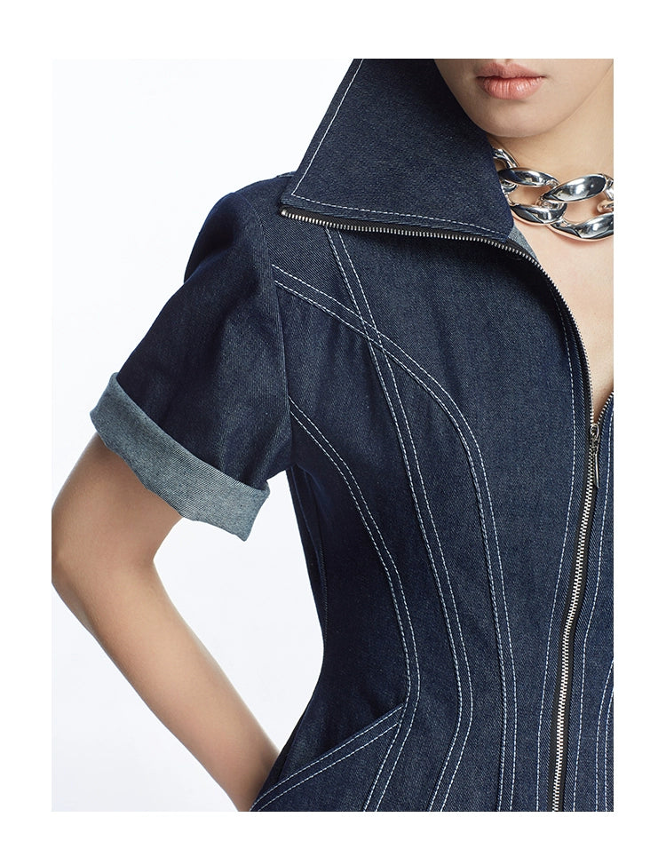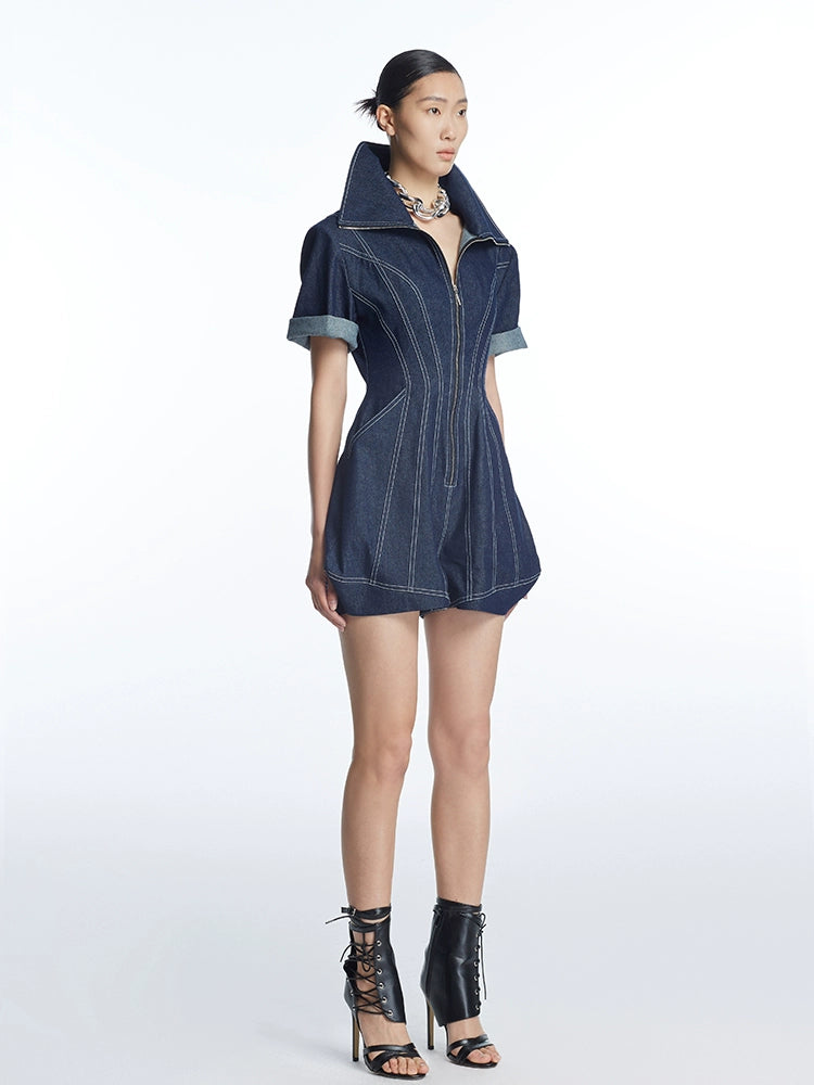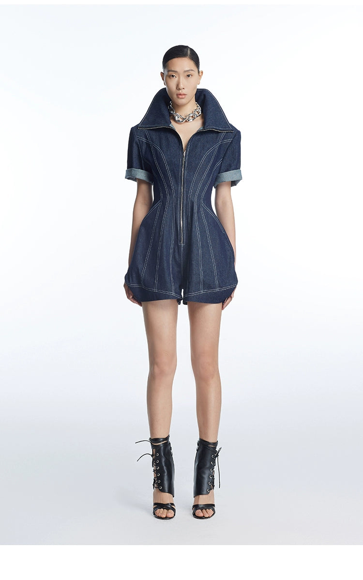 Structured lapel highend tailored denim romper jumpsuit - Mioef