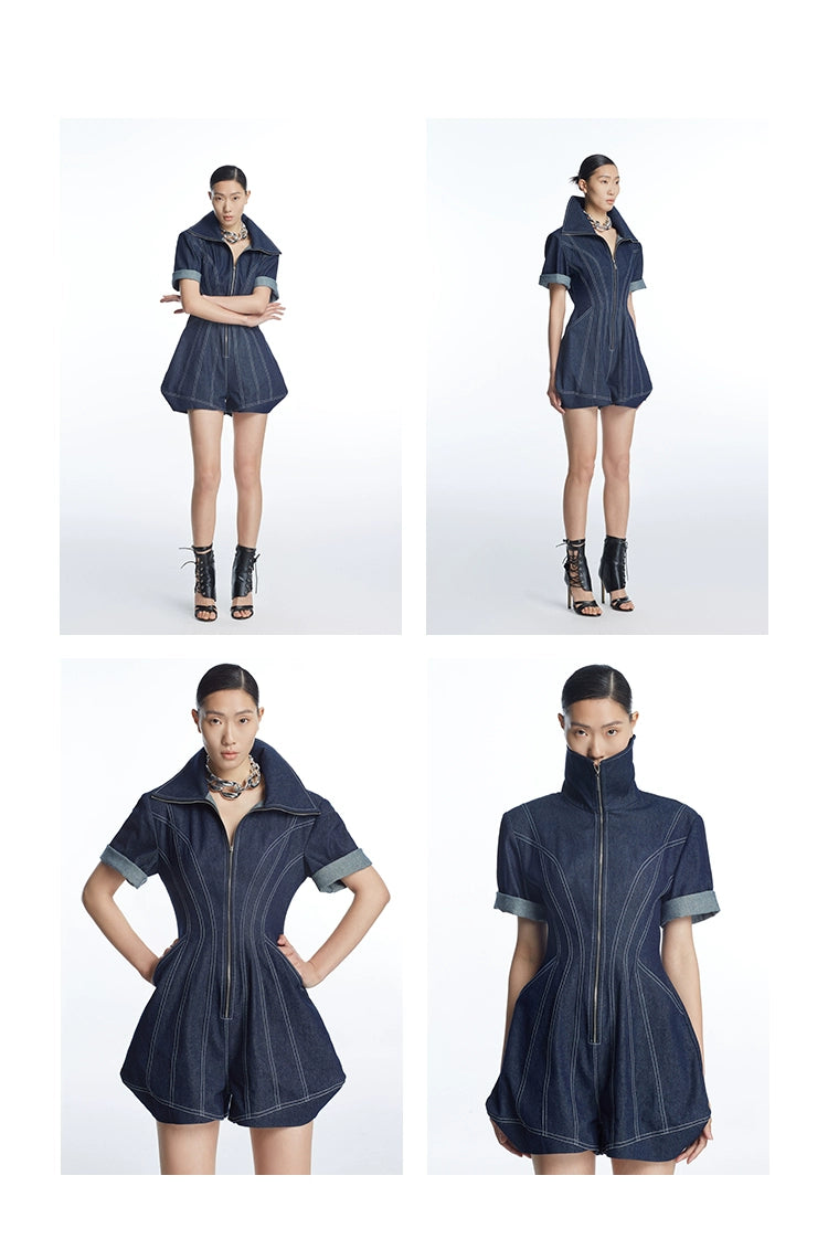 Reach new heights in fashion wearing the Mioef tailored denim romper jumpsuit. Featuring unique, high-end design with structured denim and pockets, this must-have piece is sure to become a statement-making addition to your wardrobe. Take the plunge and show off your daring style!