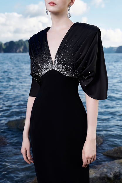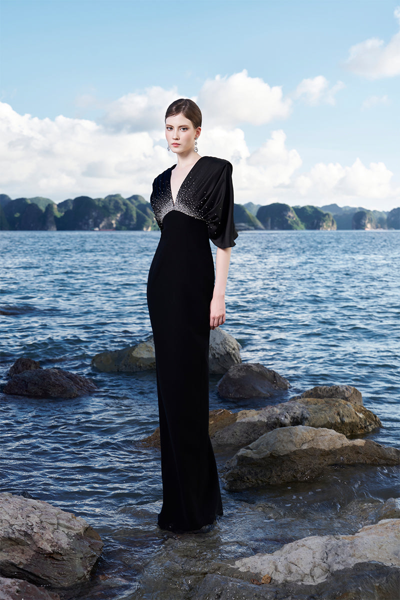 Indulge in pure luxury with Tracy Studio's Tilda dress. Its short flared sleeves and deep V-neck exude elegance, while the gathered chest and crystal-embellished detailing add a touch of sophistication. The fitted hip and straight skirt form, crafted from velvet satin, ensure a stunning silhouette.