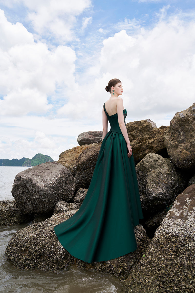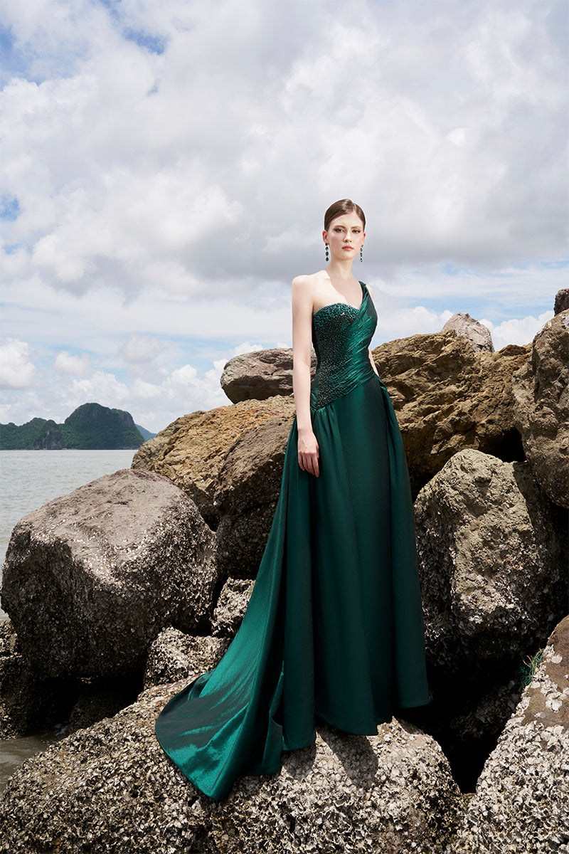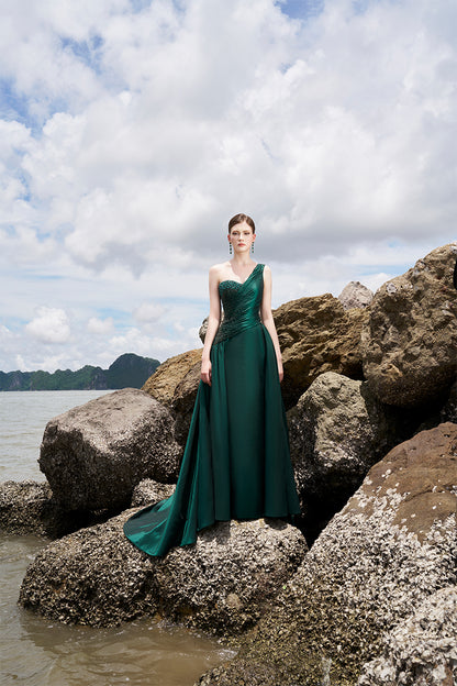 Tracy Studio luxury elegant One Side Crystal Embellished One Shoulder Green Evening Dress - Toria