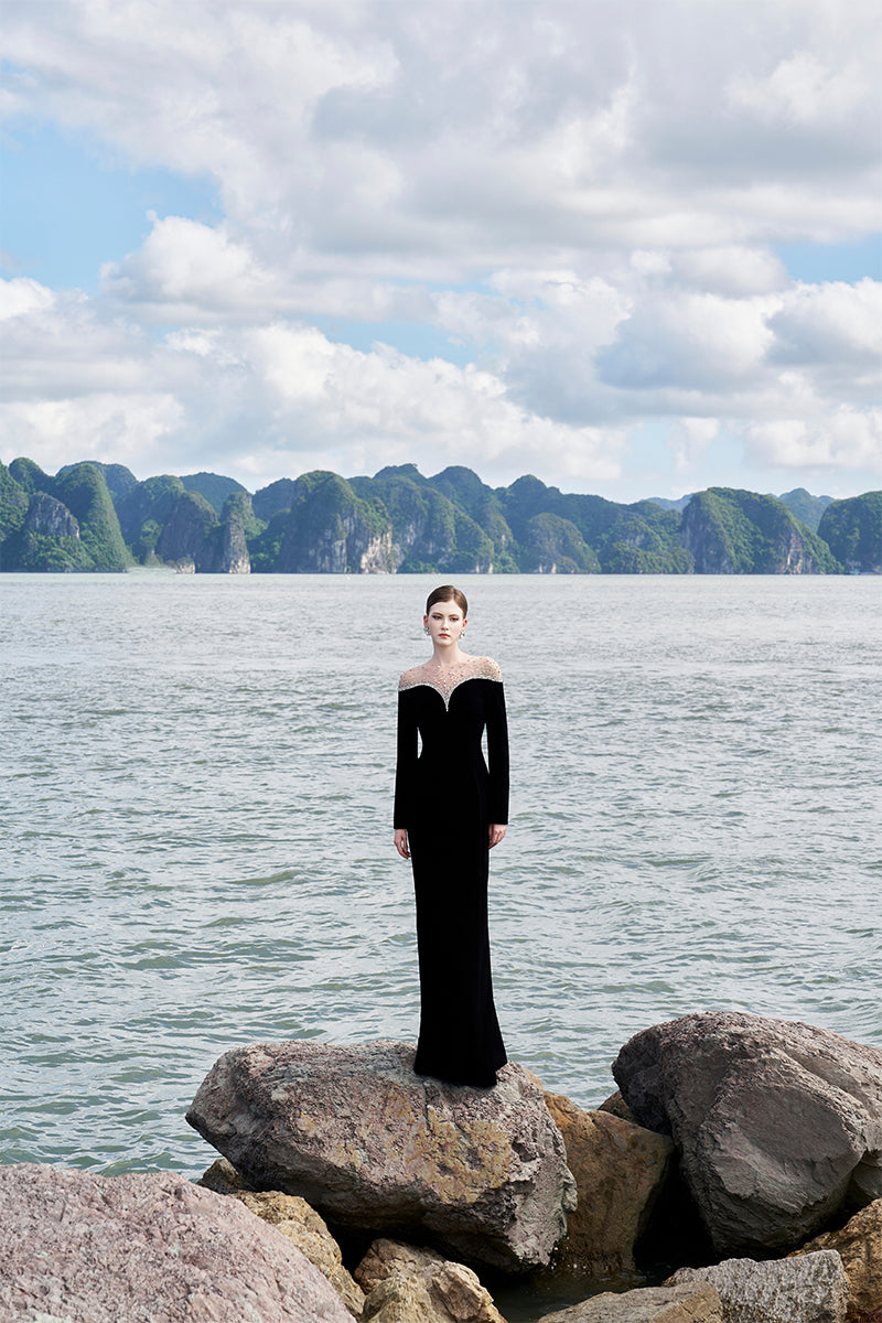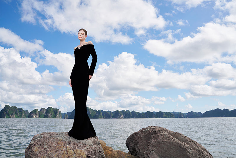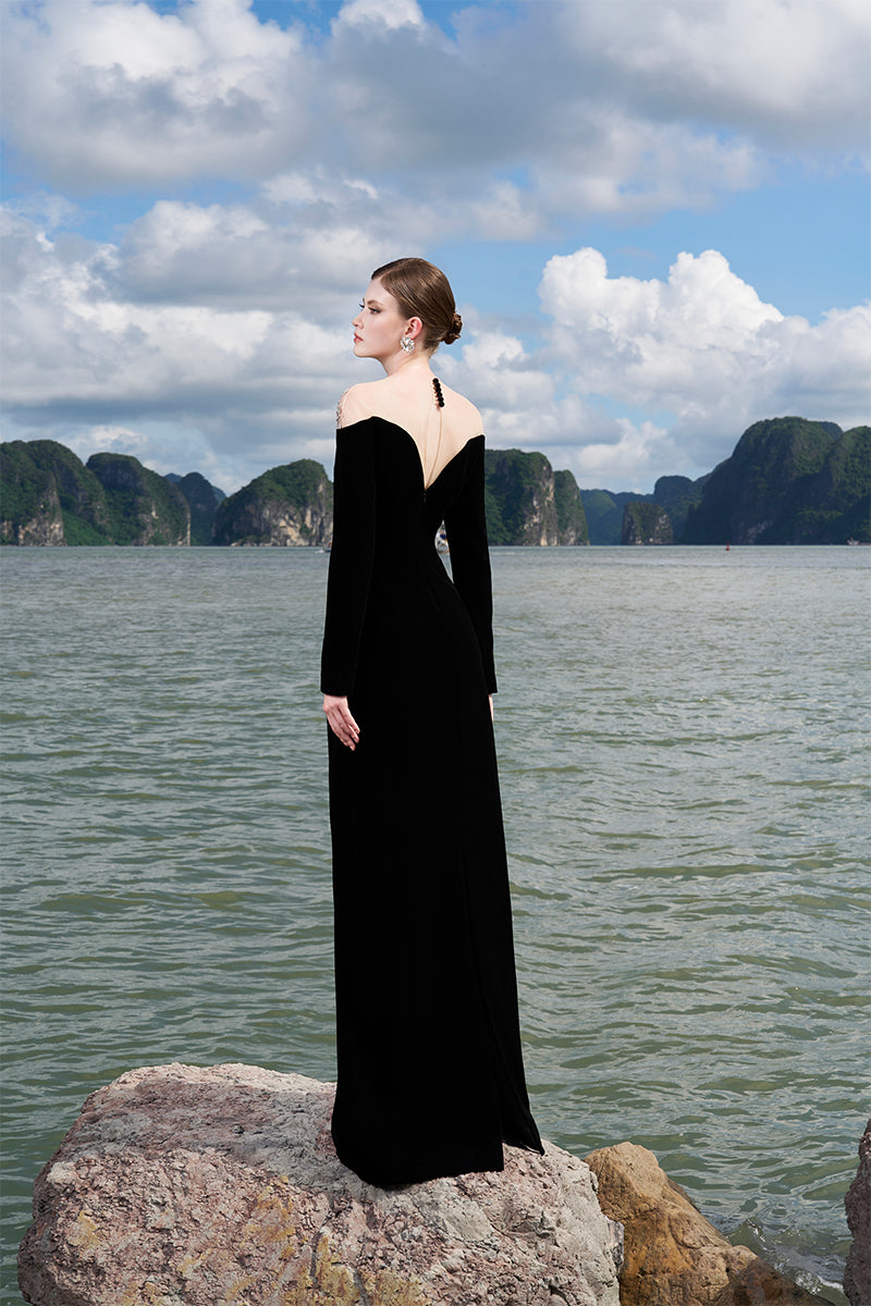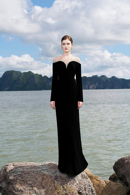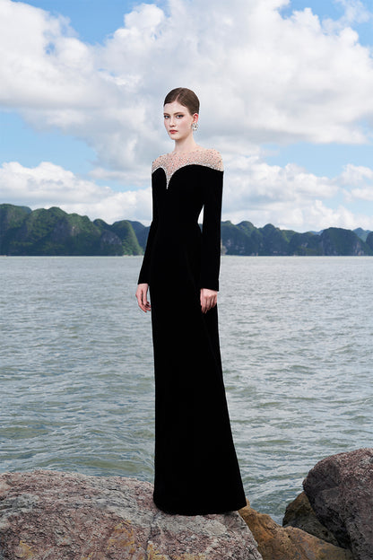 Introducing the Tracy Studio luxury crystal embellished mesh houlder Off-shoulder Heart Chest See-Through Evening Dress - Thea . Enhance your elegance with the round-neck design, see-through mesh and crystal embellishments on the shoulder, and a heart chest line. The long sleeves and zipper at the back complete the sophisticated look. Made of luxurious velvet for a touch of opulence.