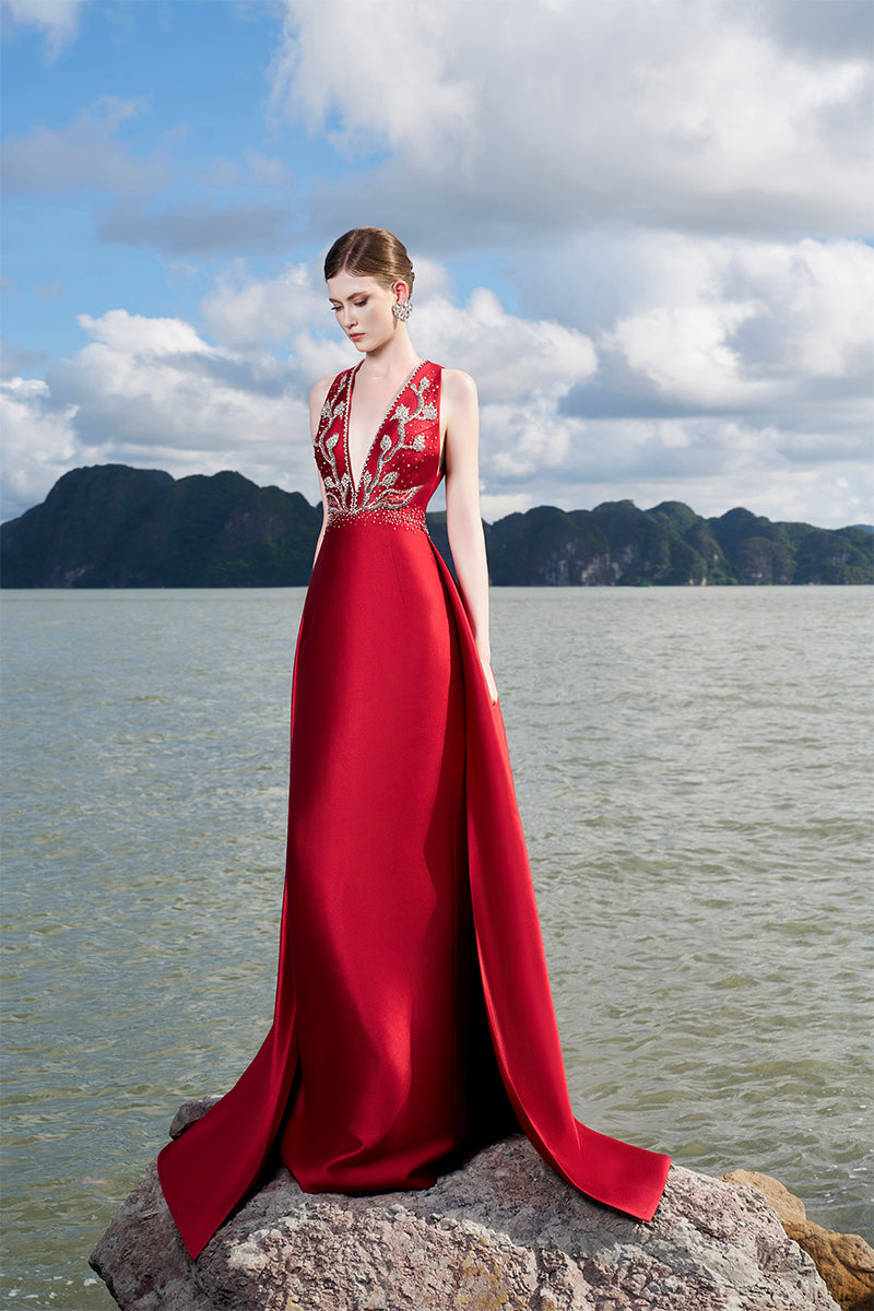 Introducing Tutku, the Tracy Studio luxury evening dress. Made with a luxurious bamboo taffeta fabric, it features a sleeveless design with a deep V-neck and a flared A-line skirt. The crystal embellishments at the chest and waist add a touch of goddess-like sophistication, while the draped sides and hidden tear-drop zipper at the back create a seductive statement. Perfect for elegant events and weddings.