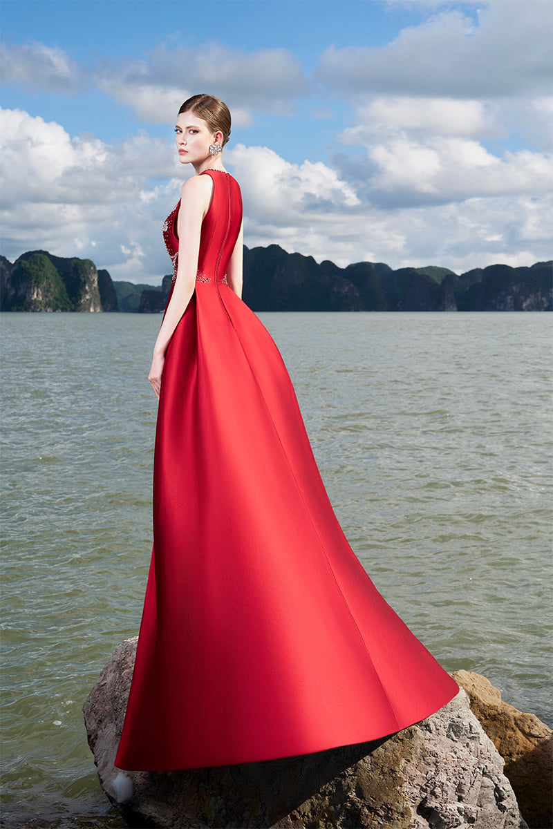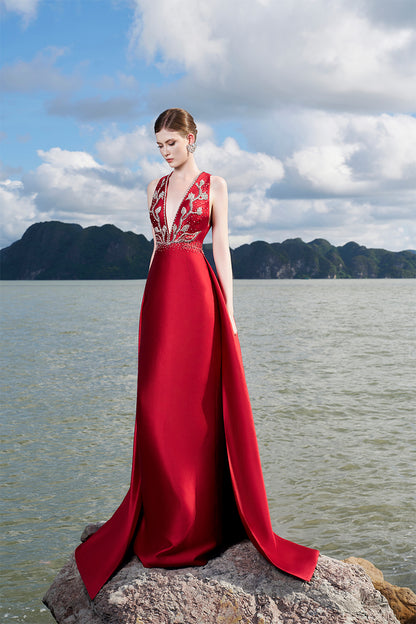 Tracy Studio luxury Sleeveless Deep V-Neck Flared A-Line Crystal Embellished Red Evening Dress - Tutku