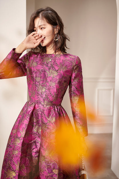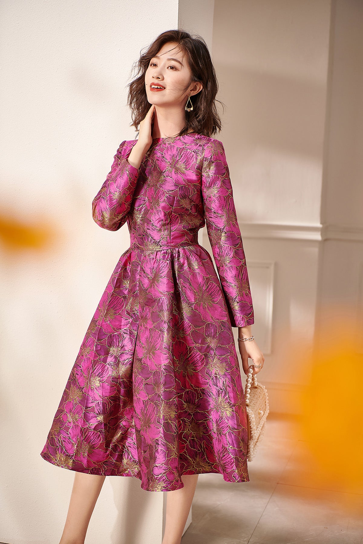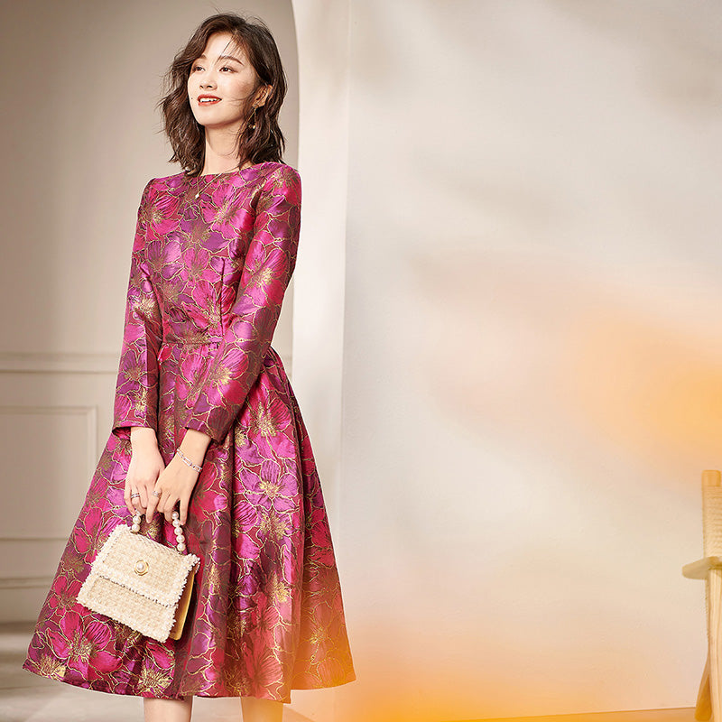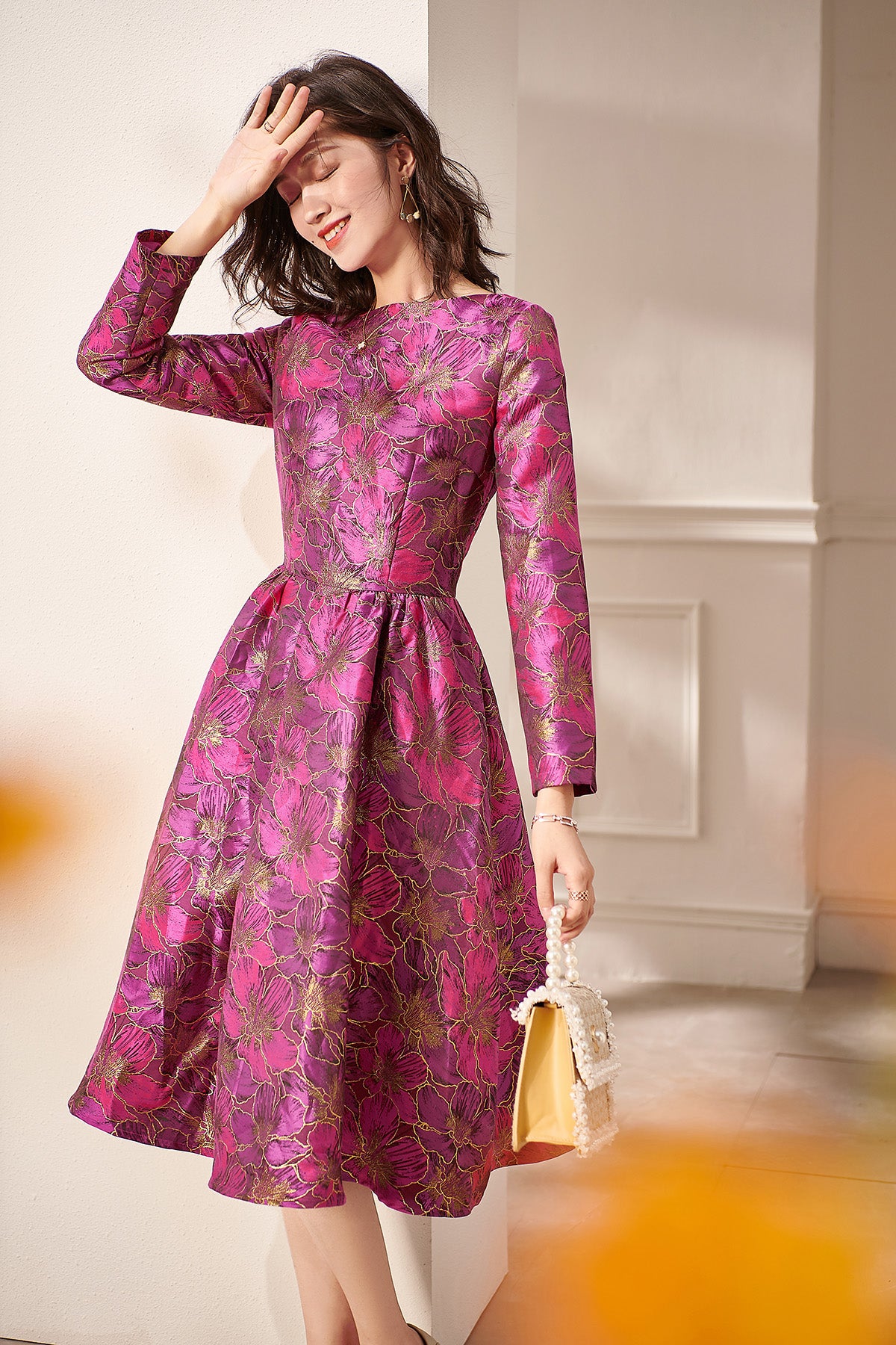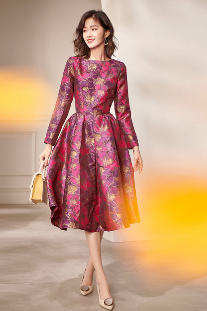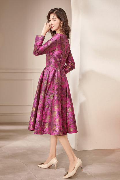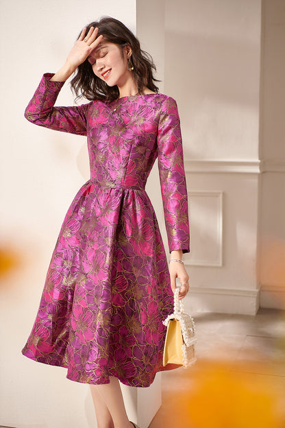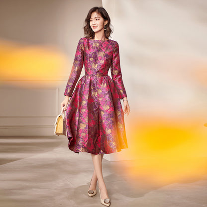 Autumn Long sleeve retro jacquard mid-length dress -Oli