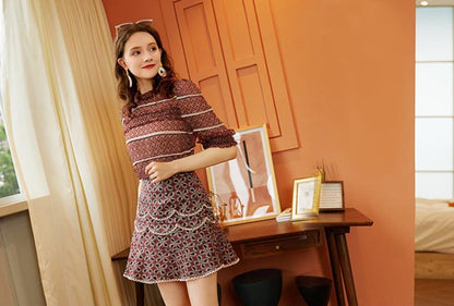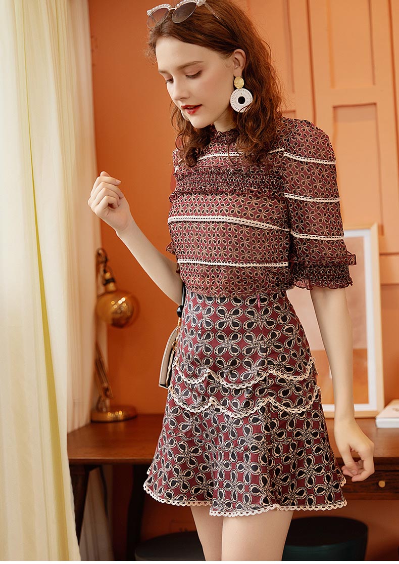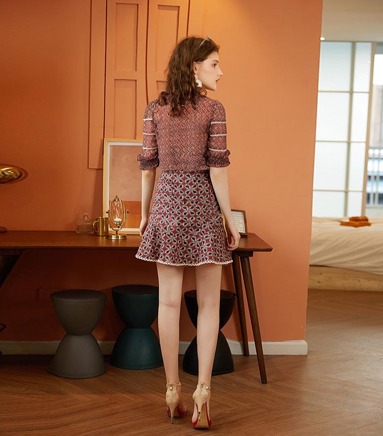 Vintage inspired printed chiffon blouse + short skirt two piece suit set- Elsie