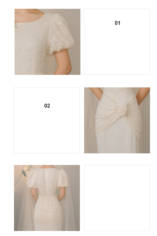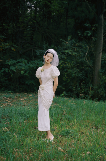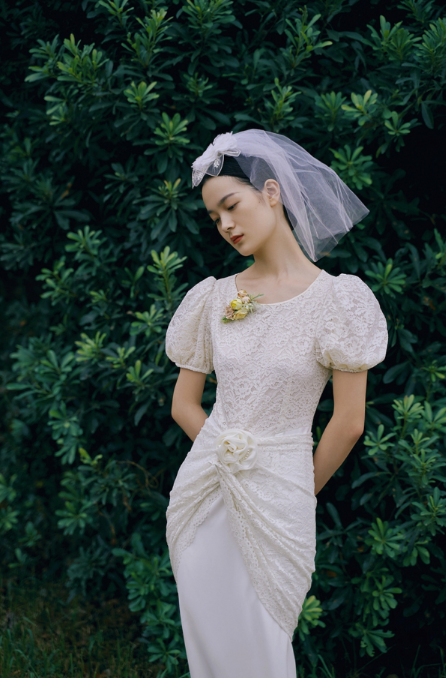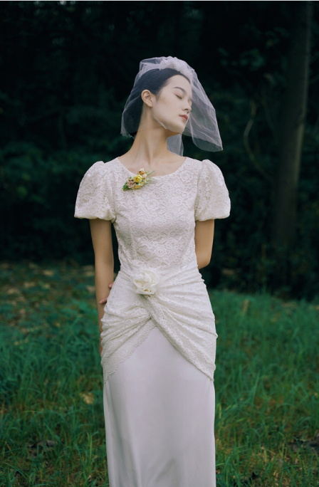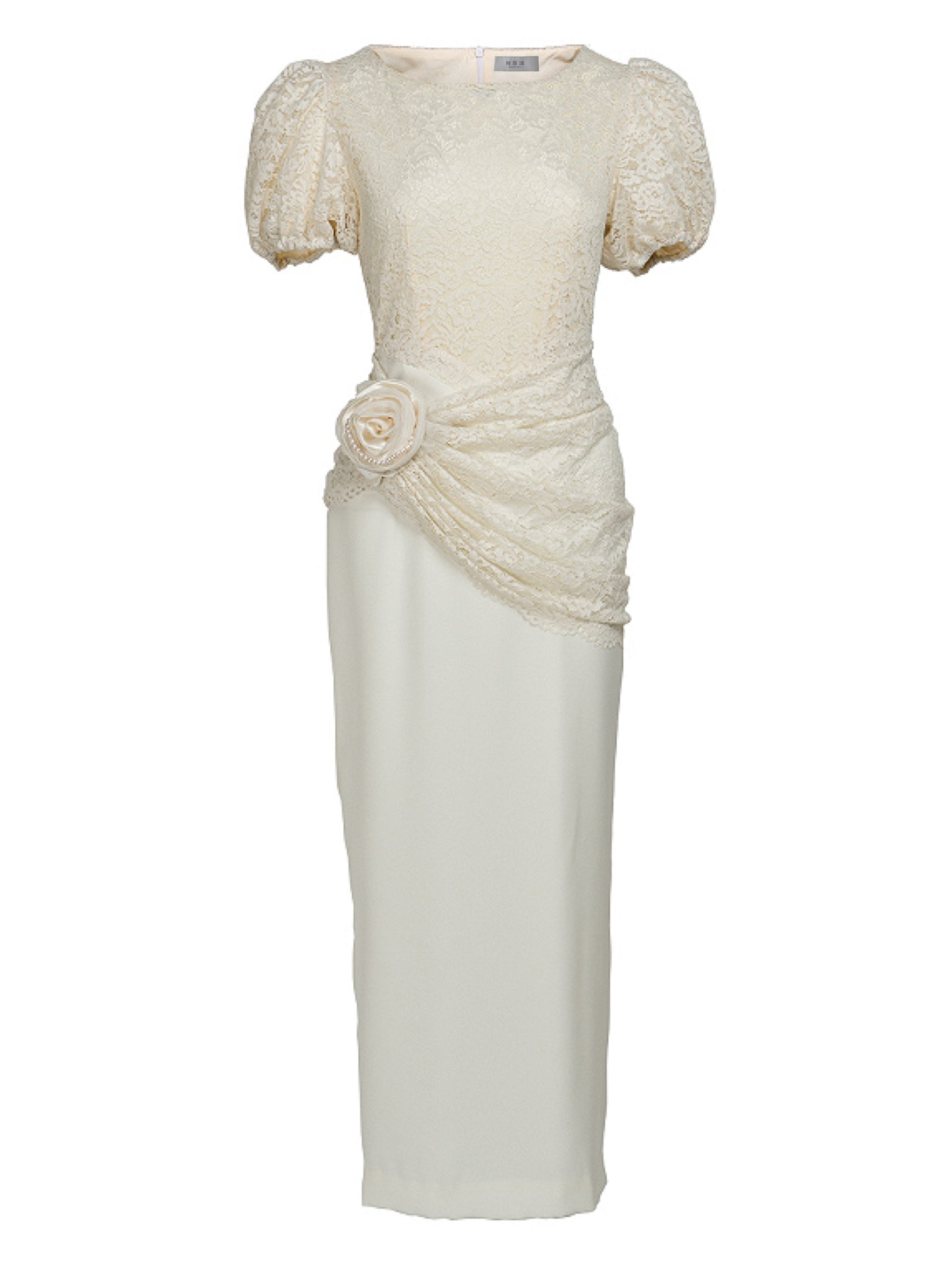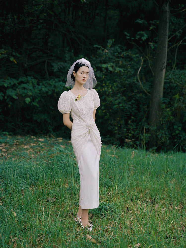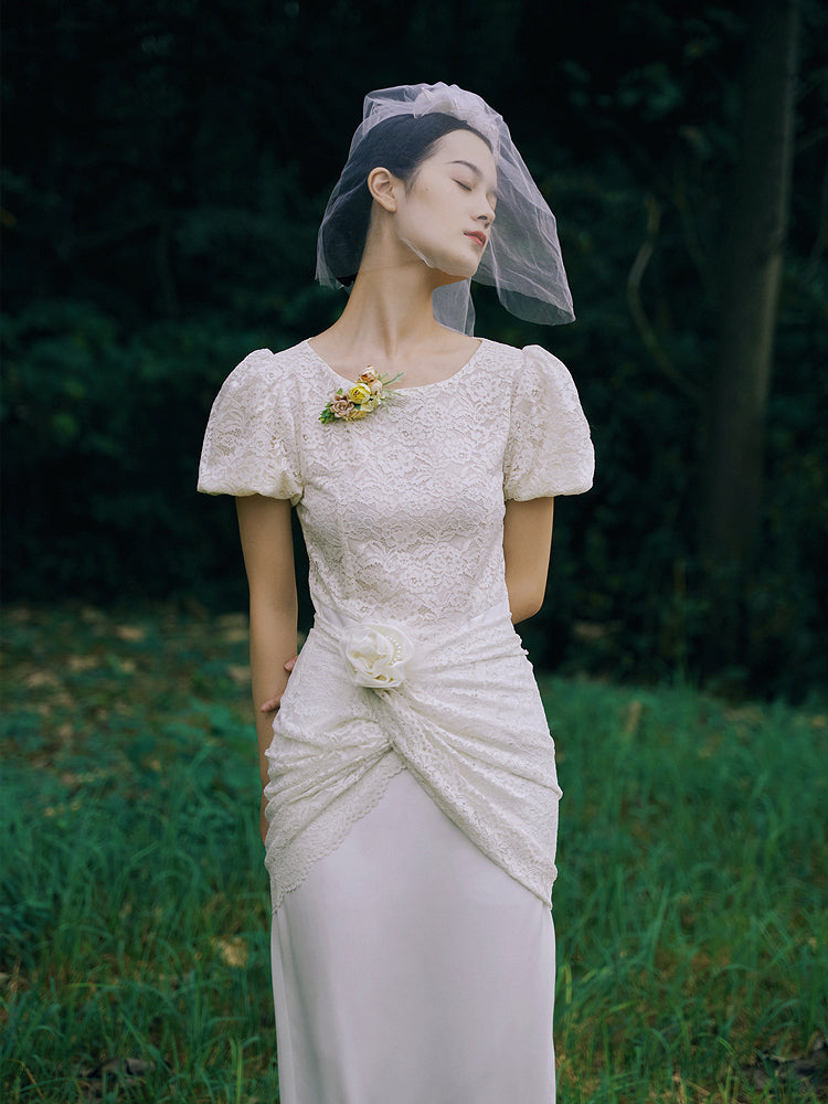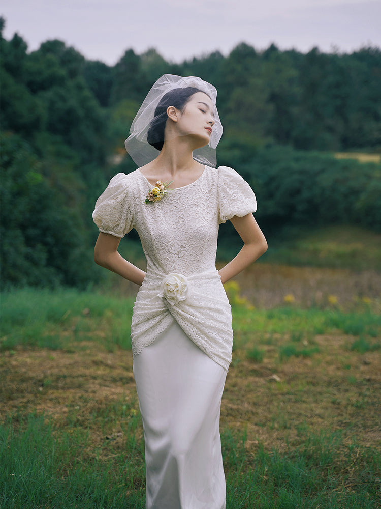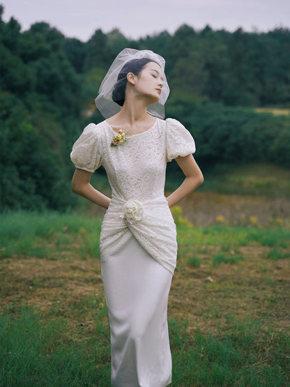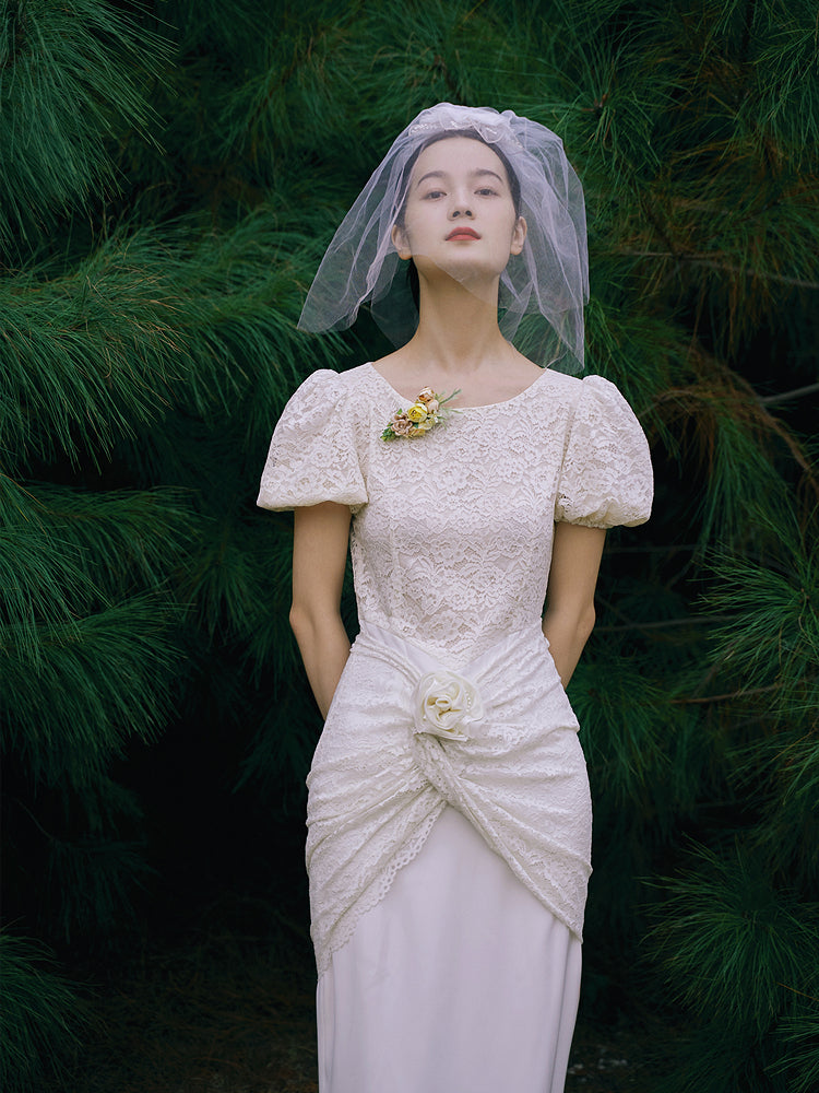 Vintage milky retro-chic high-waisted cut bridal white lace dress- Turni