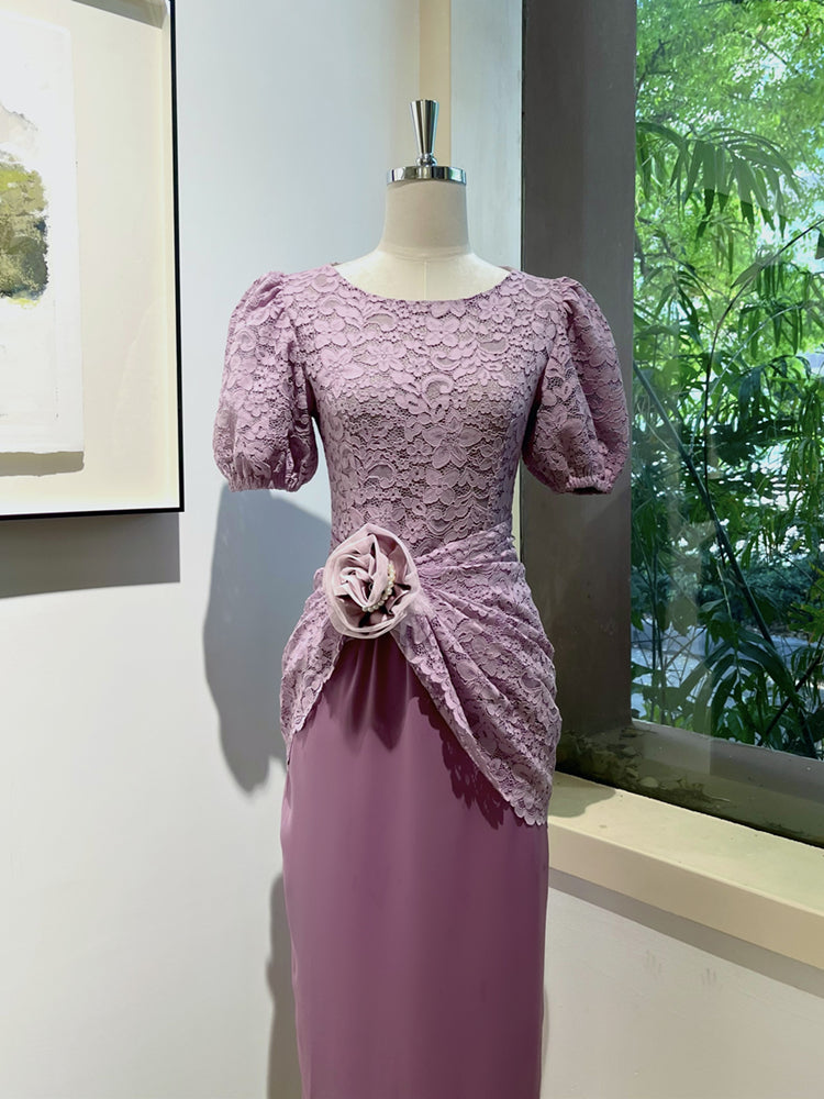 Available sizes: XS  S M L XL , the material is different than the fabric, featuring a plain pattern. The style is best described as retro-chic commuter, with a rounded neckline, high-waisted cut, pullover closure, and milky white and violet colors that can be customized. It has a puff sleeve, is a single piece and has a mid-length skirt. The material composition is something other than fabric.