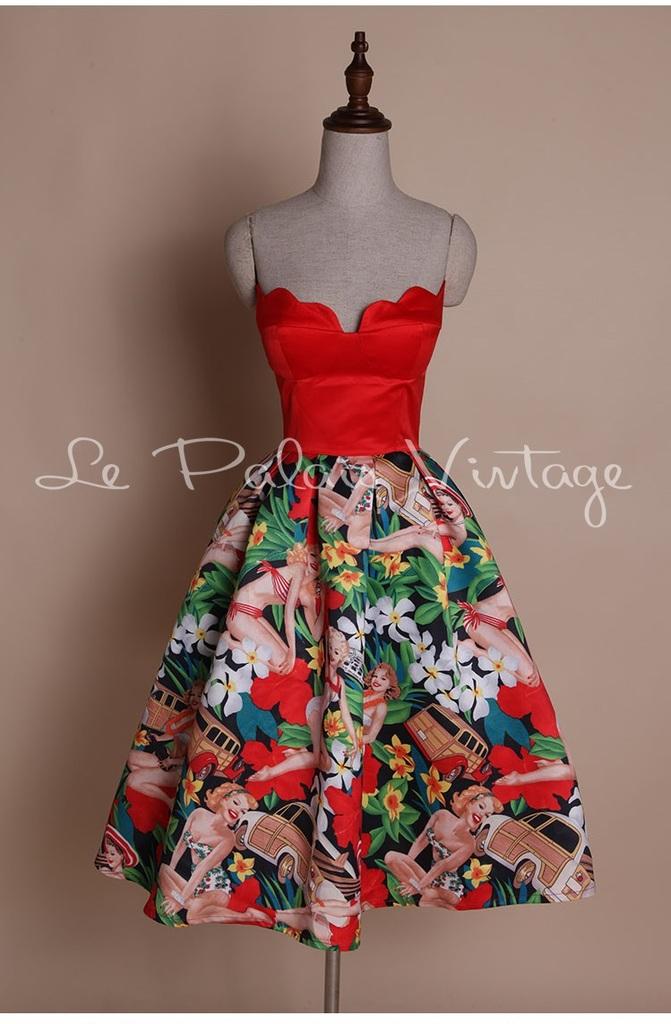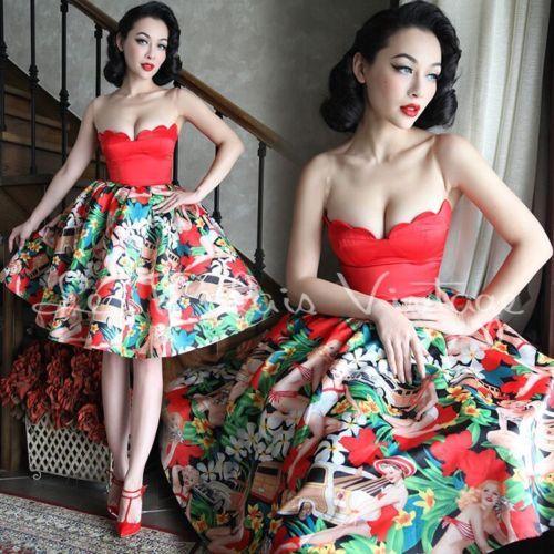 Vintage retro pinup 1950 strapless bustier full skirt floral dress