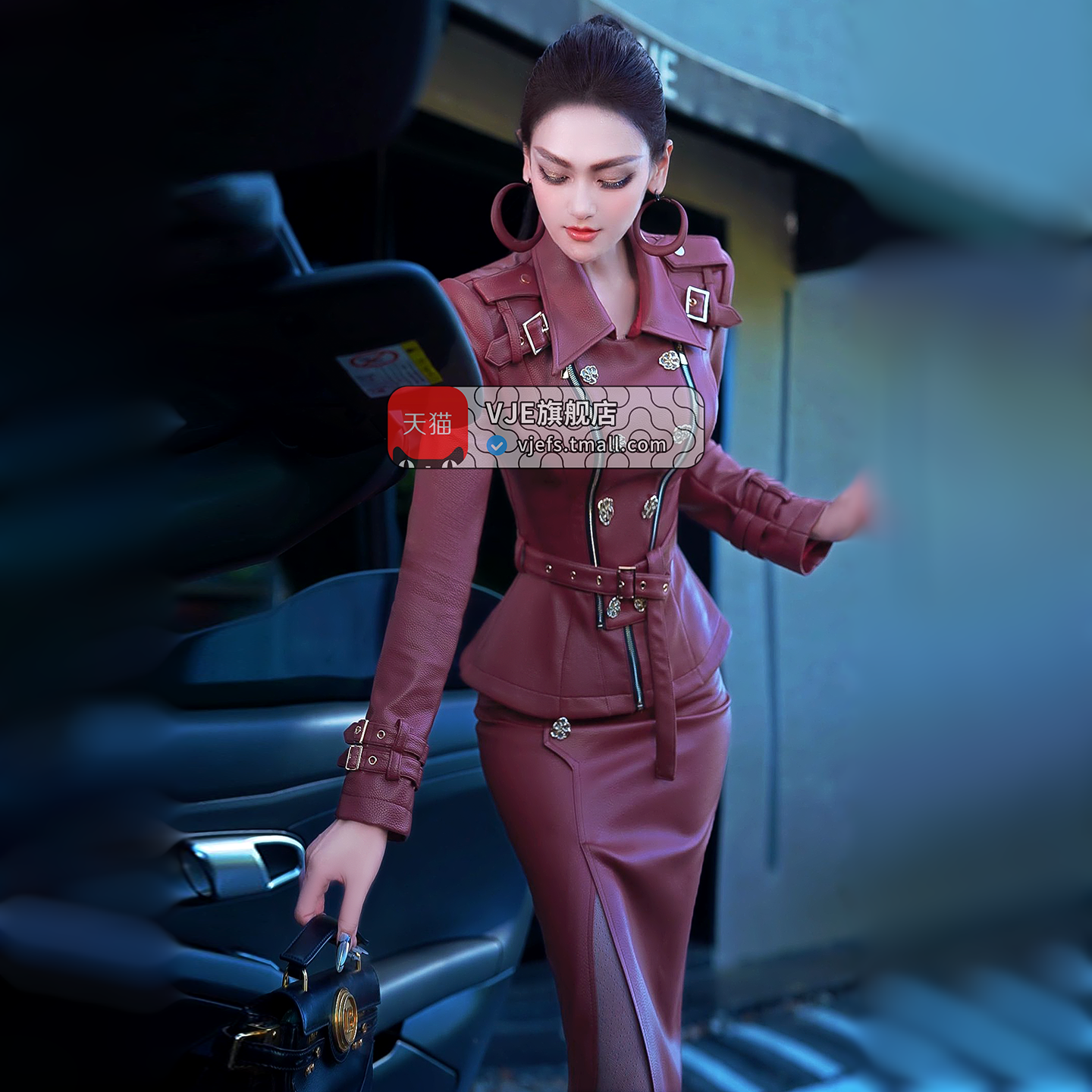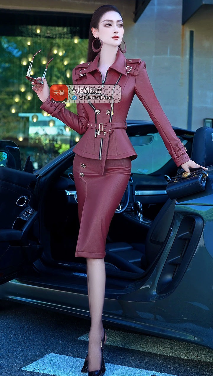 VJE PU Leather Suit Skirt Jacket Midi Hip Skirt Two-Piece Set-BORA,