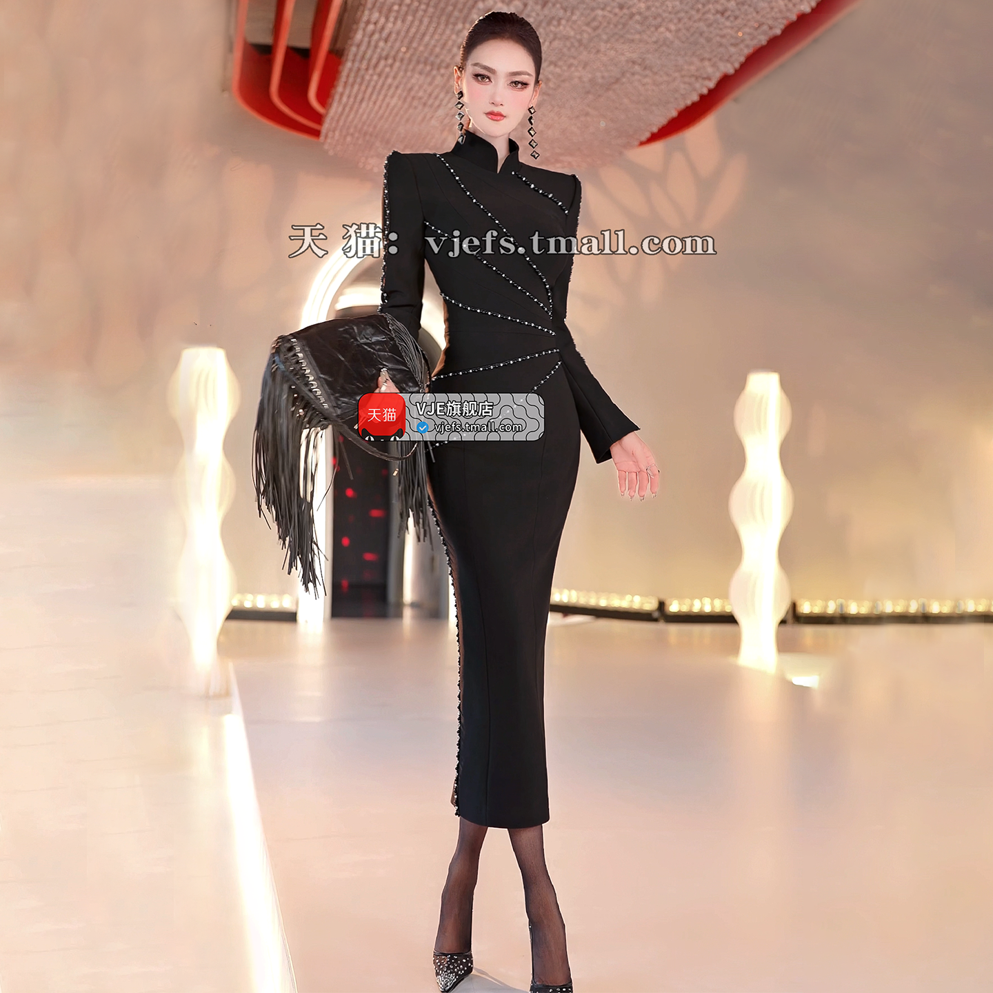 VJE Beaded Midi Slim Stand Up Collar Dress -KIE.