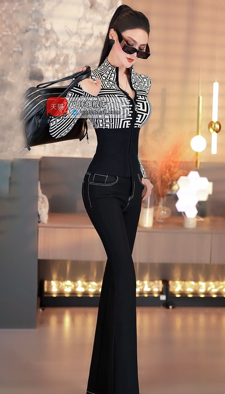 Elevate your wardrobe with this striking black and white jacquard turtleneck that's equal parts chic and bold. The intricate pattern adds visual interest while the slim-fit knit hugs your curves in all the right ways. Featuring a sleek zipper detail at the neckline, this versatile sweater transitions seamlessly from casual coffee dates to night-out vibes. Perfect for layering or wearing solo, it's the kind of piece that makes getting dressed actually fun. Cozy, stylish, and unapologetically cool.