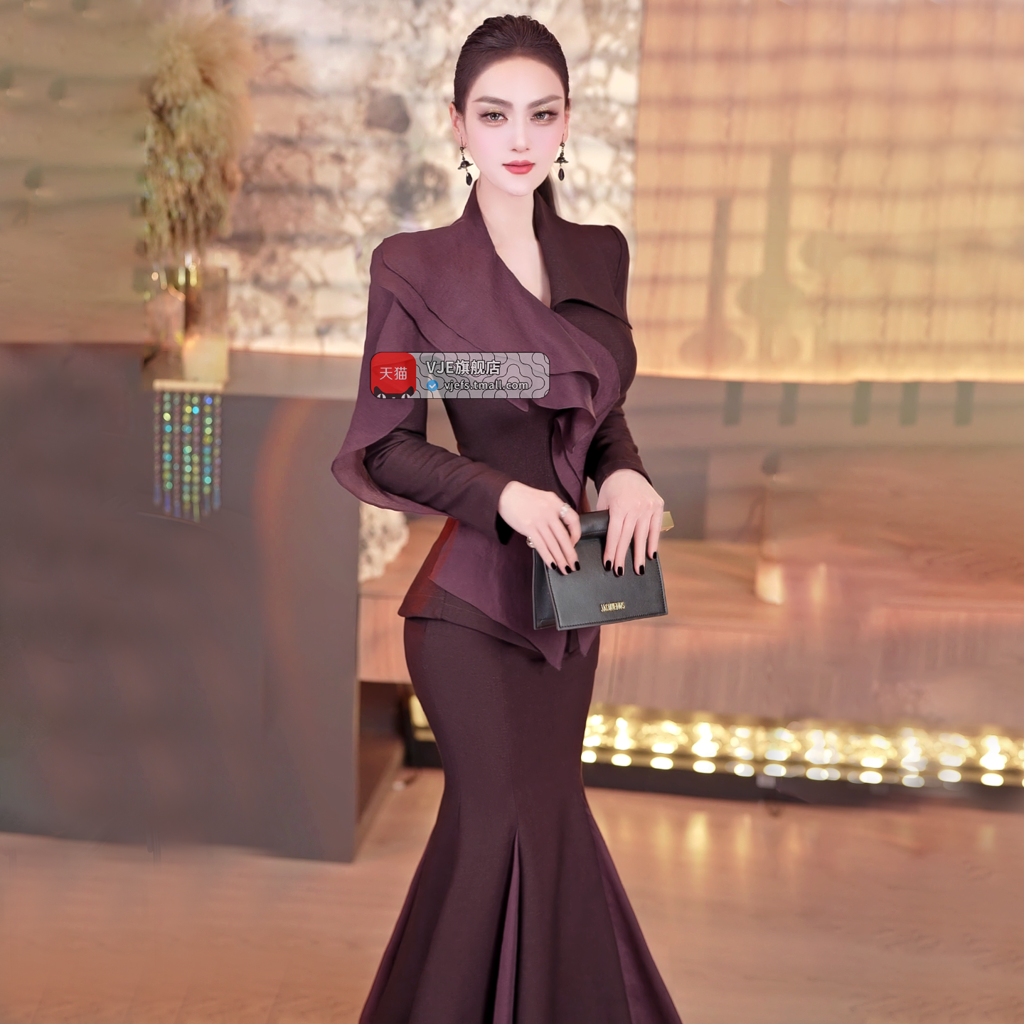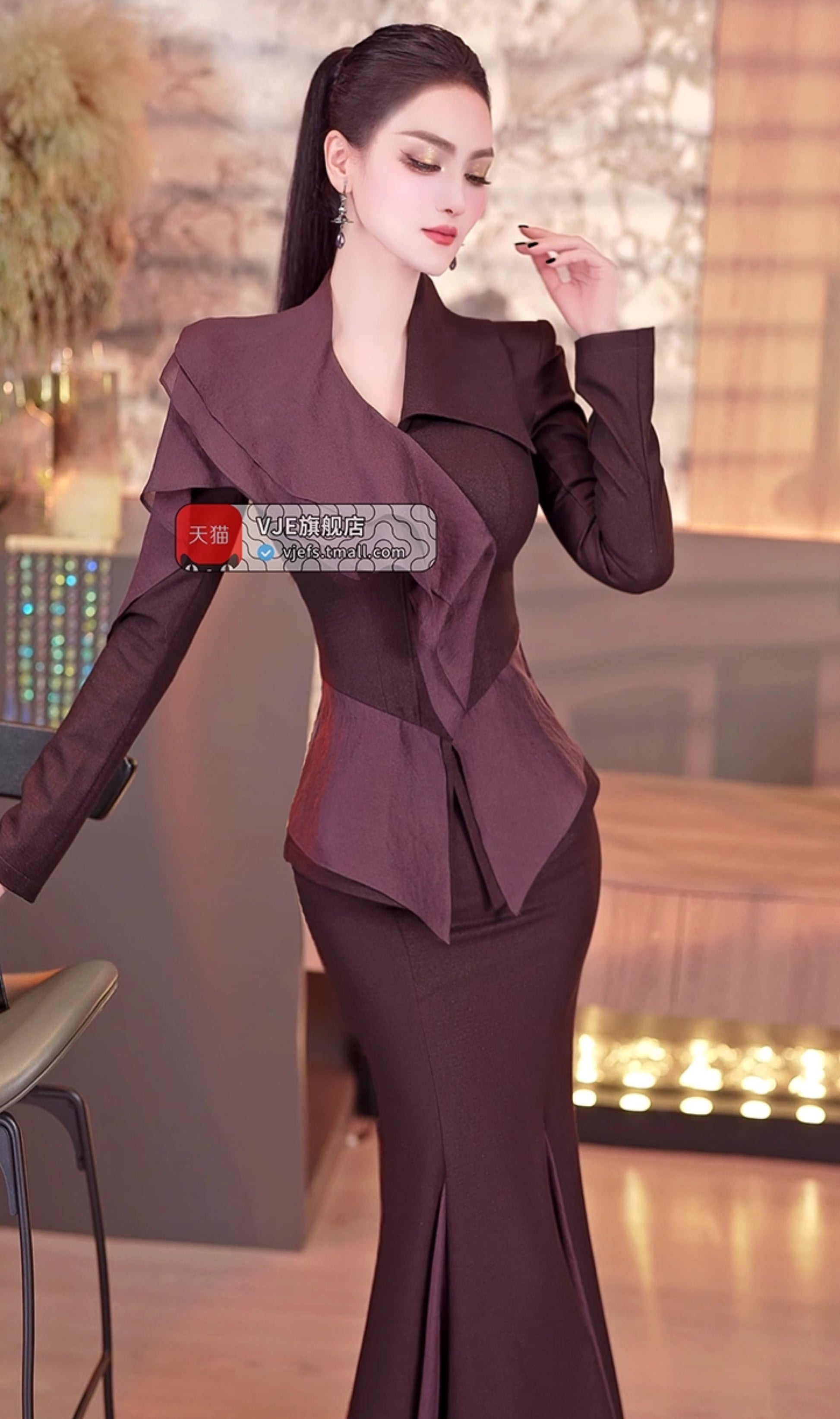 VJE slim ruffled jacket mermaid skirt two-piece suit set- JOKY.