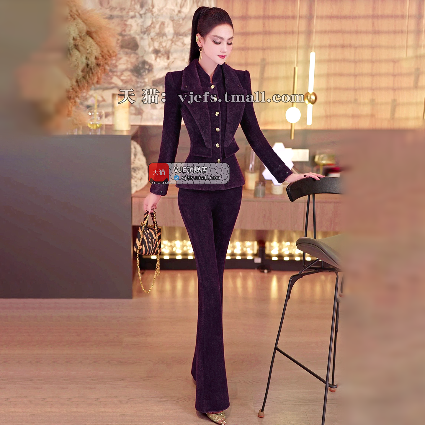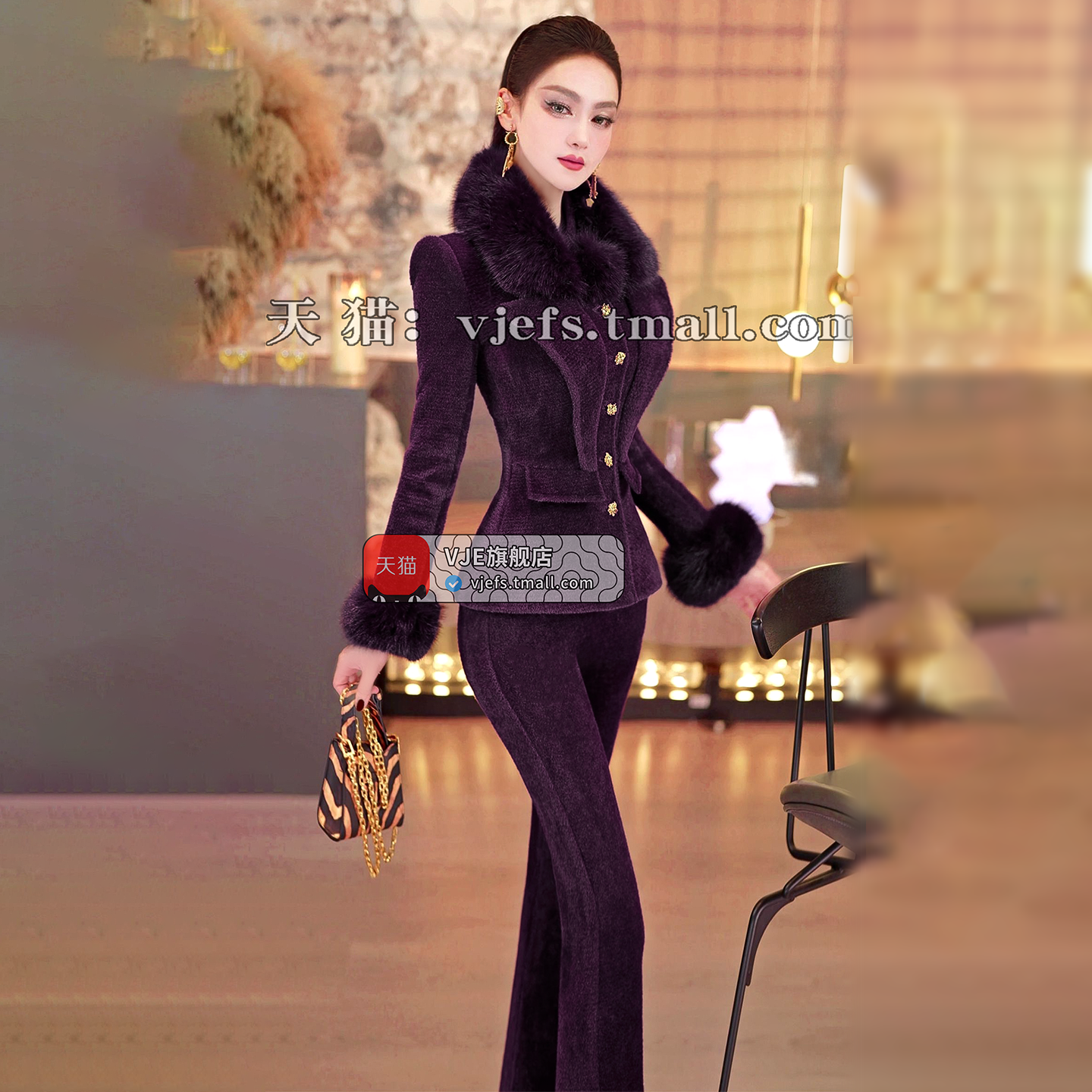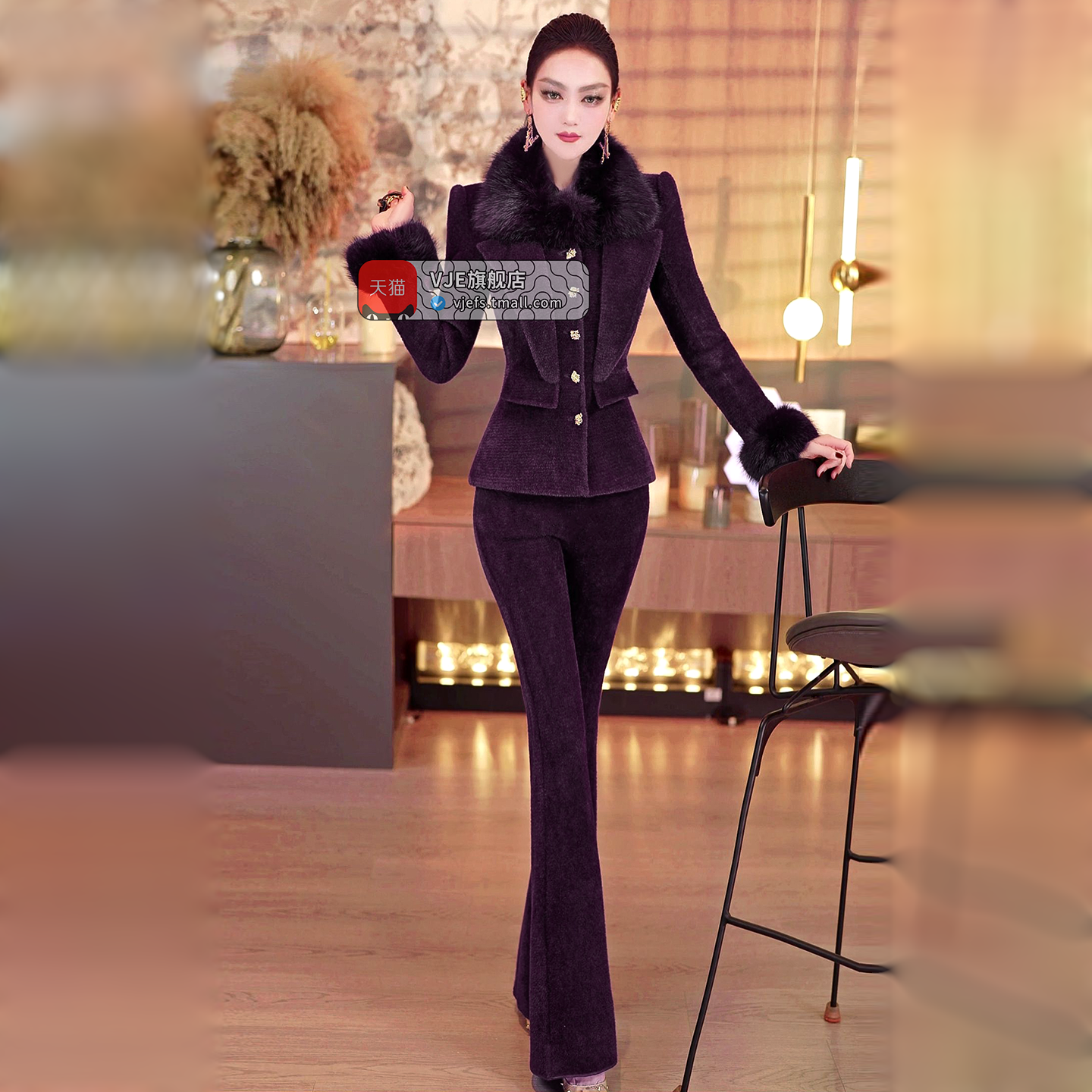 VJE Removable Fur Collar Jacket Micro Flared Pants Two-Piece Set - TED.