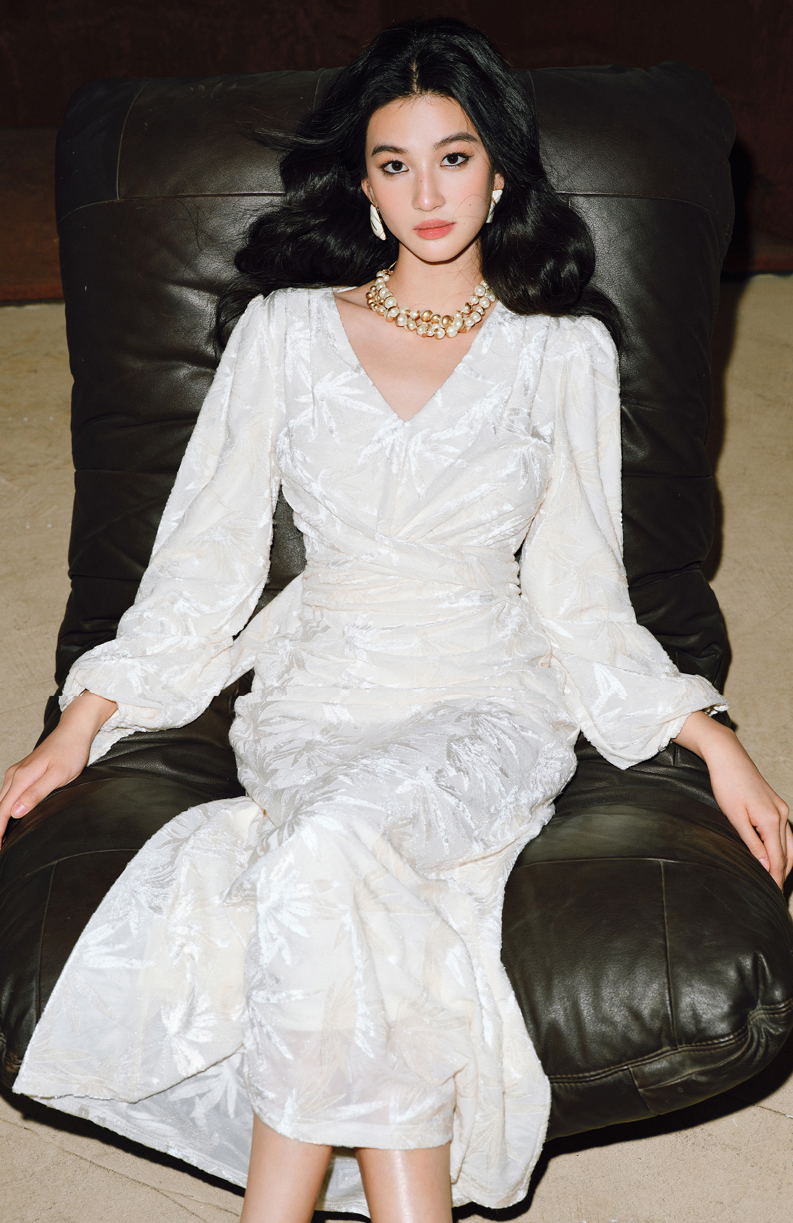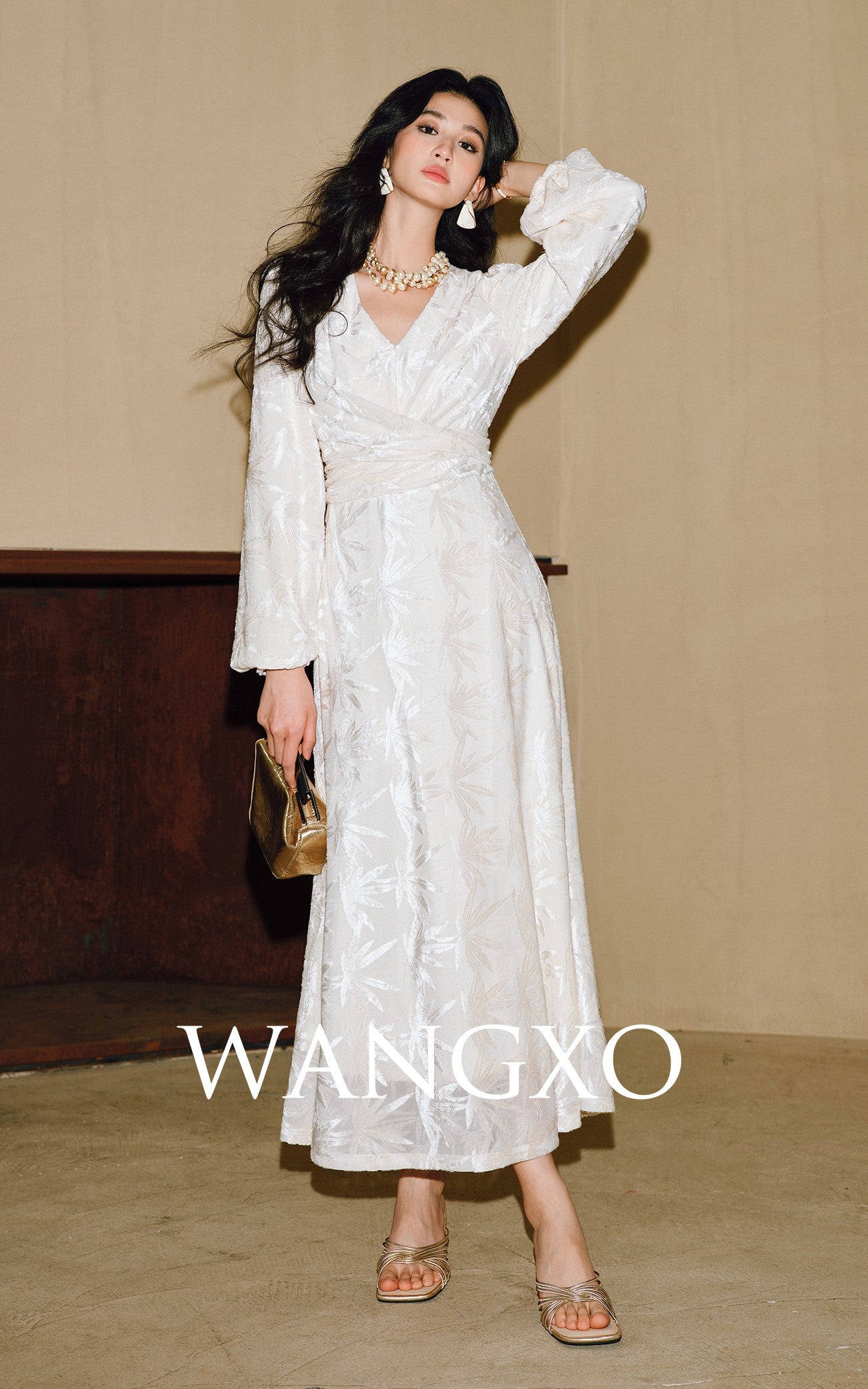 This elegant dress features a bright silk stretch knit fabric with a jacquard embossed maple leaf texture, combining luxury with subtle detail. The V-neck design and tie waist create a flattering silhouette, offering both comfort and style. Perfect for sophisticated occasions, this dress balances refined craftsmanship with modern elegance.