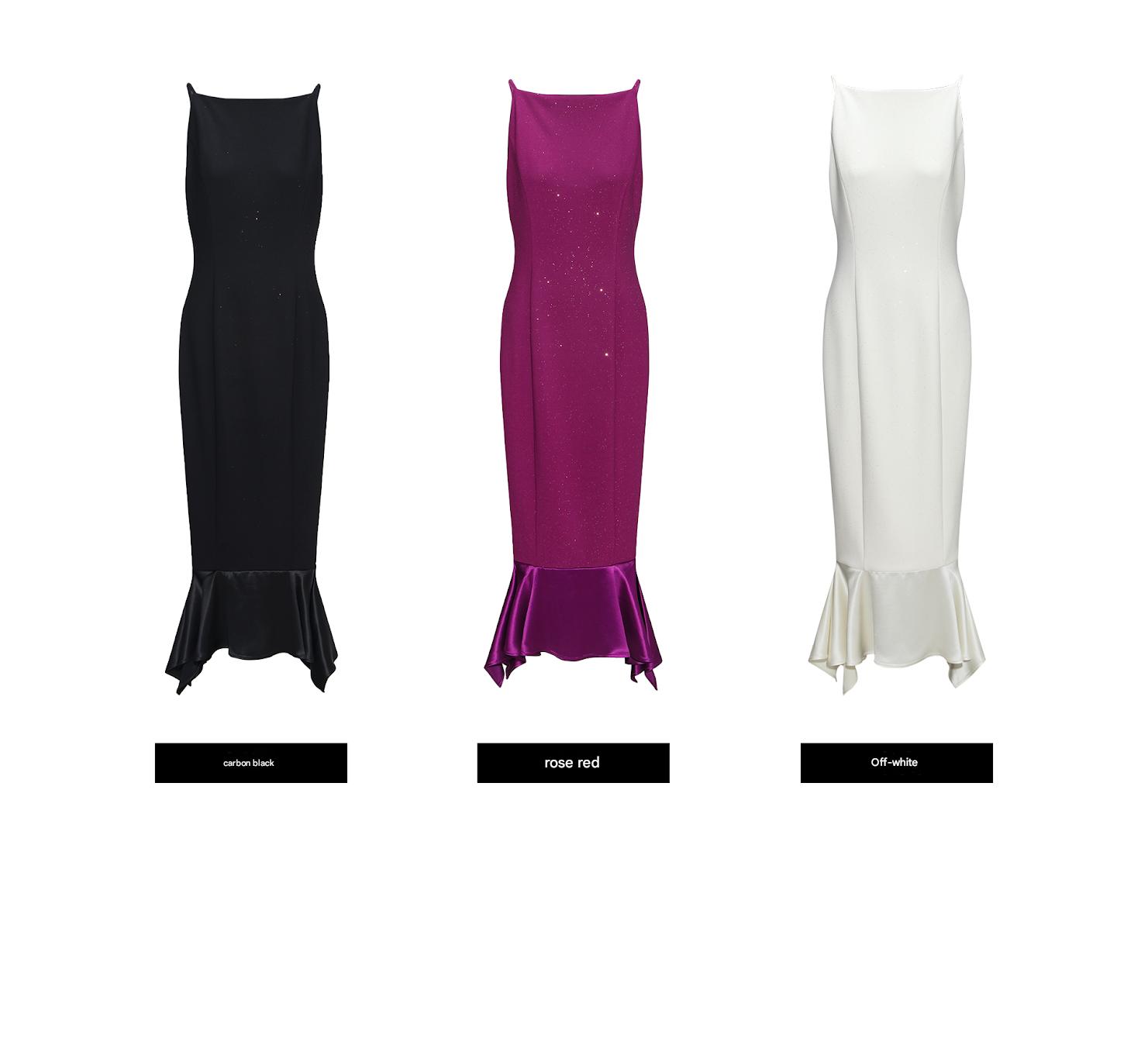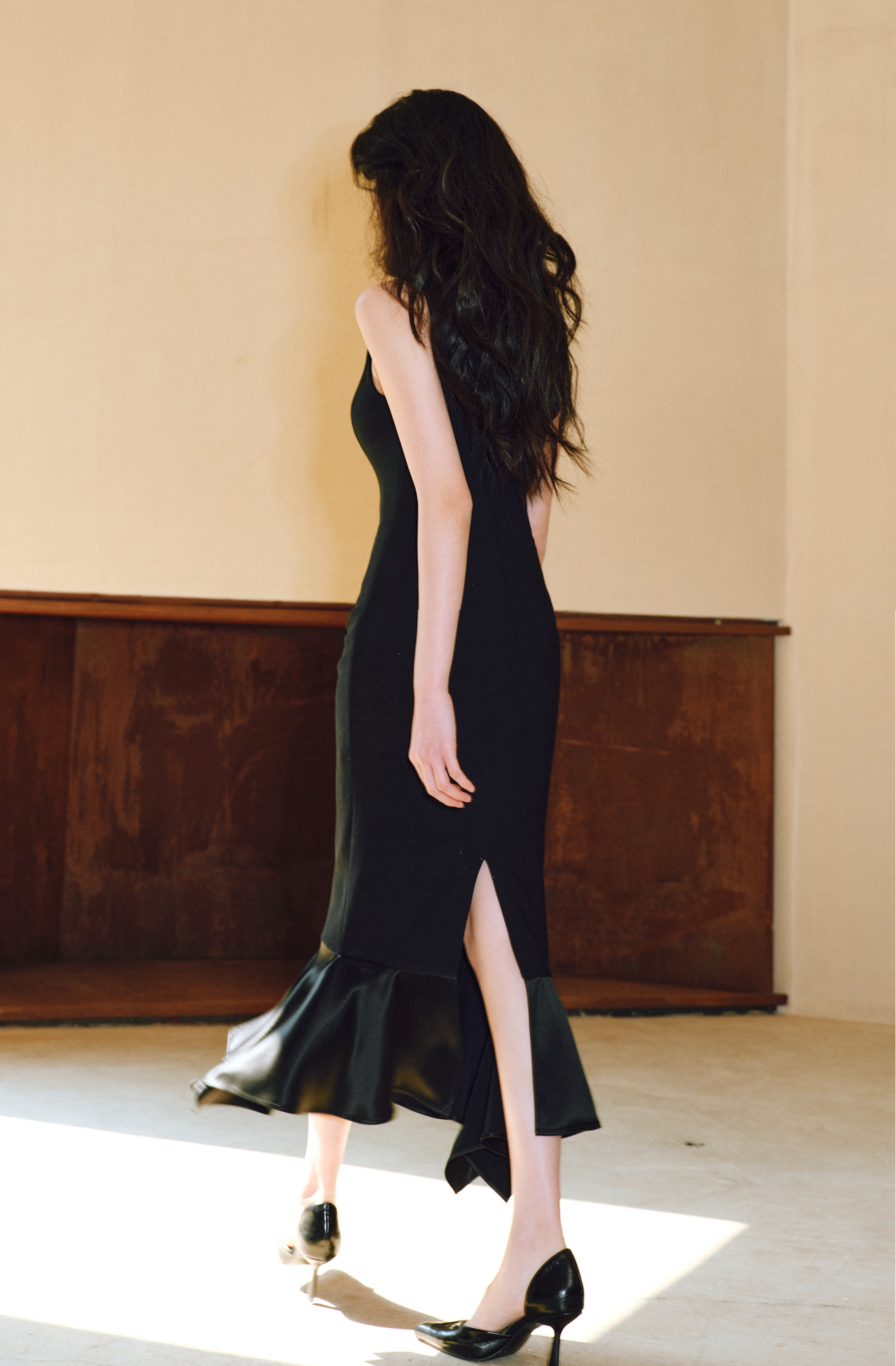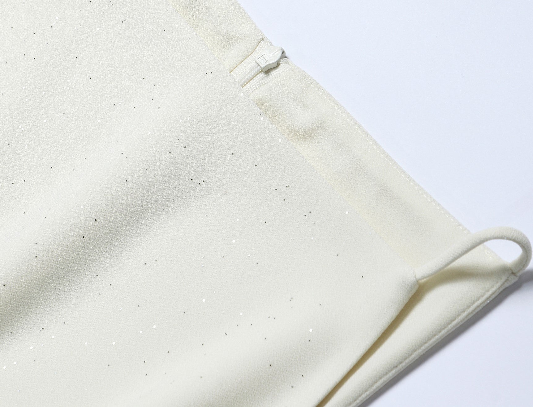 The WANGXO sundress artfully combines crumpled hemp-blend satin accented with sprinkled silver and sculpted acetate knit for a refined texture contrast. Its fishtail silhouette elegantly enhances movement, while the architectural side split adds a modern edge and ease of wear. This sophisticated design emphasizes structural beauty and contemporary elegance, perfect for making a distinct statement at upscale summer events.