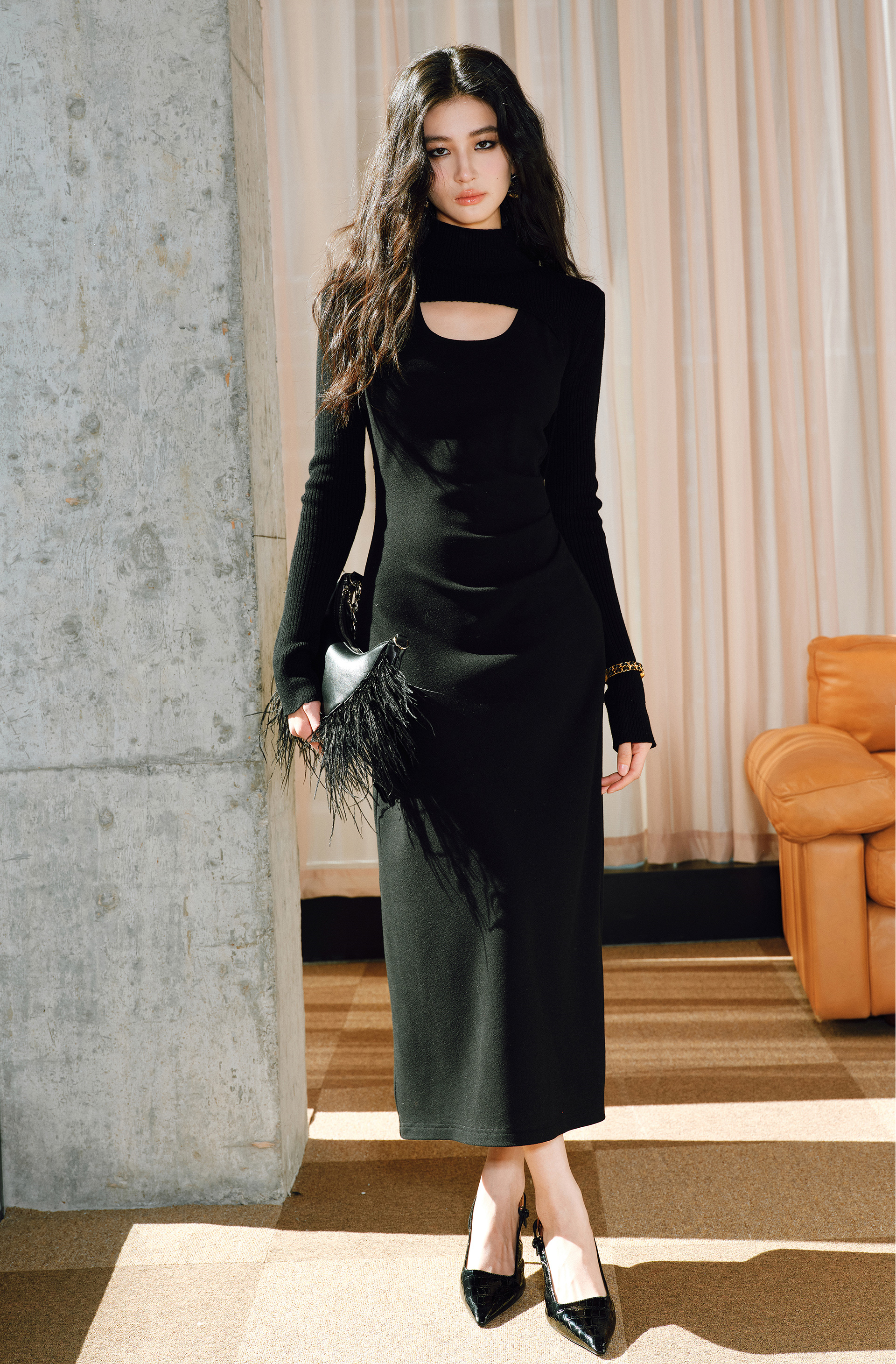 This refined dress features a delicate 12-needle wool pit texture that offers subtle sophistication. Its light, deconstructed curved shoulders and elegant U-neck design create a graceful silhouette, while the side pleats add movement and dimension. Perfect for those seeking an understated yet distinctive look, this piece balances classic tailoring with modern details for versatile, timeless style.