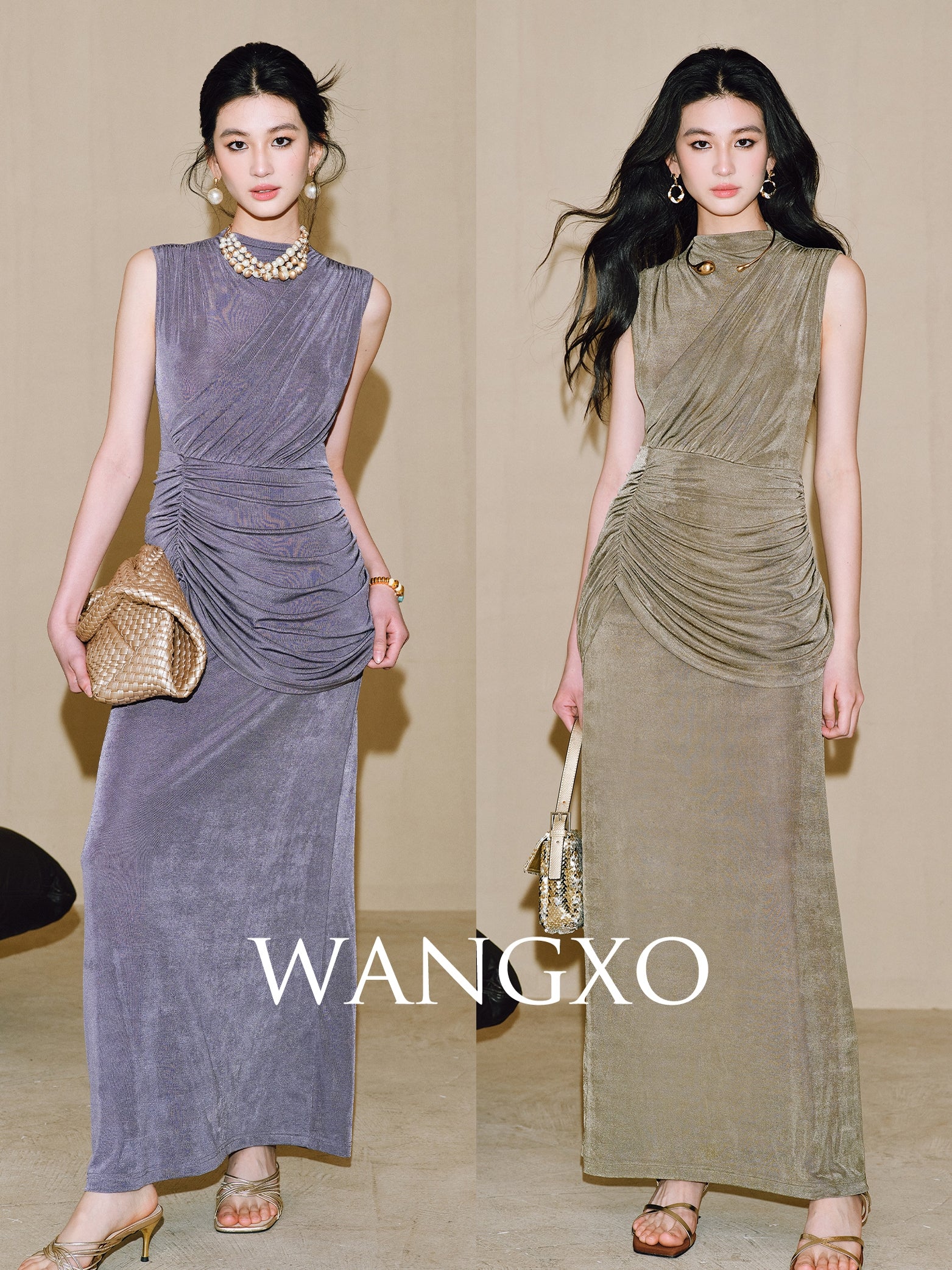 The WANGXO dress features a draped, high-stretch sculpt knit fabric that delivers a curve-hugging fit with shirred detailing for a subtle texture. Its sleeveless design and seamless, waistless construction create a smooth silhouette that enhances natural shape while ensuring comfort. This elegant and classic piece offers refined simplicity, ideal for sophisticated occasions requiring effortless style.