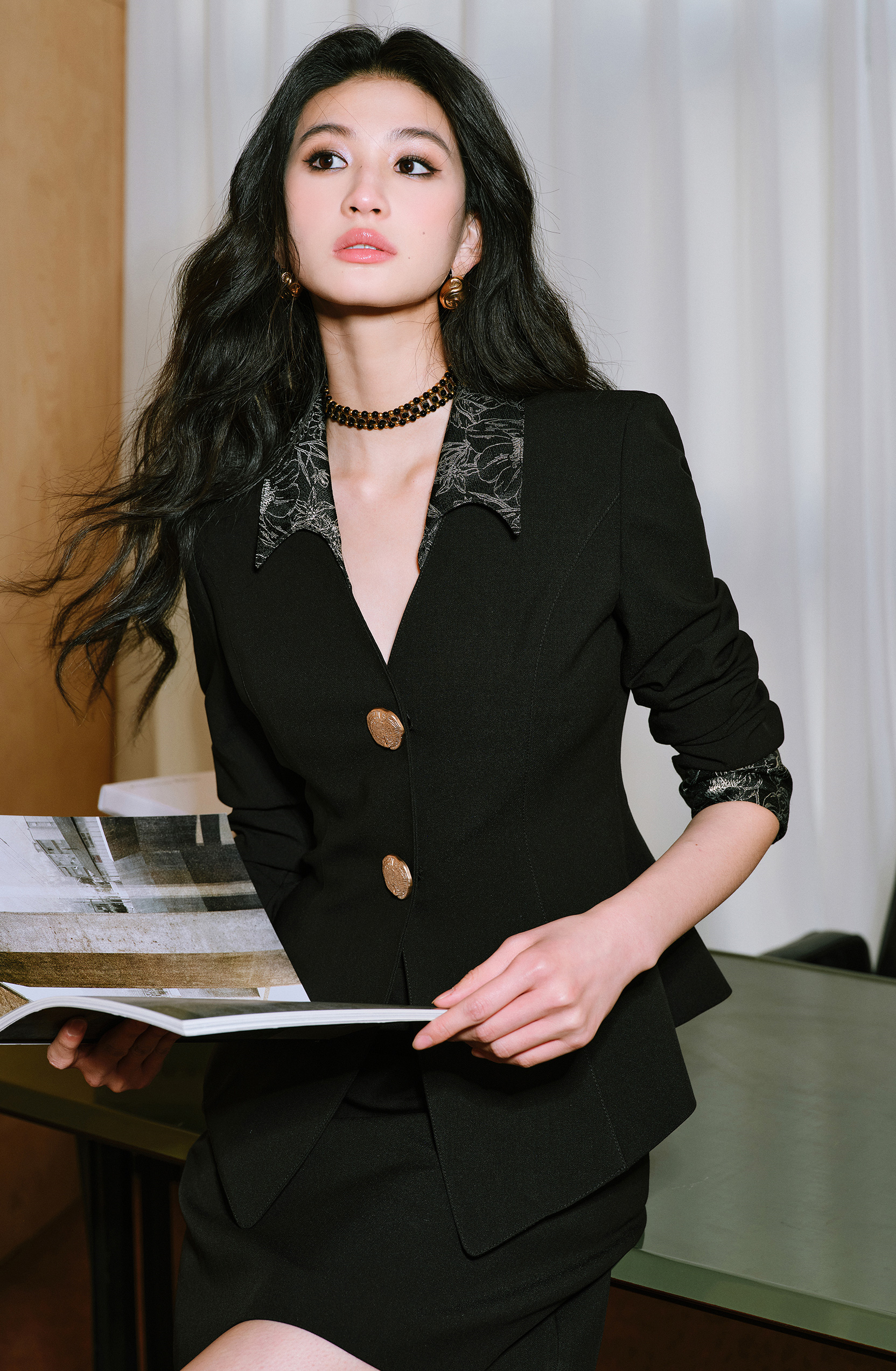 WANGXO | Silk Jacquard Suit Wide Waist A-Hem Jacket & Skirt Set -GAGE.