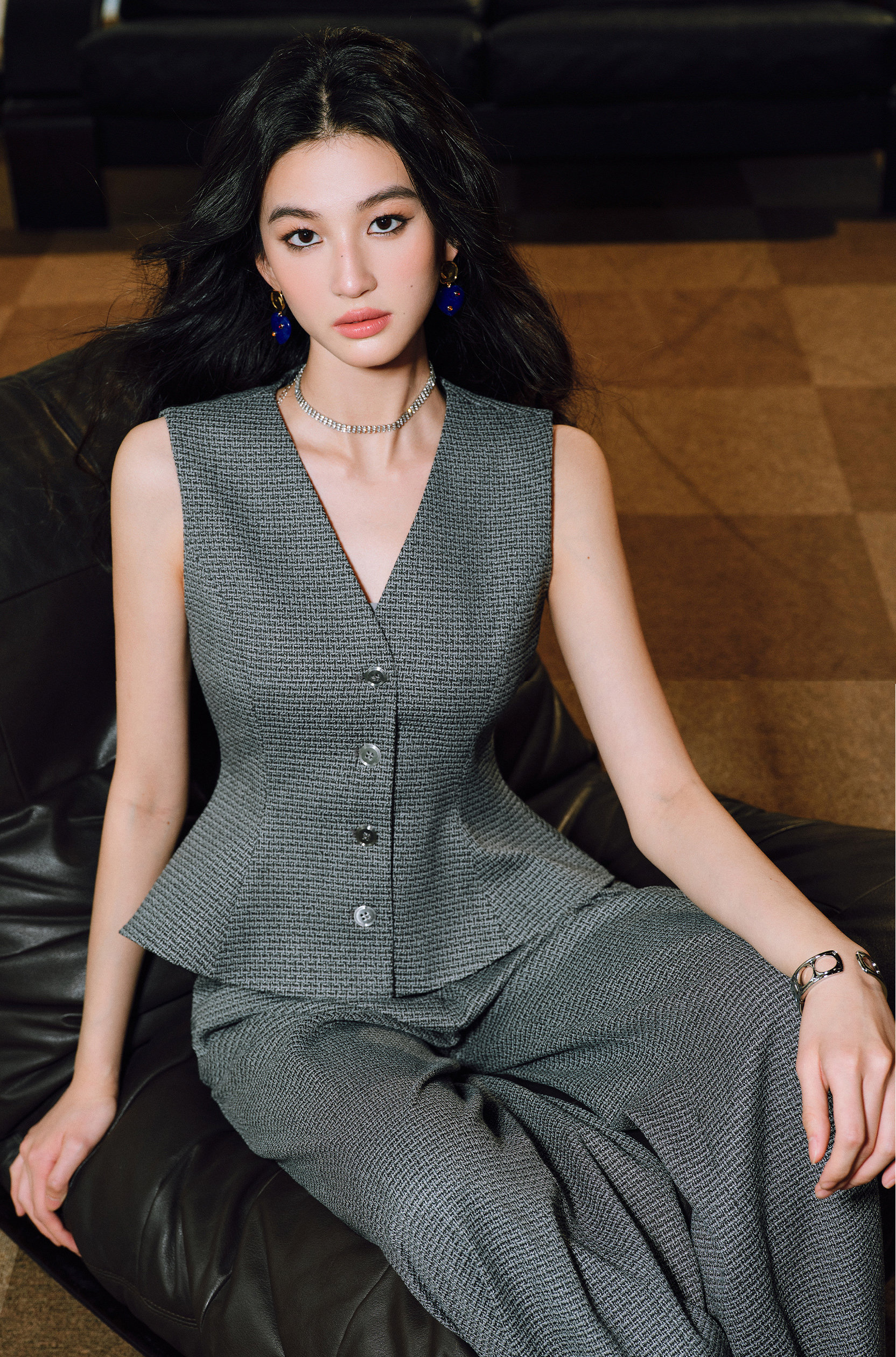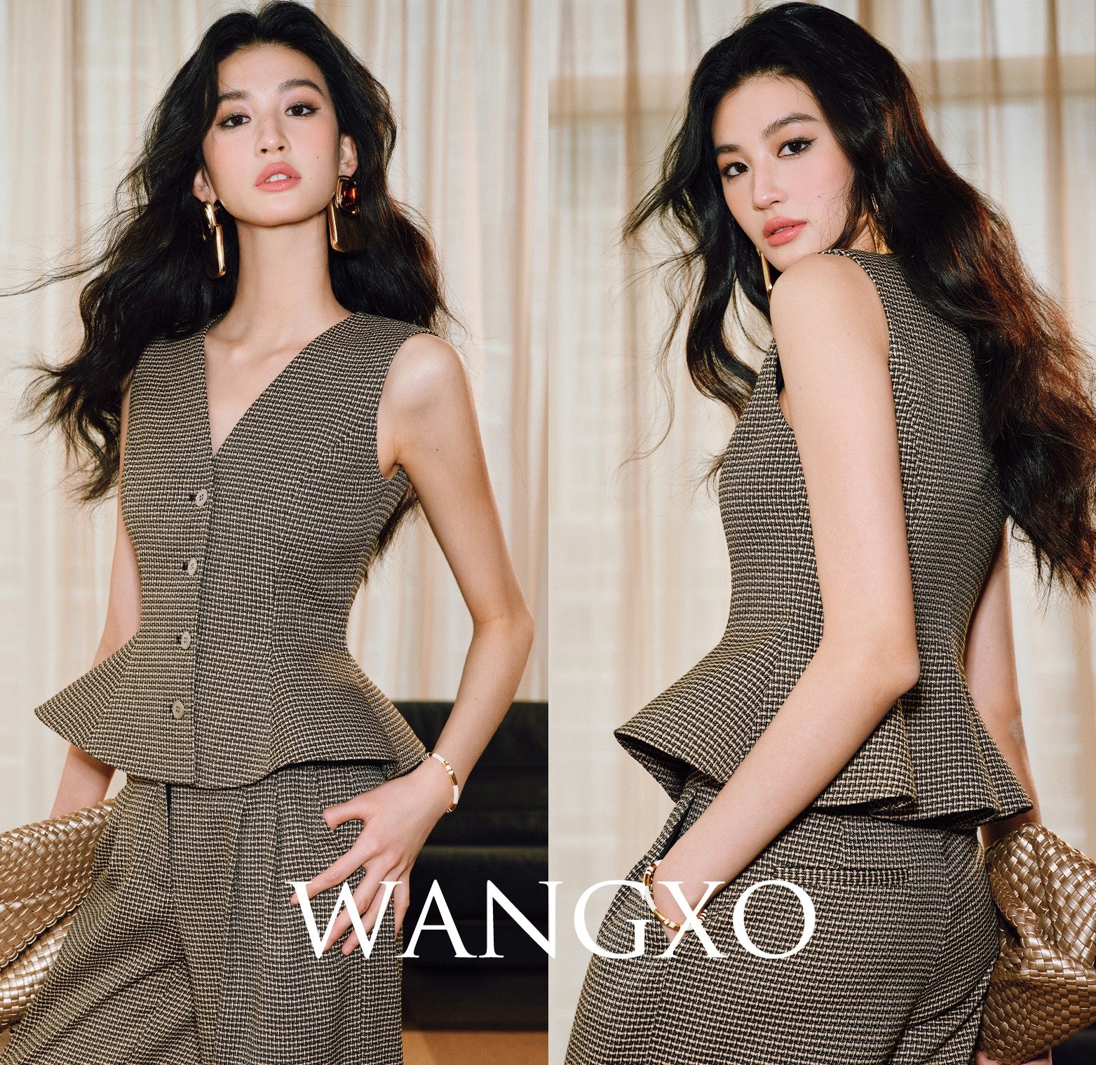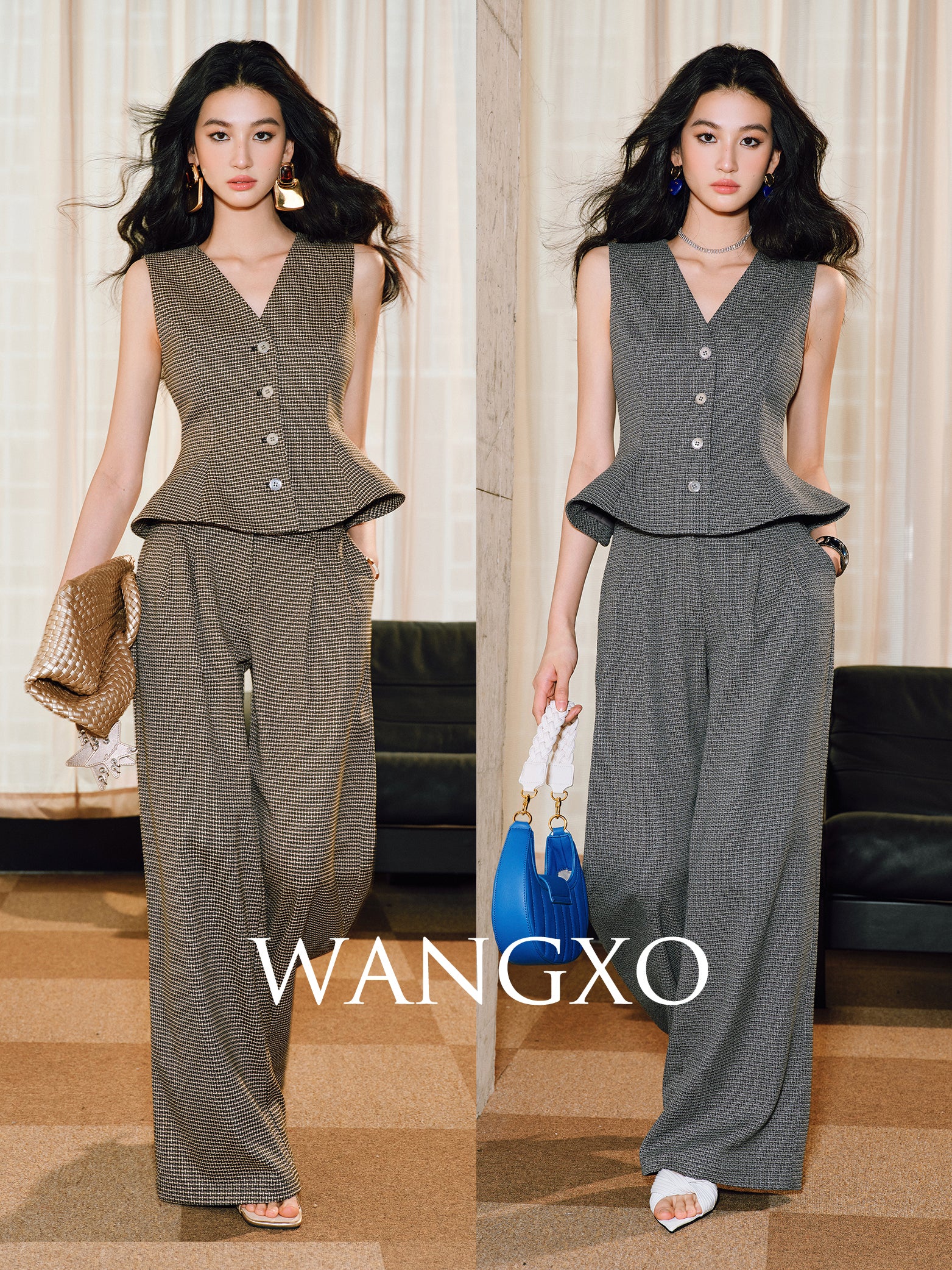 This sleeveless vest suit from WANGXO features a high-density twisted grid texture that adds depth and sophistication. Its elegant V-neck and waist ruffle detail create a flattering silhouette, while the swing design ensures comfortable movement. Perfect for layering or wearing alone, this piece combines structure with a touch of femininity for a refined, versatile look.