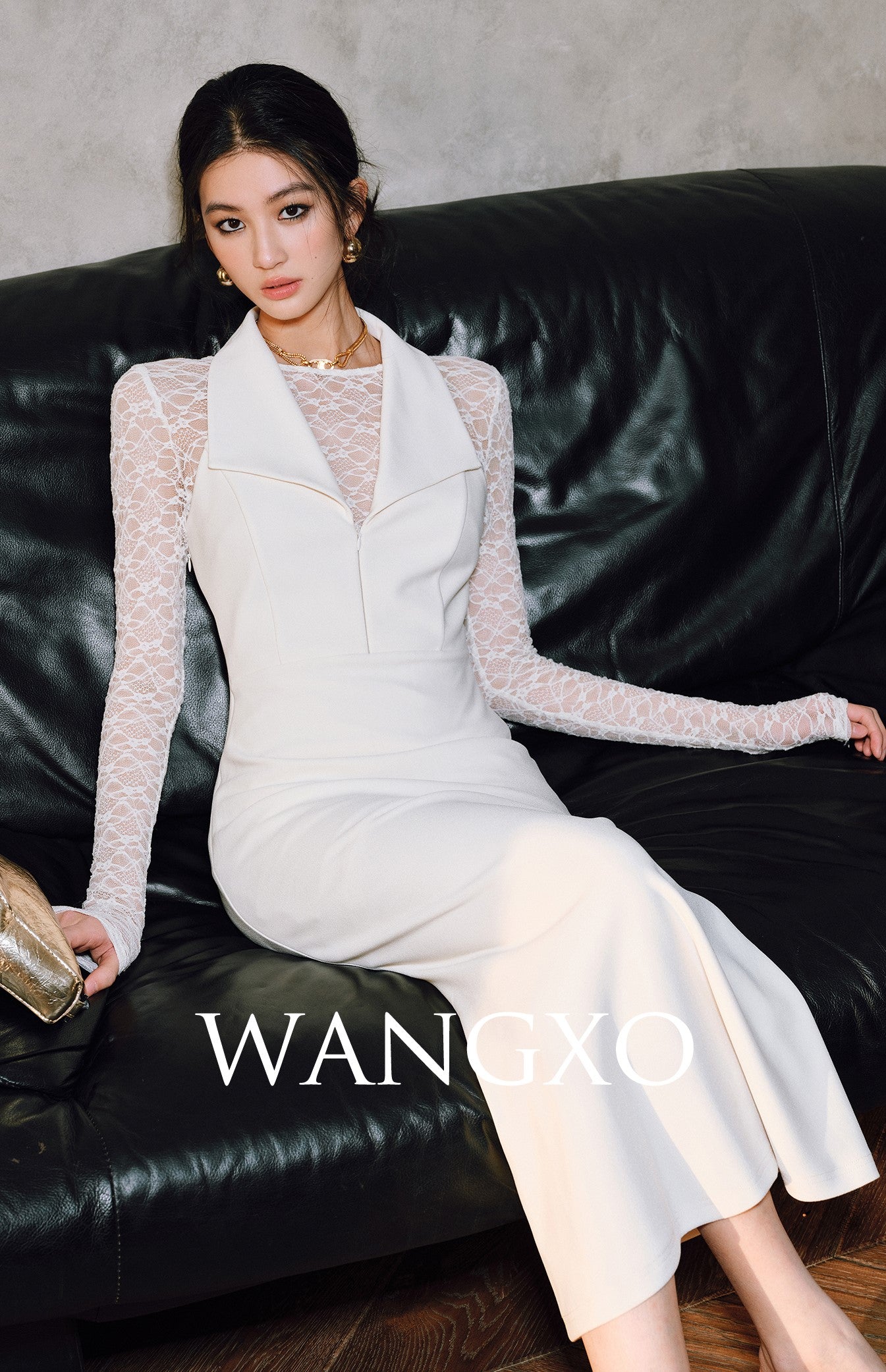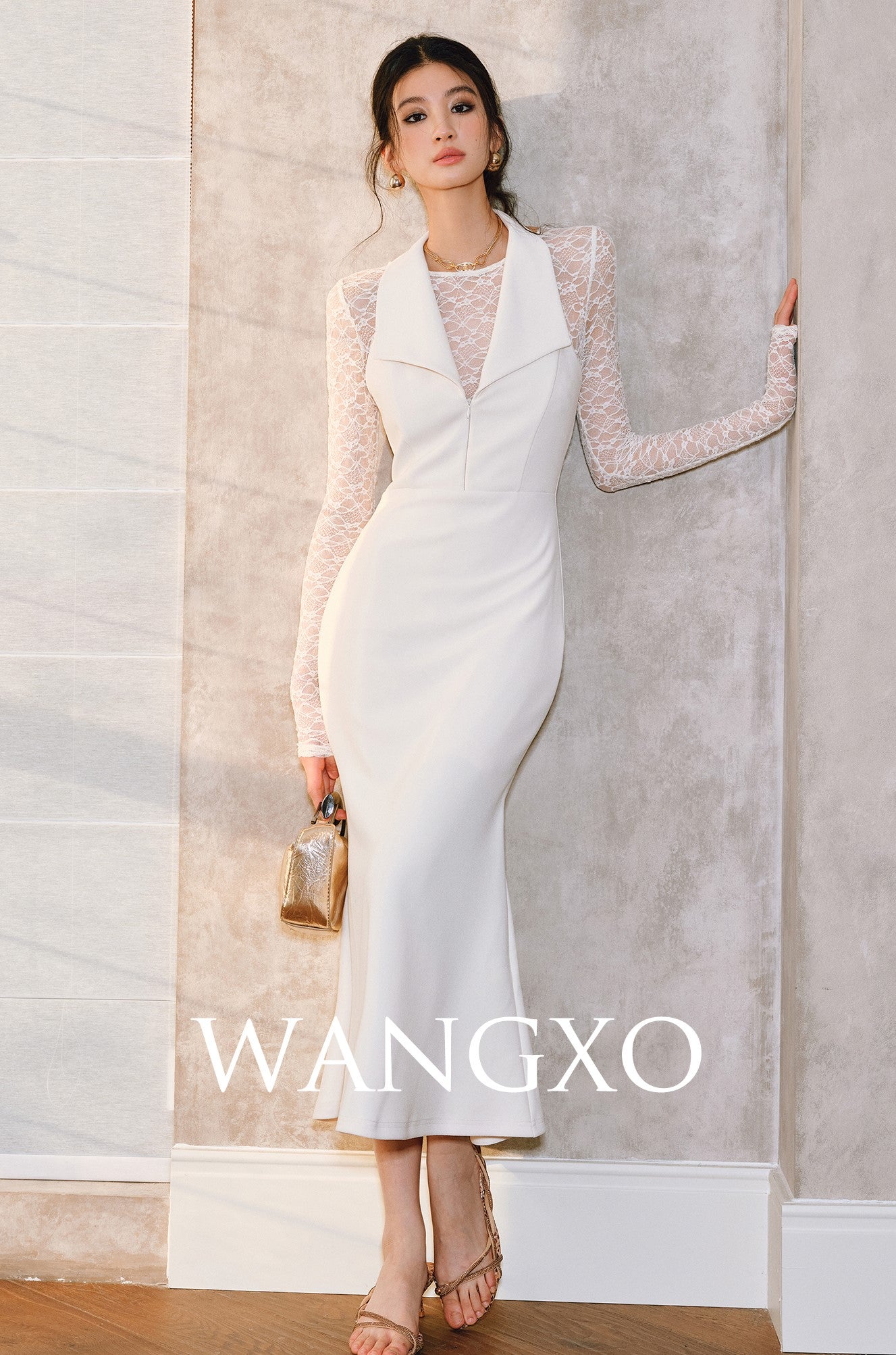 WANGXO | Two-Piece Patchwork Lace Elegant Halterneck Fishtail Dress -LINA.