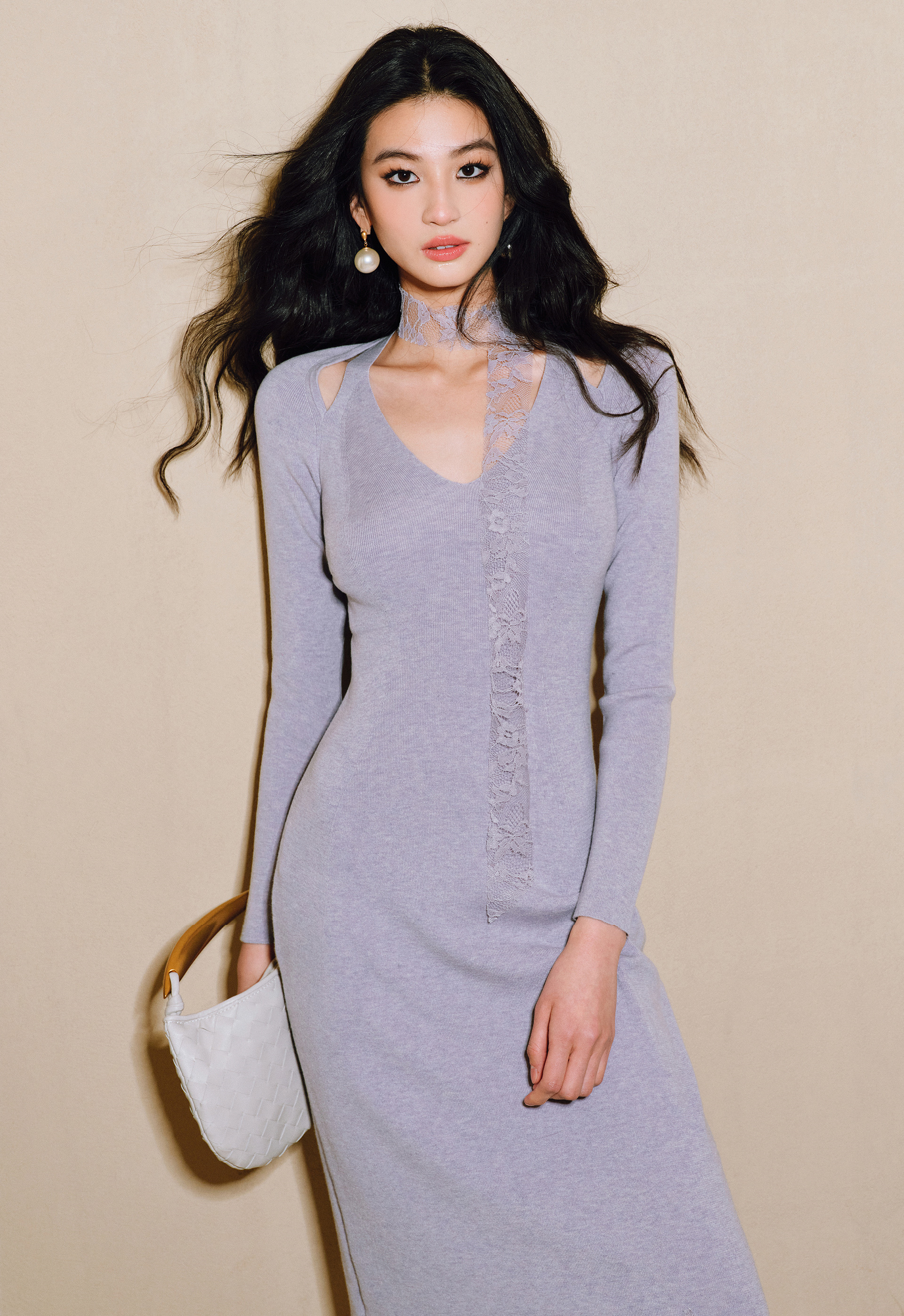 The WANGXO dress features a refined merino wool knit complemented by panelled eyelash lace, offering a sophisticated blend of texture and elegance. Its romantic cut-out neckline adds a delicate, whimsical touch to the slim silhouette, creating a flattering and graceful look. This dress is ideal for those who appreciate intricate detailing paired with timeless style.