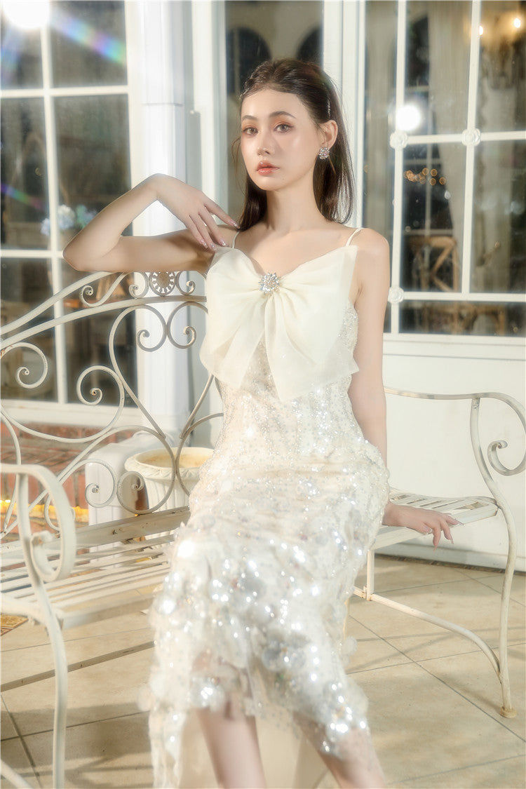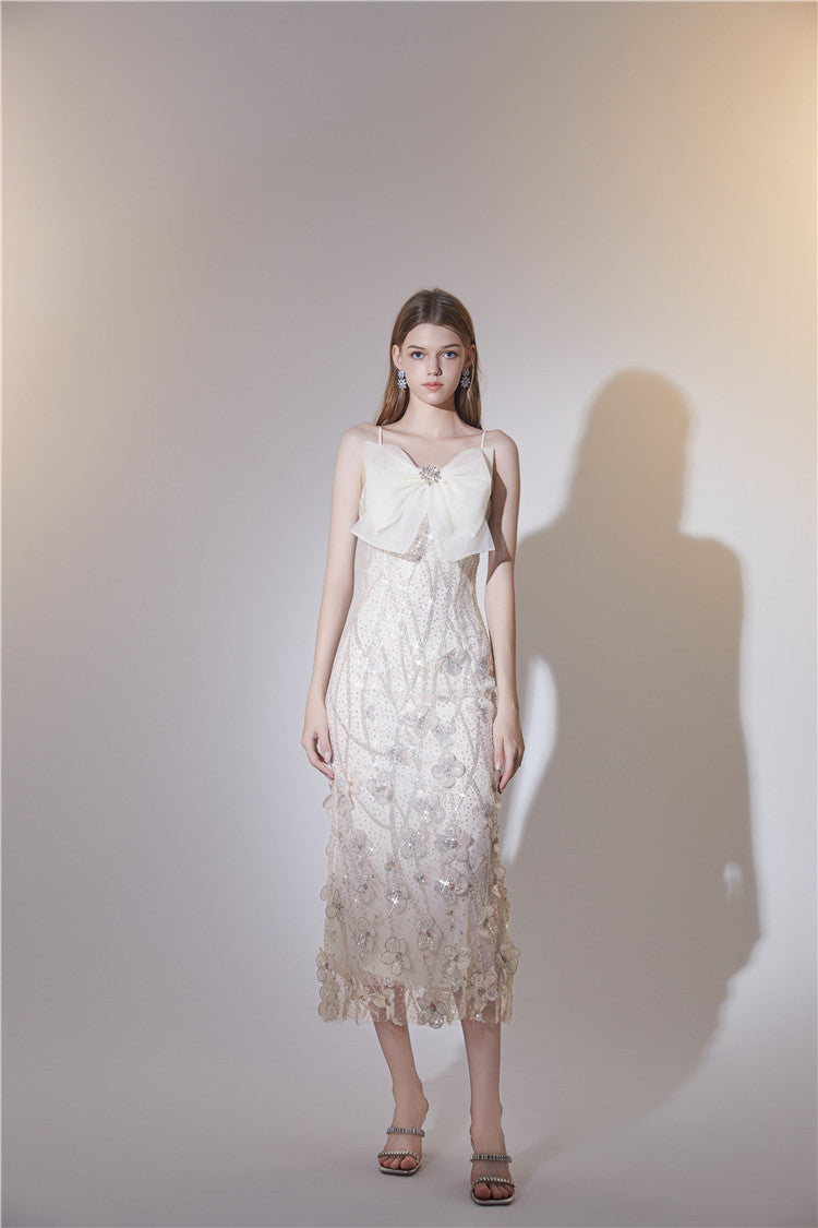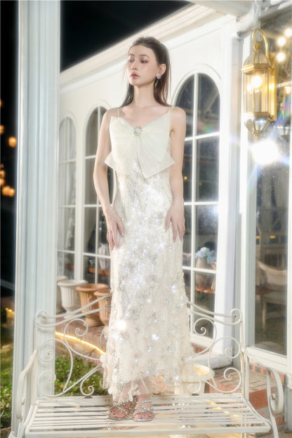 Wardrobes by Chen Cream Sleeveless Flower Long Bow Evening Dress-DONNE