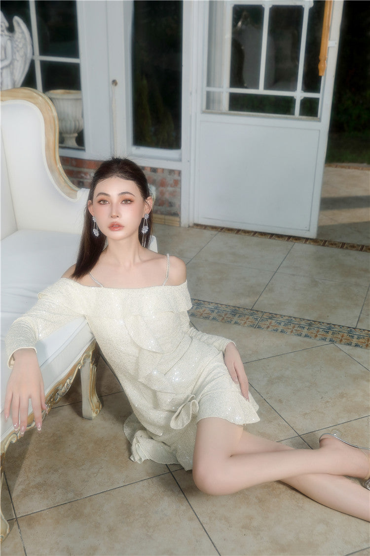 Wardrobes by Chen Elegant Beige Golden Strap Long Sleeve Ruffle Party Dress-TRUDY