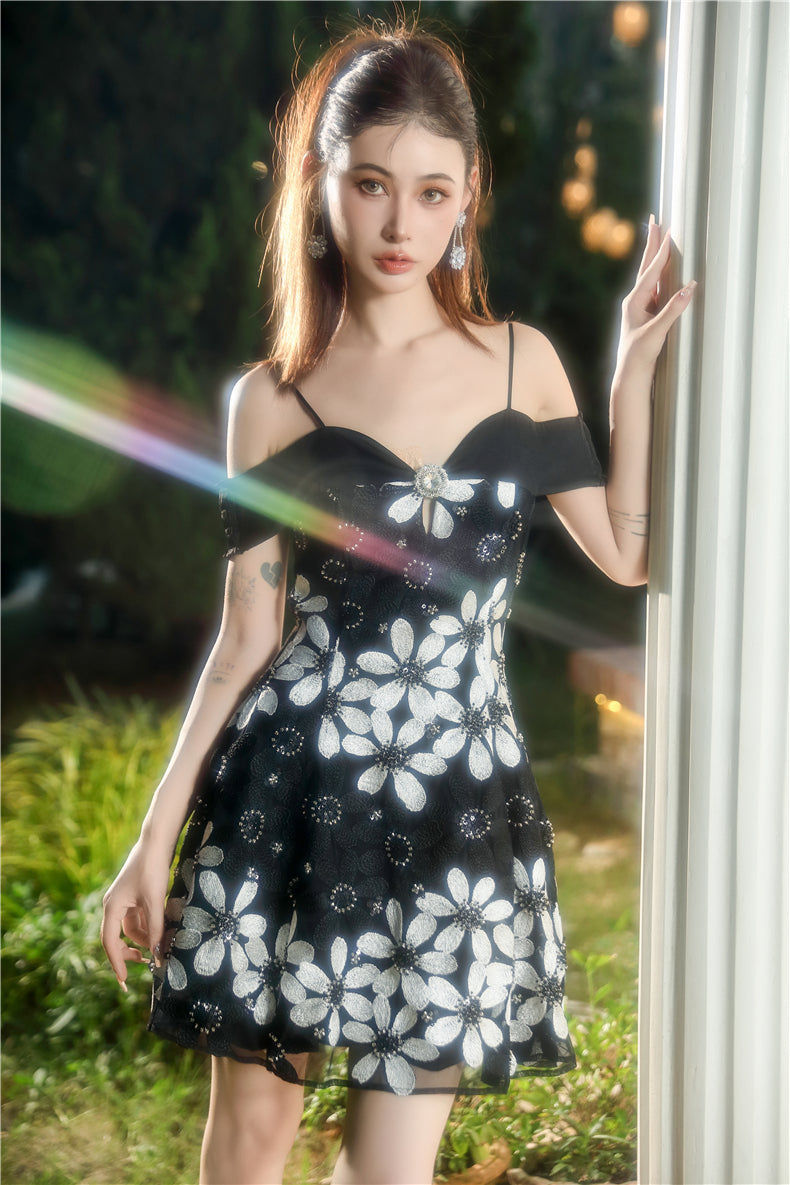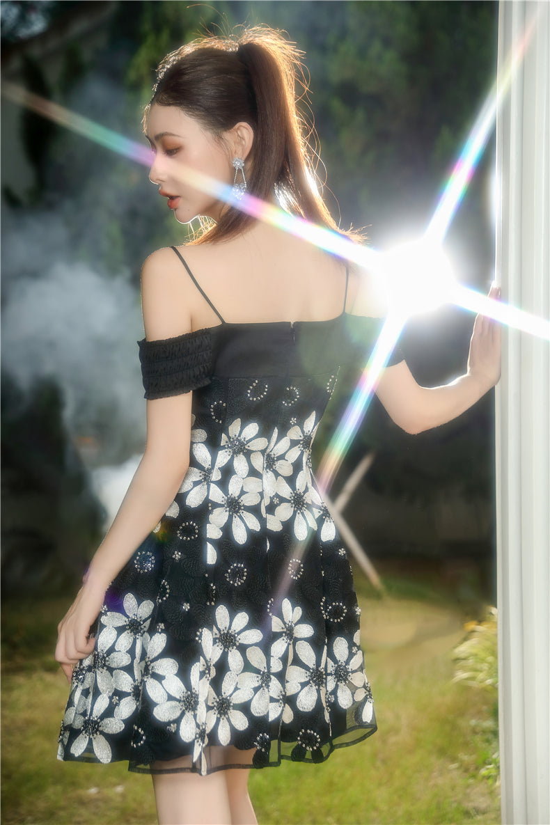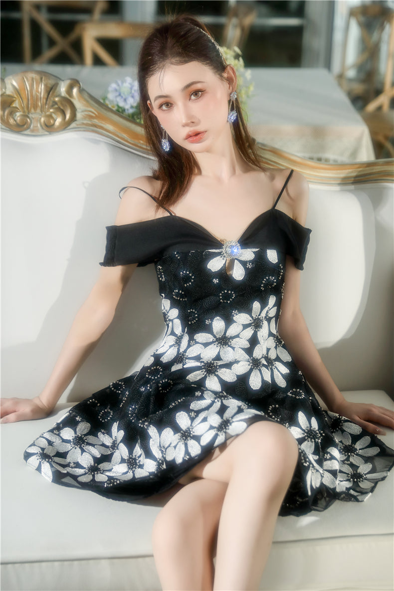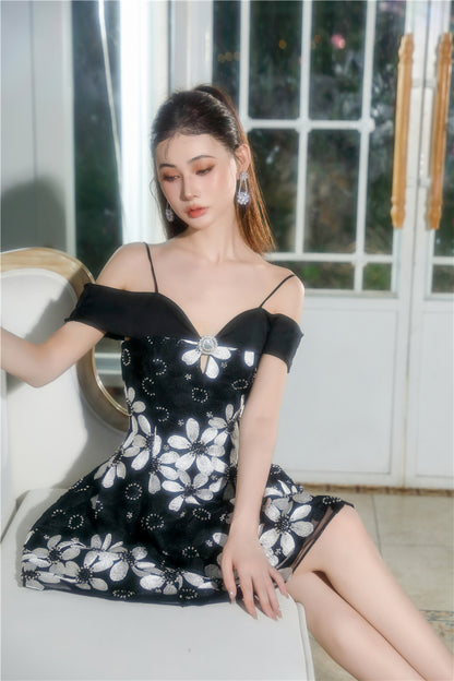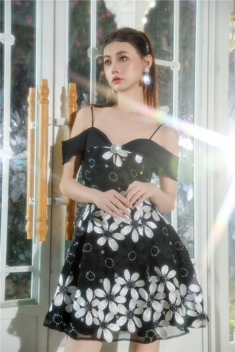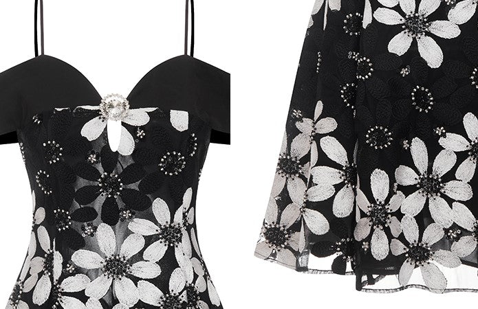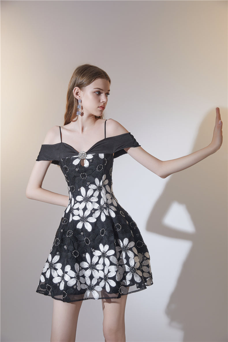 Wardrobes by Chen Elegant Black and White Off Shoulder Flower Dress-YEMMY