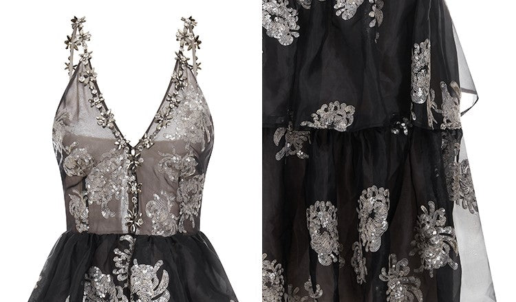 Wardrobes by Chen Elegant Black V-Neck Sleeveless Sequin Diamond Dress-PA
