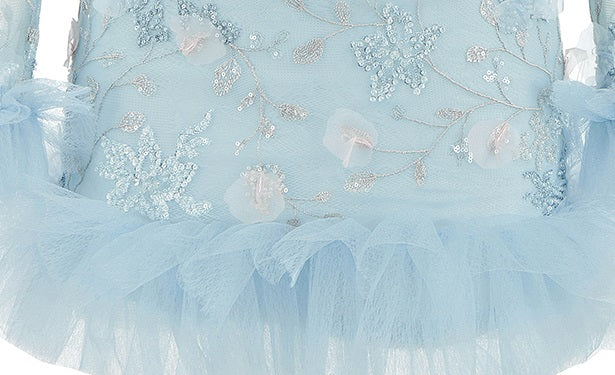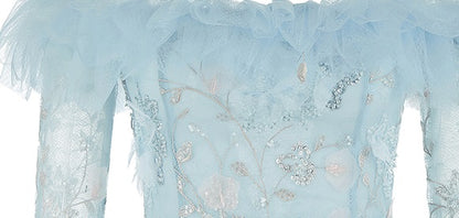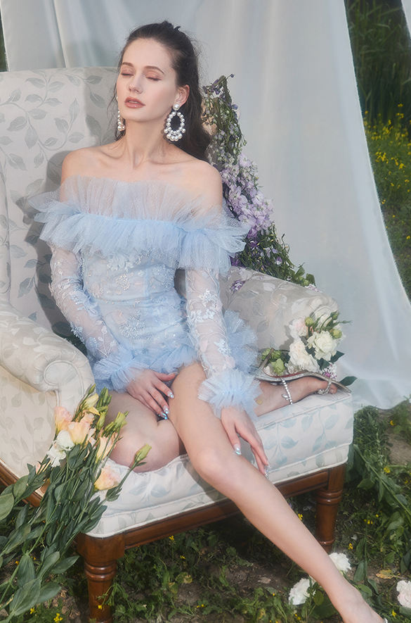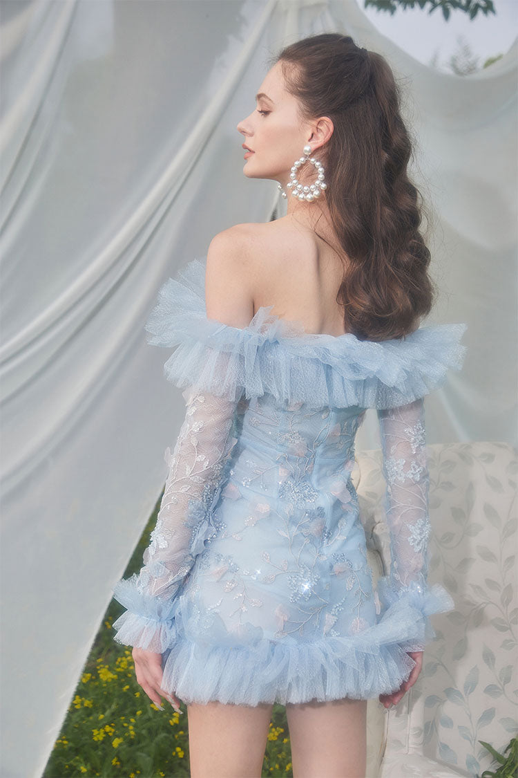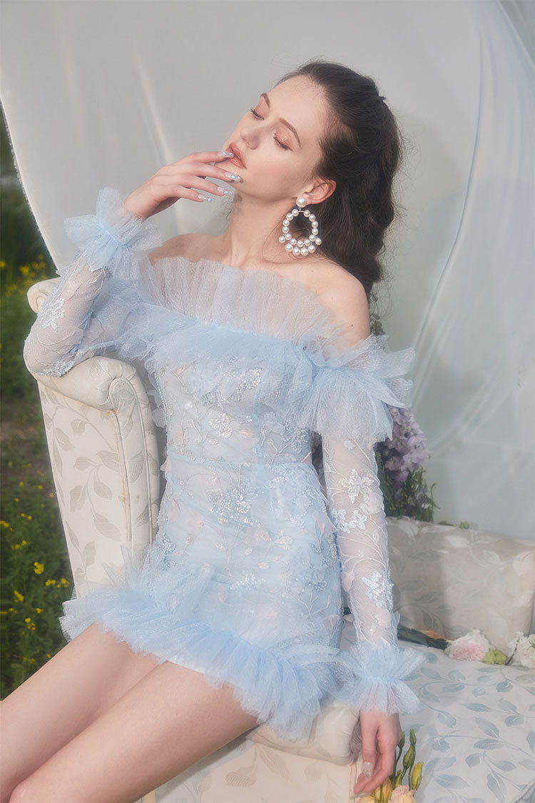 Wardrobes by Chen Elegant Blue Off Shoulder Frills Long Sleeve Short Dress-Yolly