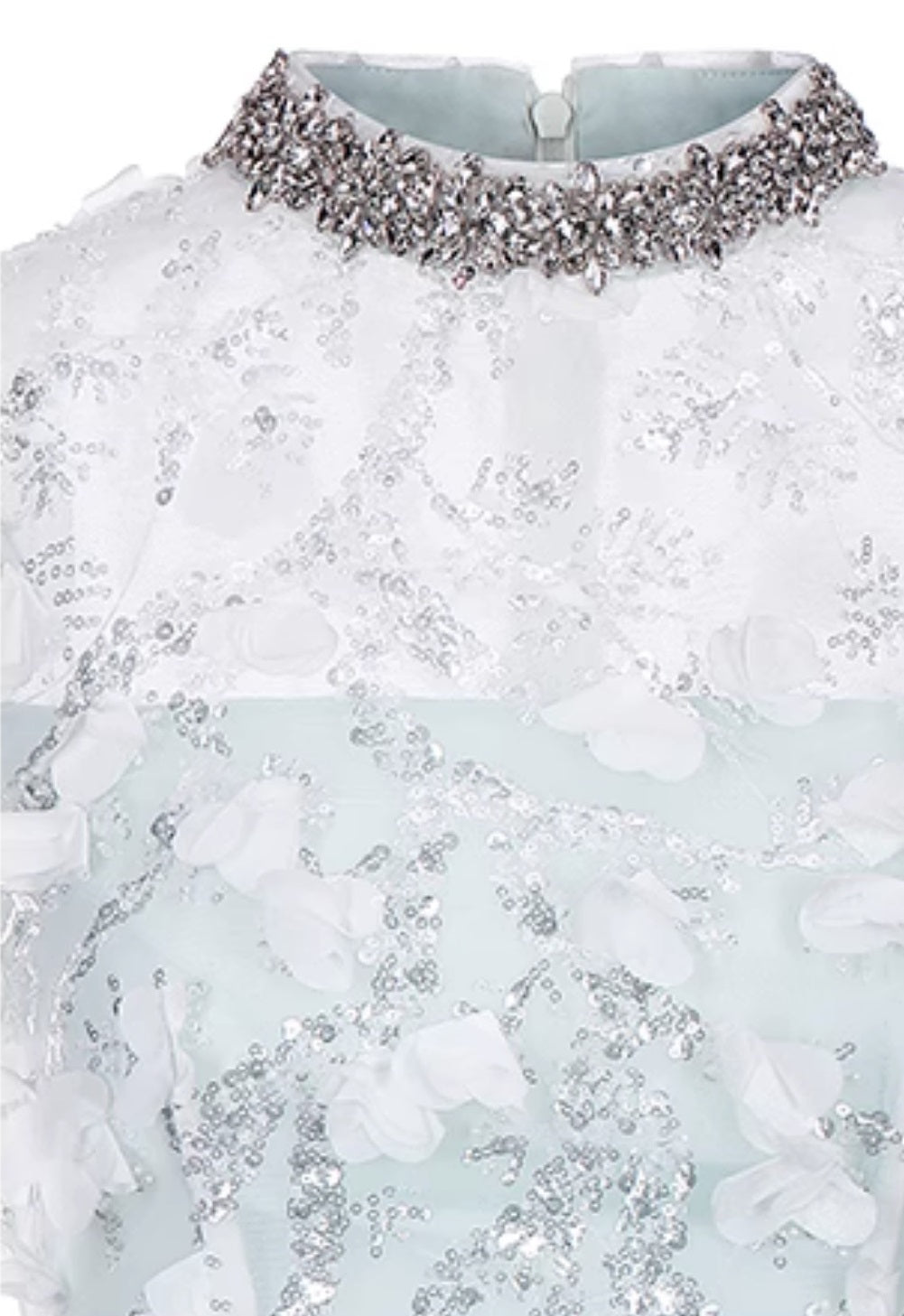 Enhance your style with the class and elegance of Wardrobes by Chen's Elegant Blue Dress. The sleeveless design and intricate flower and feather details, adorned with a diamond chain, make this dress a statement piece. Elevate your wardrobe with this luxurious and exclusive dress.