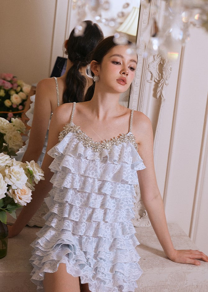 Wardrobes by Chen Elegant Blue white Lace Cake layered ruffle bridal Dress-Tessa