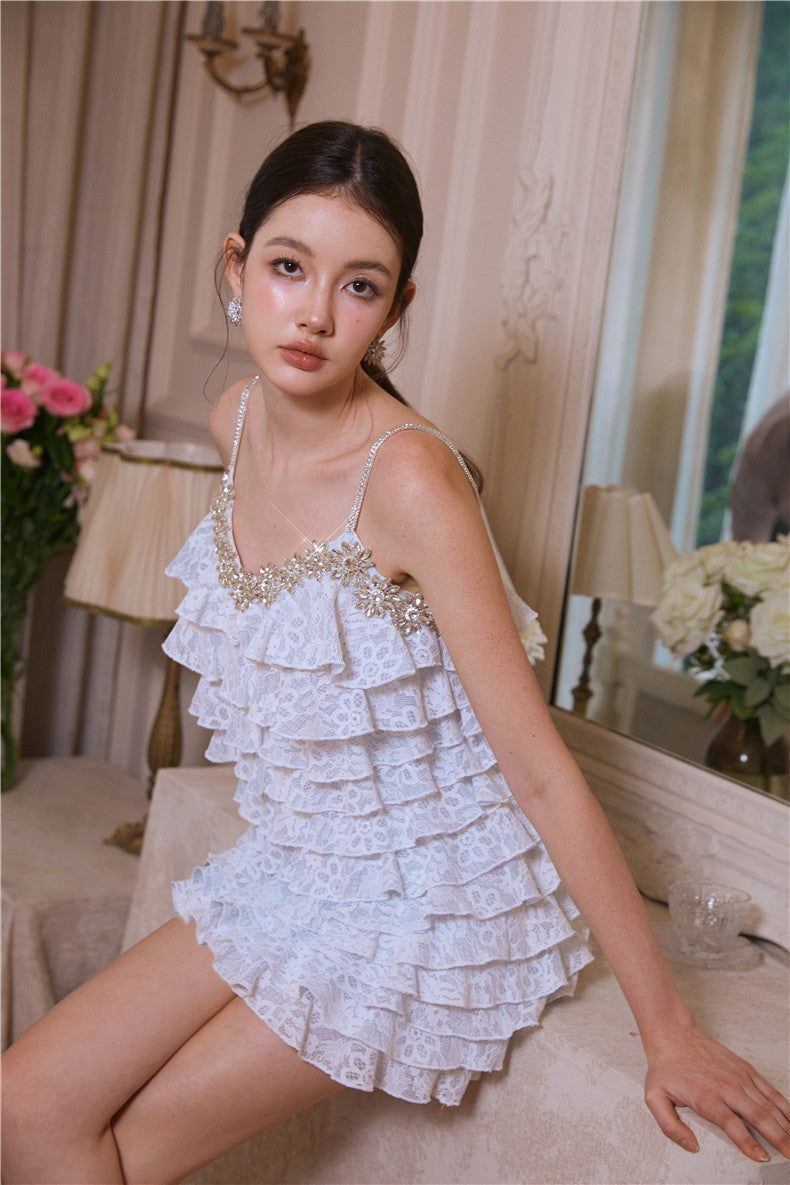 Indulge in the ultimate in luxury fashion with the Wardrobes by Chen Elegant Blue & White Diamond Trim Lace Cake Slip Dress-Tessa. This elegant and sexy dress features intricate lace detailing accented by stunning diamond trim, making it the perfect statement piece for any occasion. Elevate your wardrobe and stand out in style with Tessa.