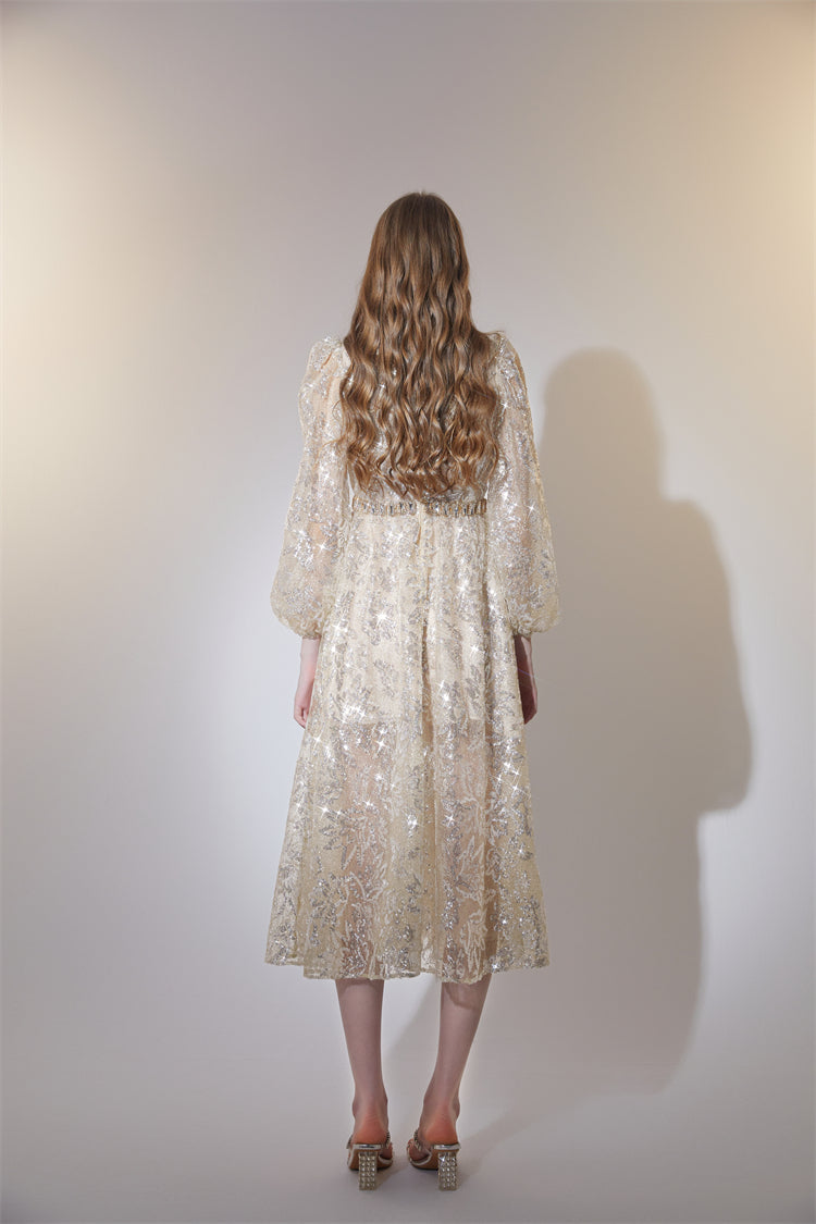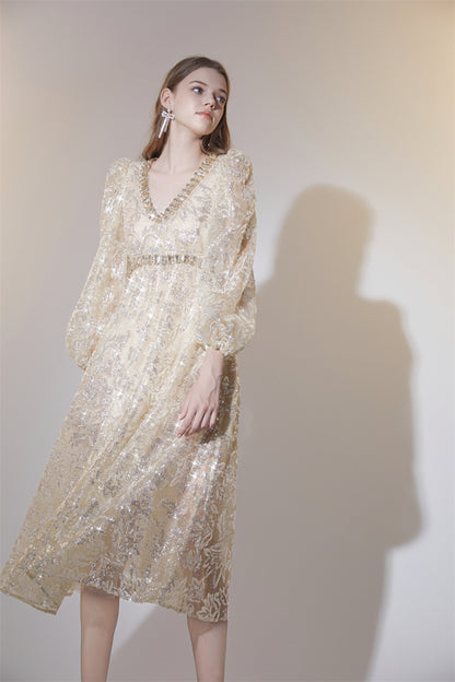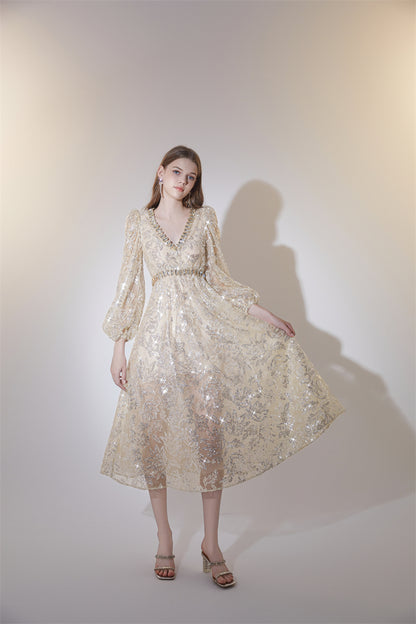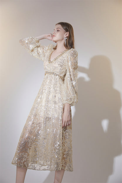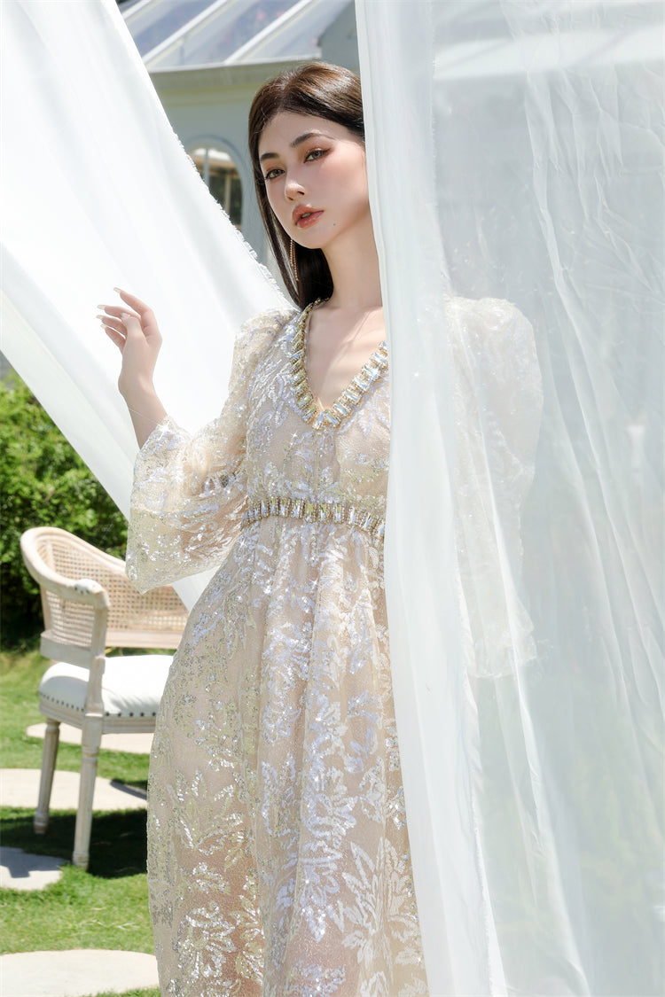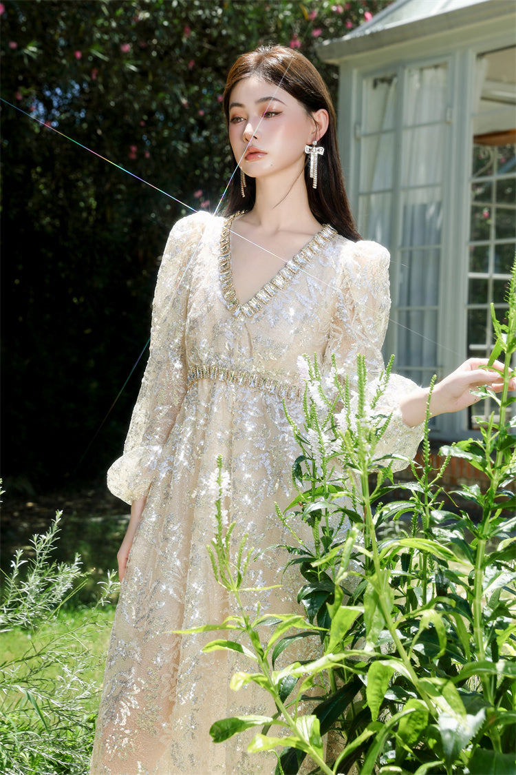 Wardrobes by Chen Elegant Diamond V-Neck Long Sleeve Long Dress- NORAH