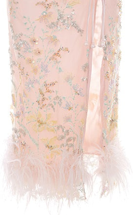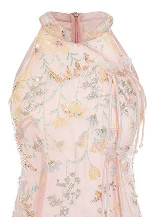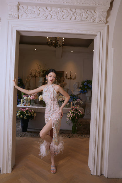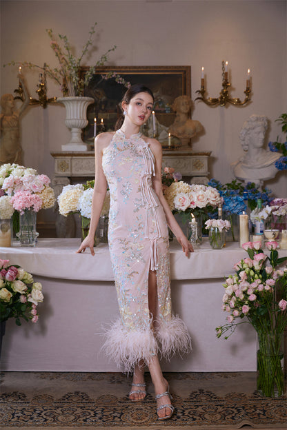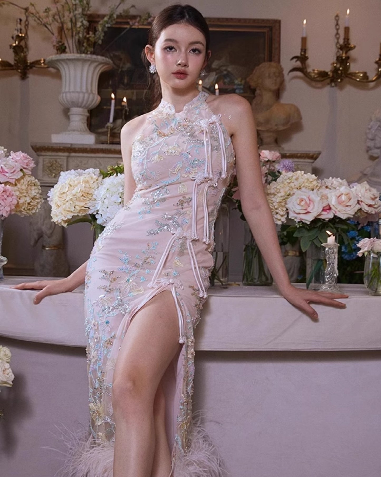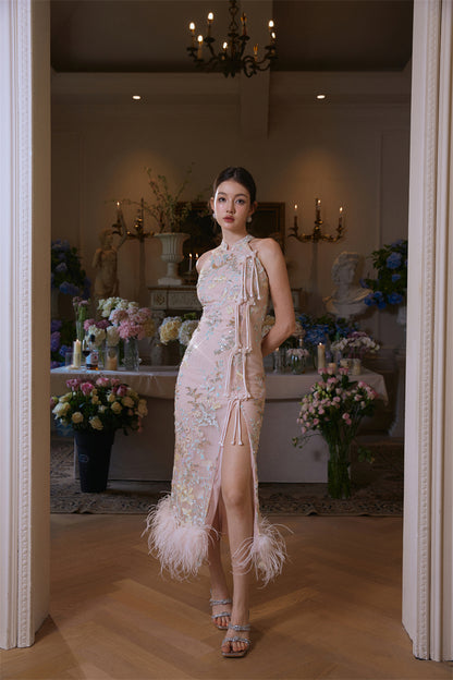 Wardrobes by Chen Elegant Feather Embroidered Bead Halter Dress-Cole